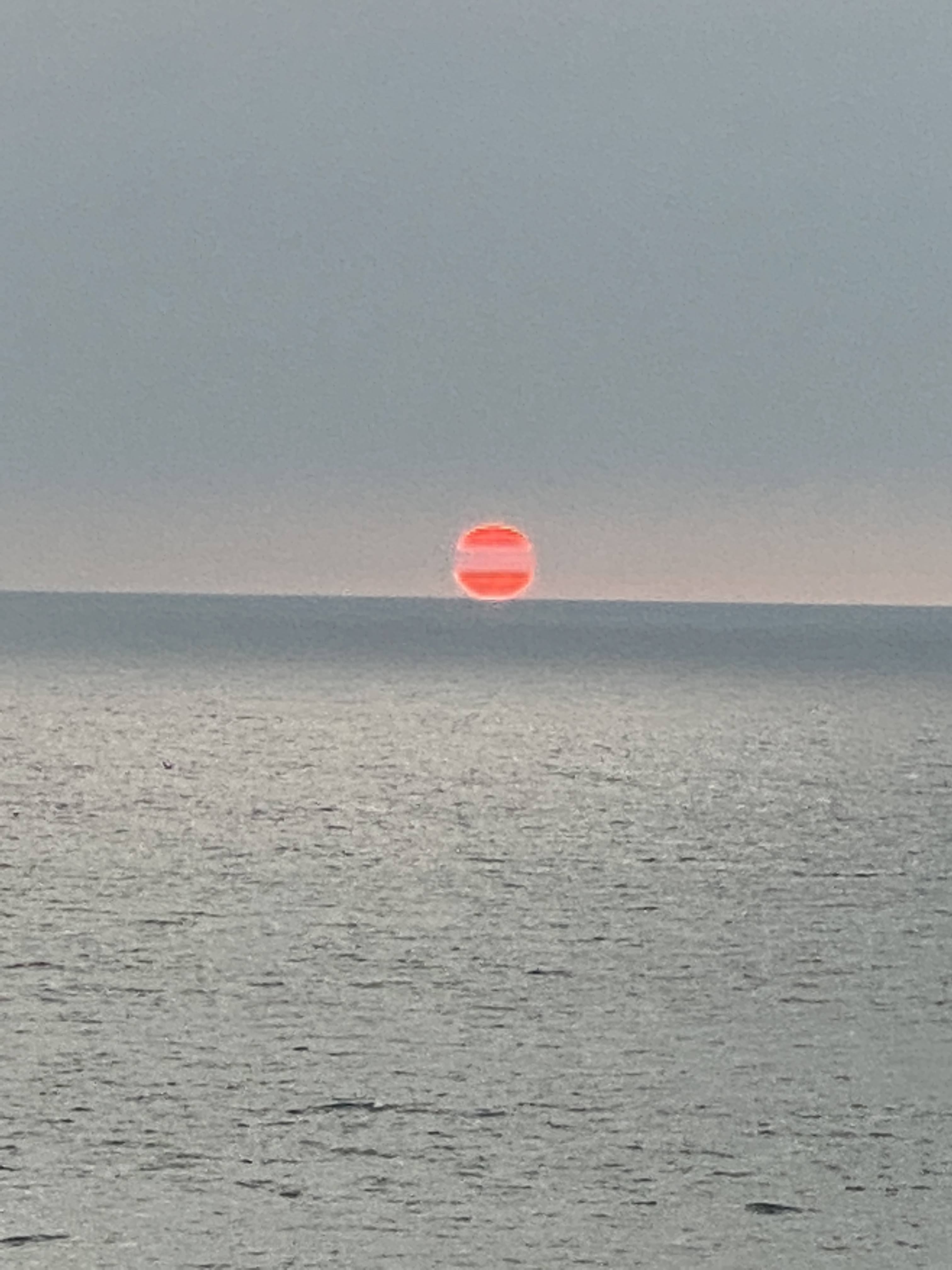 The sky got really cloudy just before sunset.  The sun peaked under the clouds just before setting and was that strange red color.  The shape of it made it look like a hamburger to me.