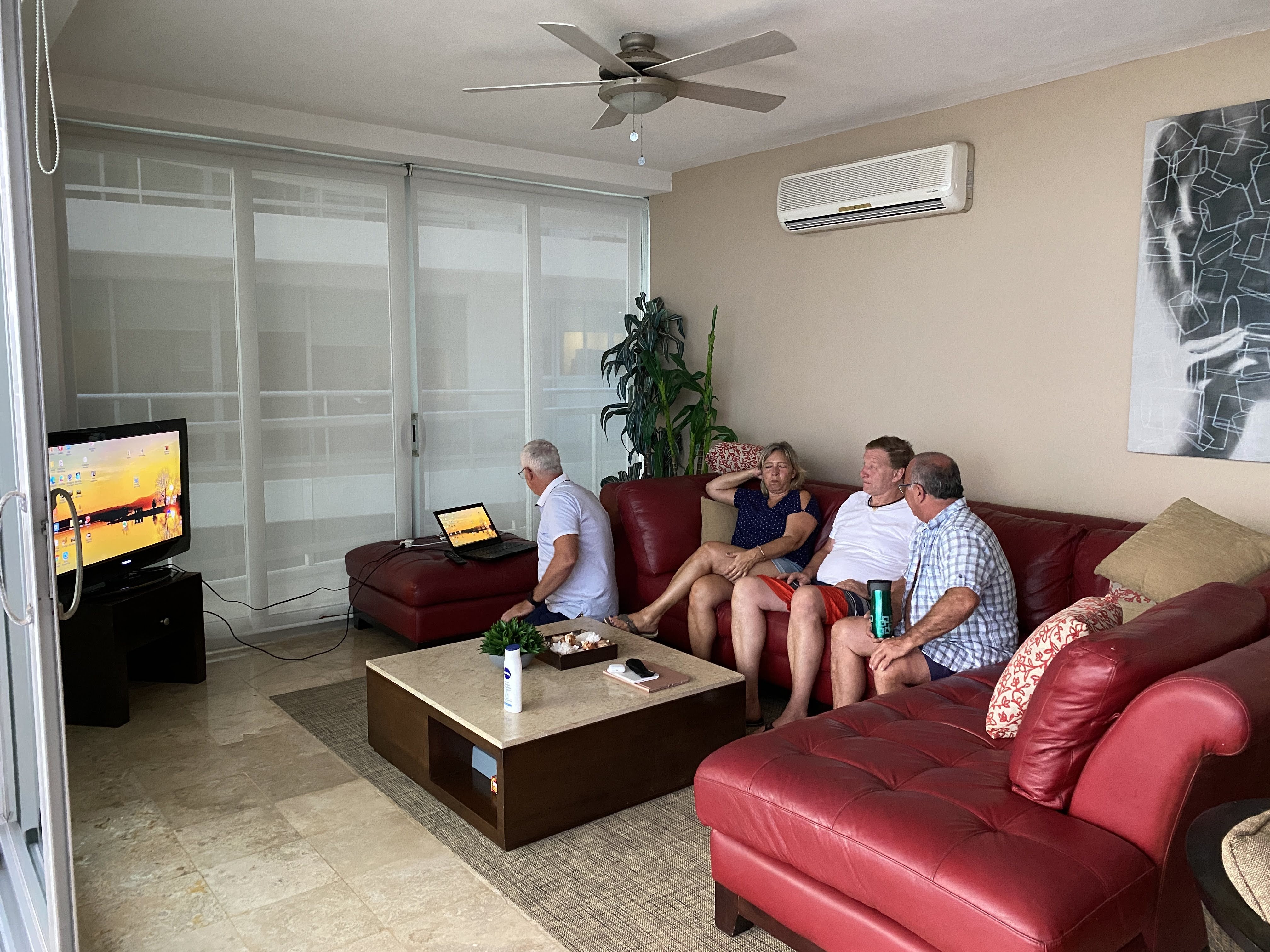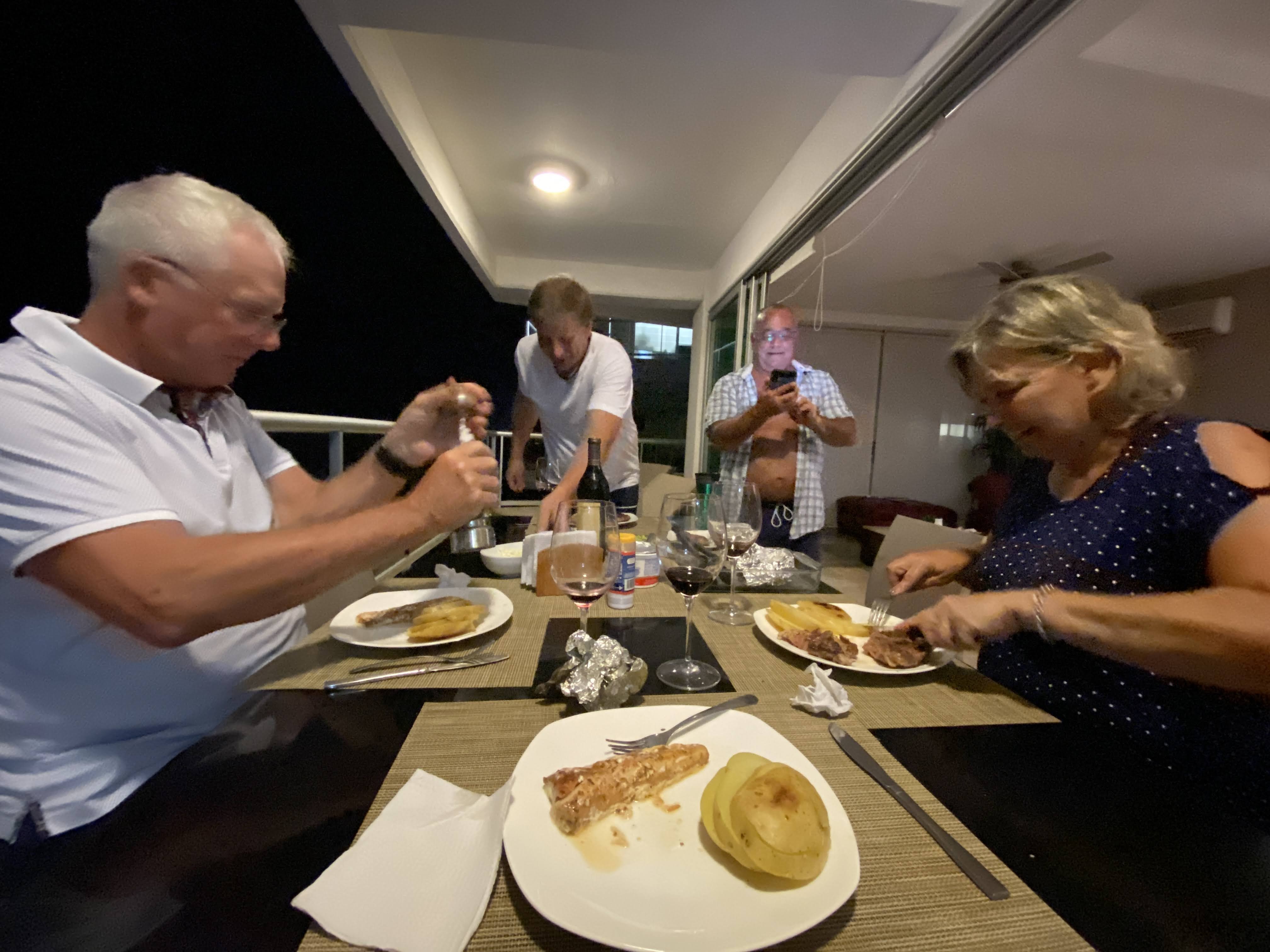 We went to Mario and josée for dinner. Pogo showed a few drone videos. We brought guacamole and shrimp cocktail and had steak, fish and baked potatoes and shared some great wines. Another really pleasant evening with friends.