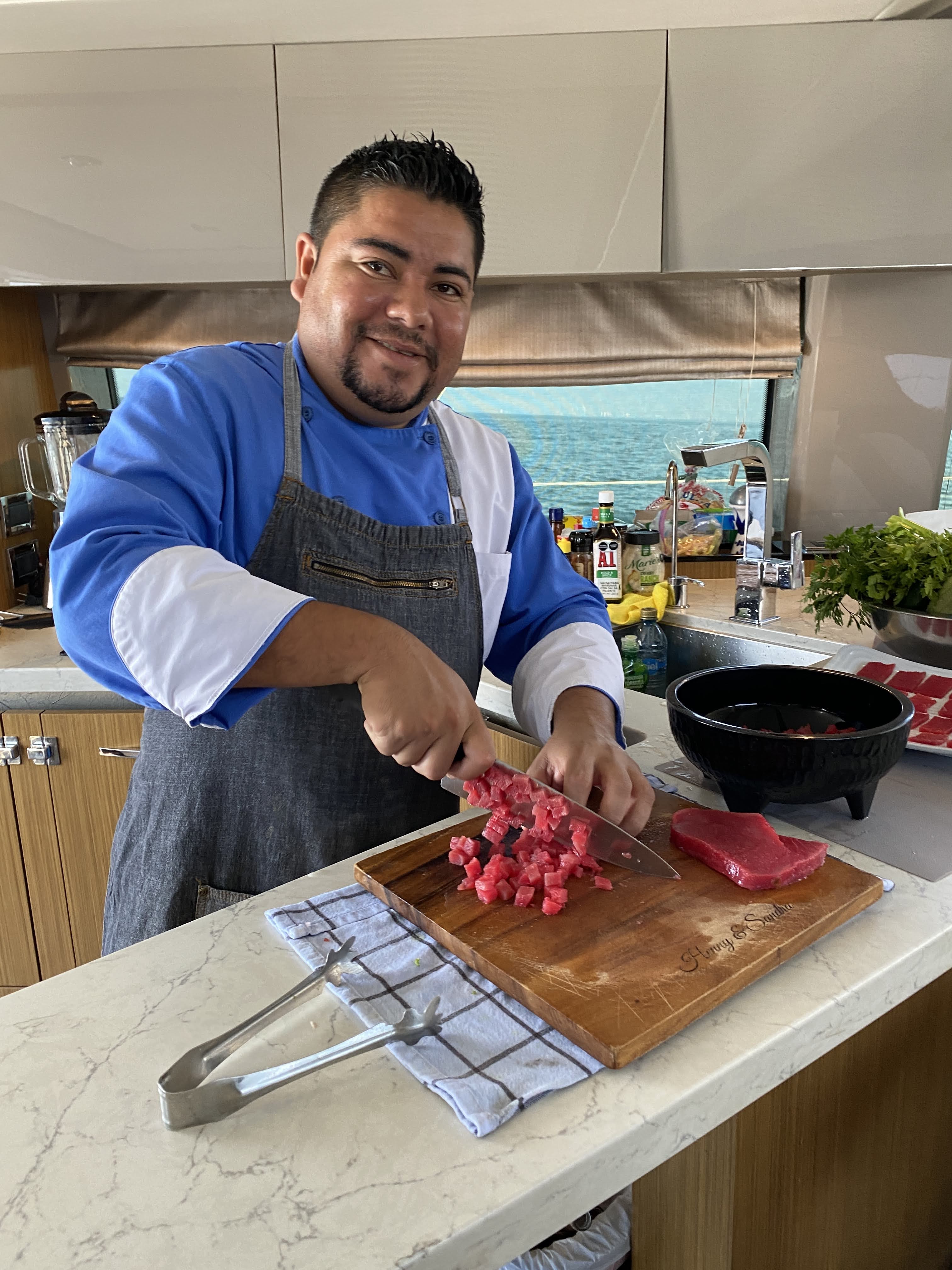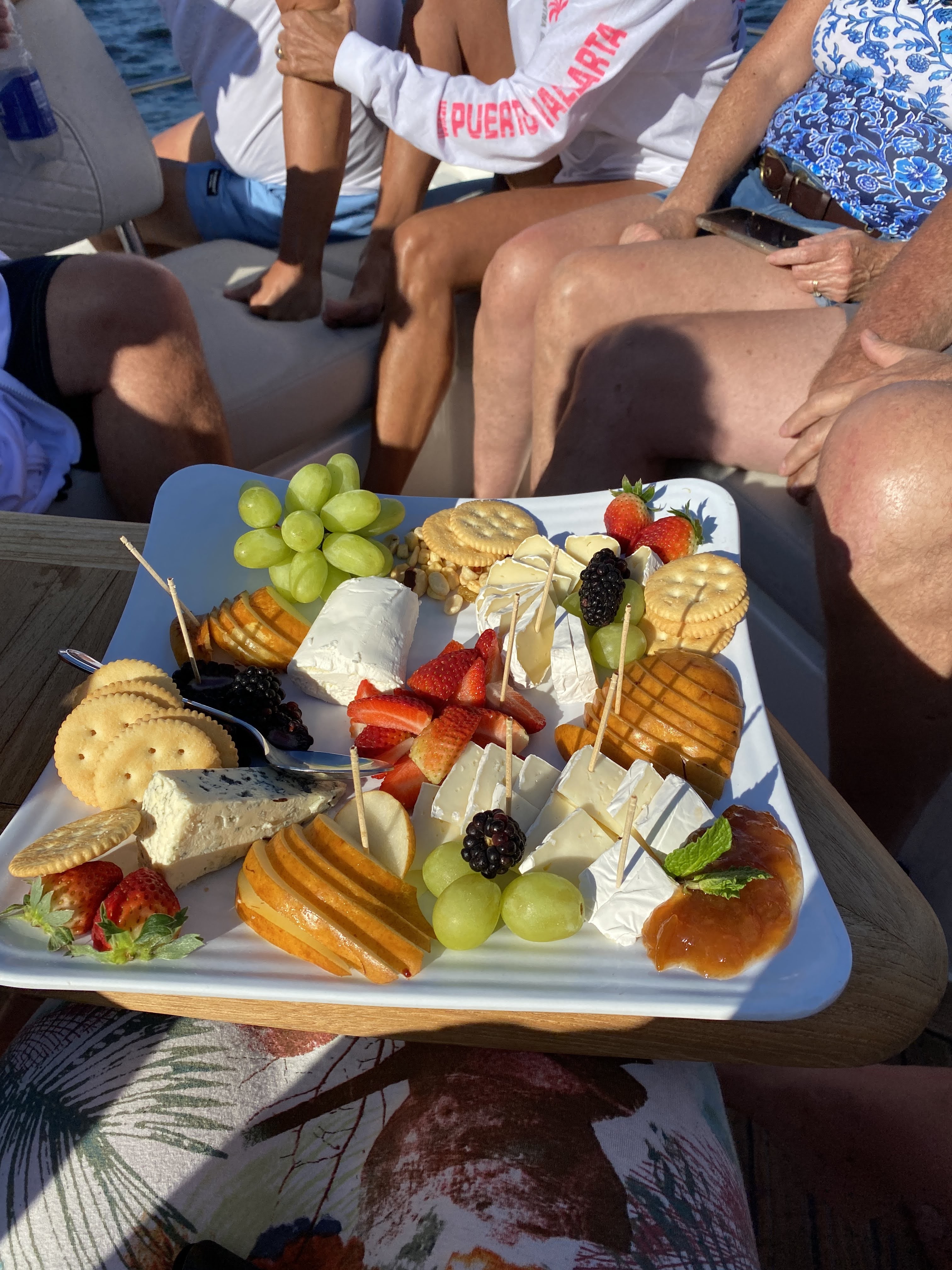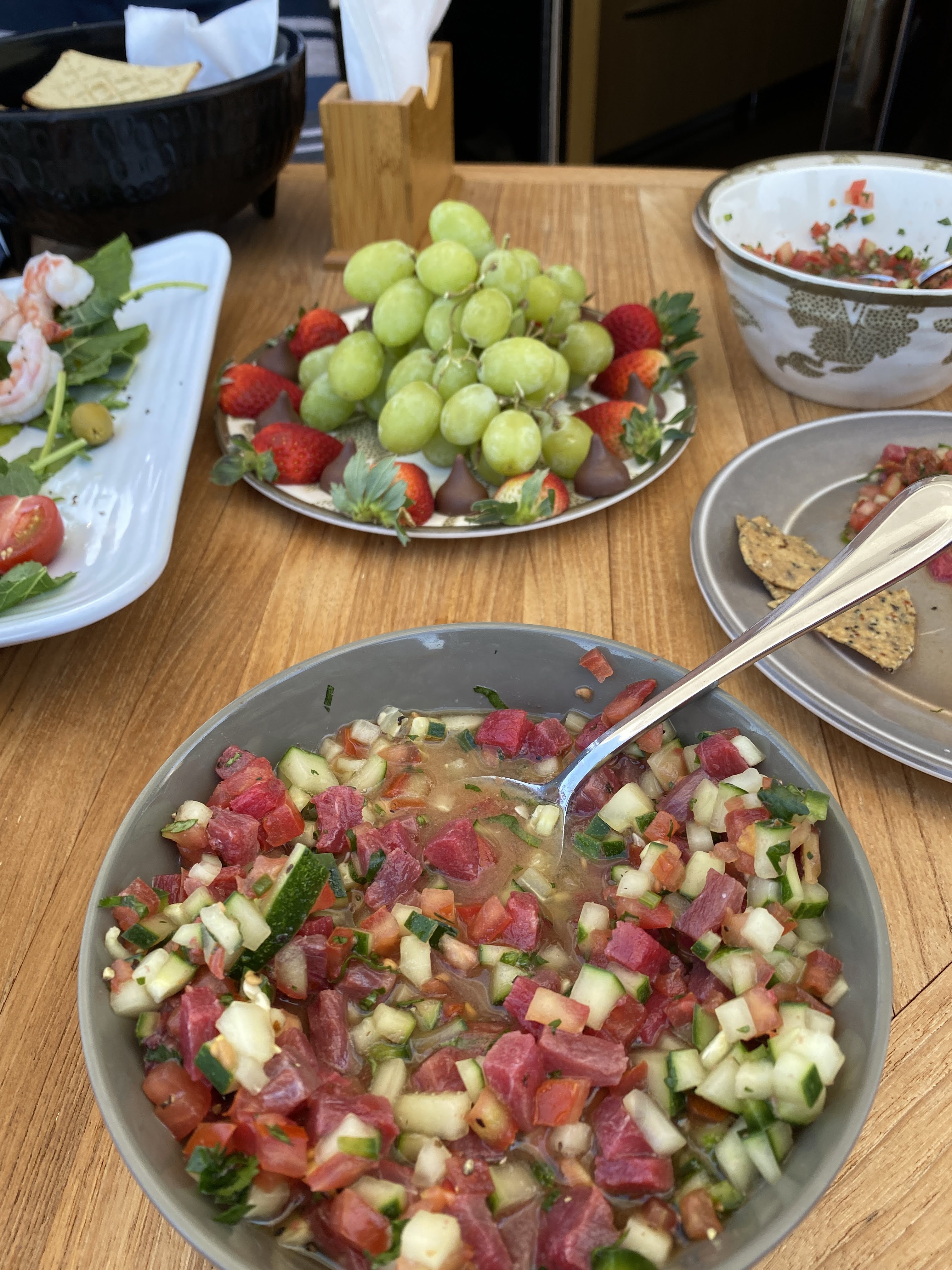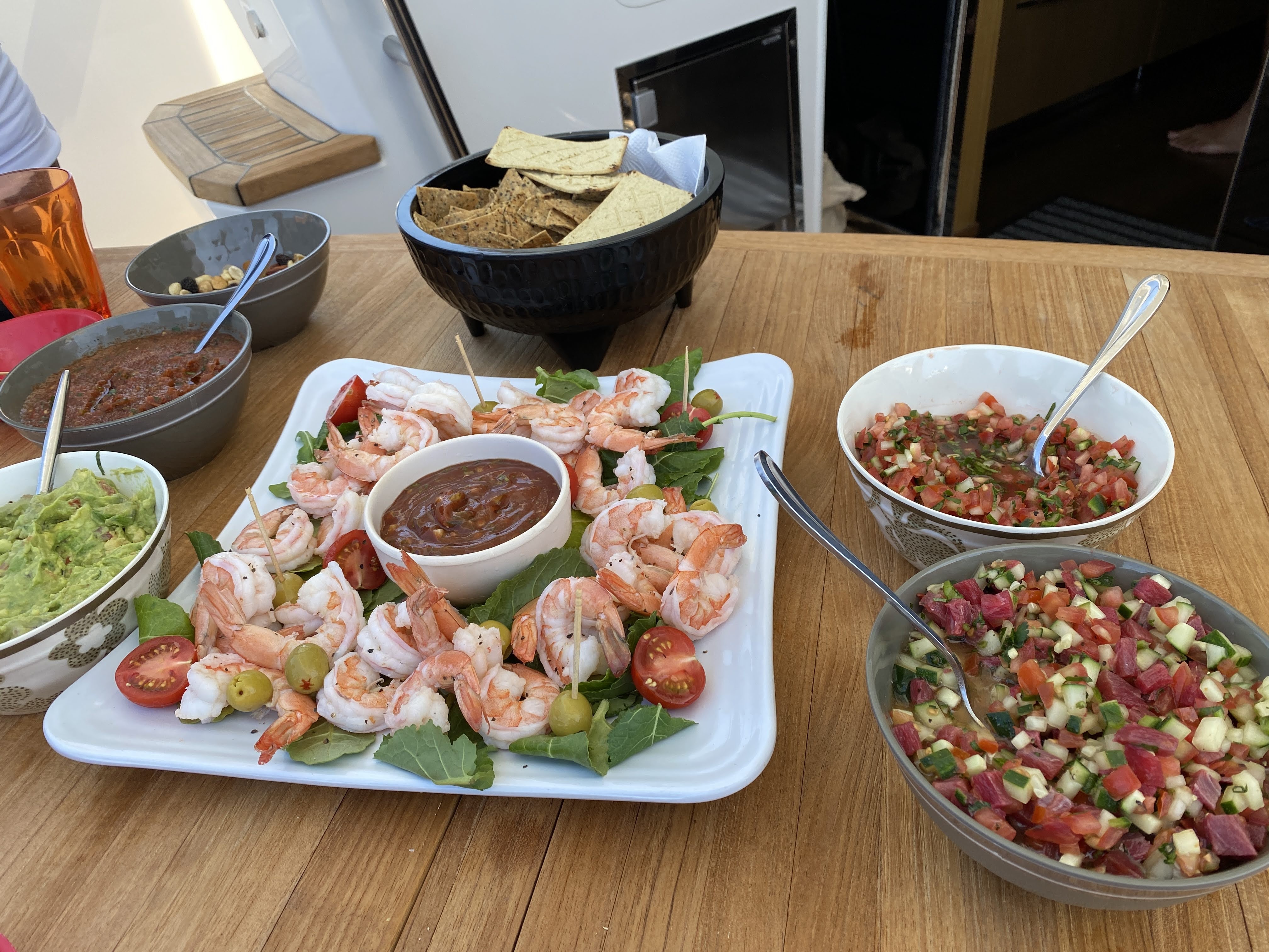 We had hired a cook and we had great food non-stop: salsa, pico de gallo, tuna tartare, veggie platters, olives, shrimp cocktail, fruits and cheese platters, chicken and shrimp skewers. Our waiter was always there checking on refreshing our drinks: water, mojitos, margaritas, wine and beers.