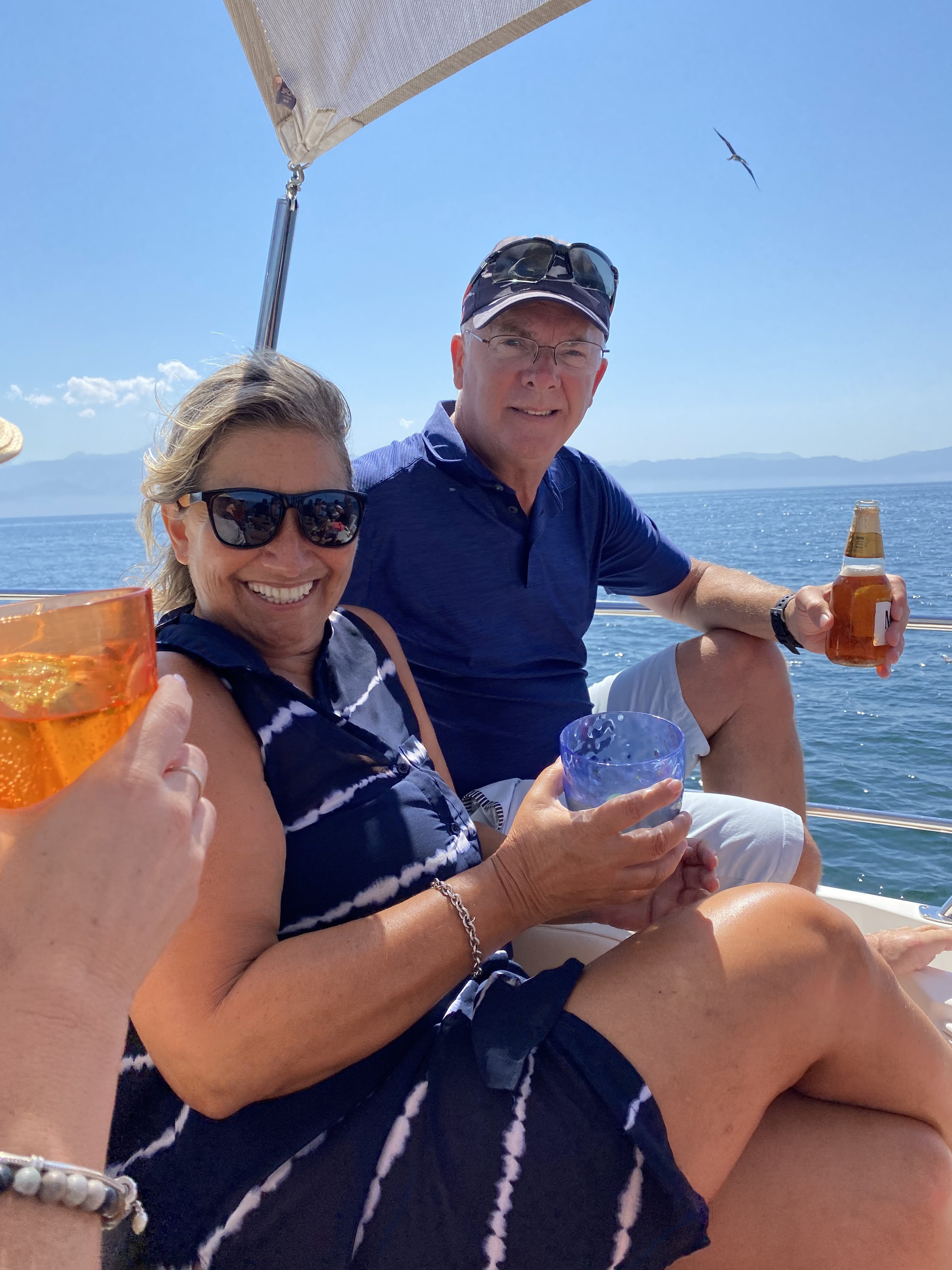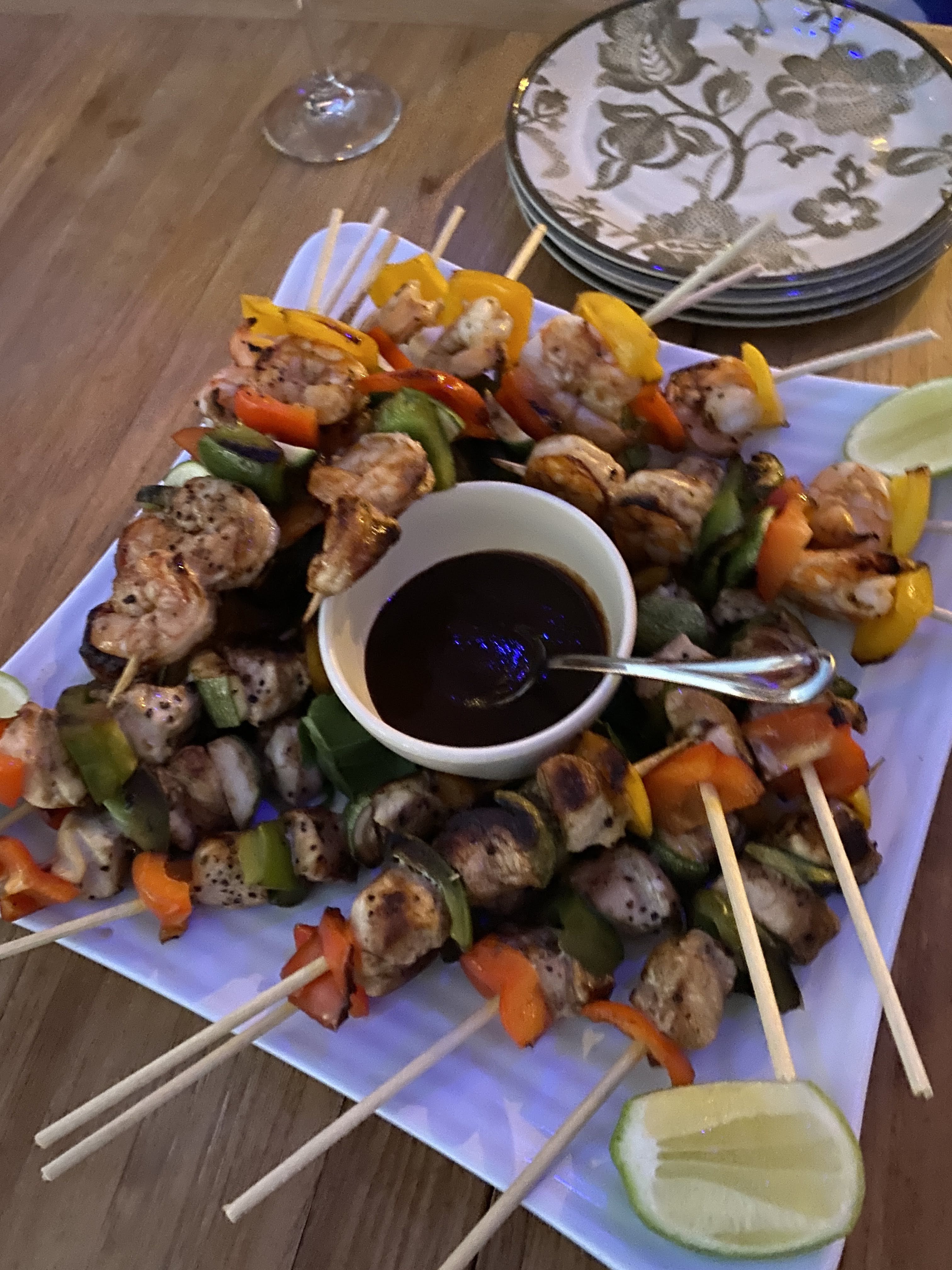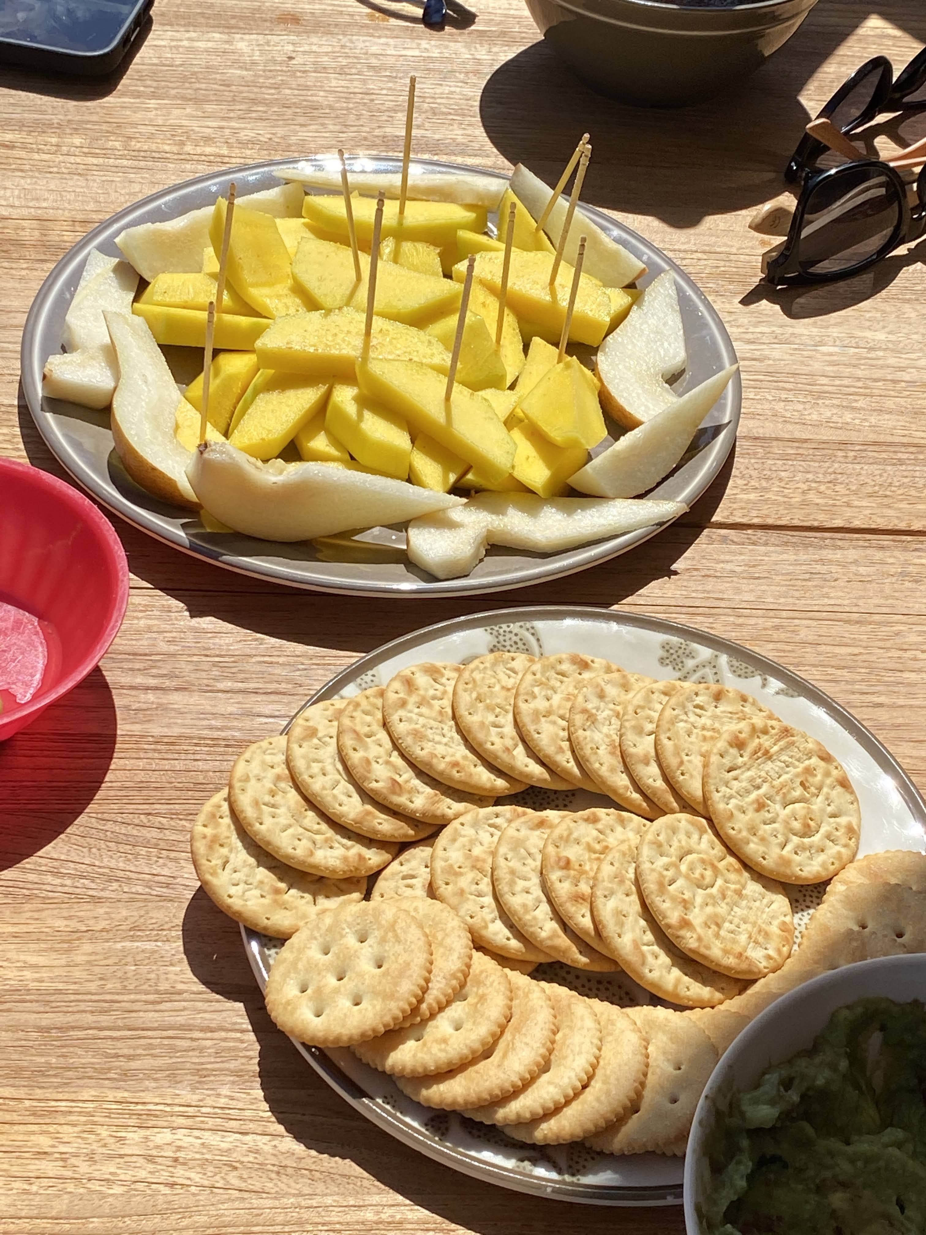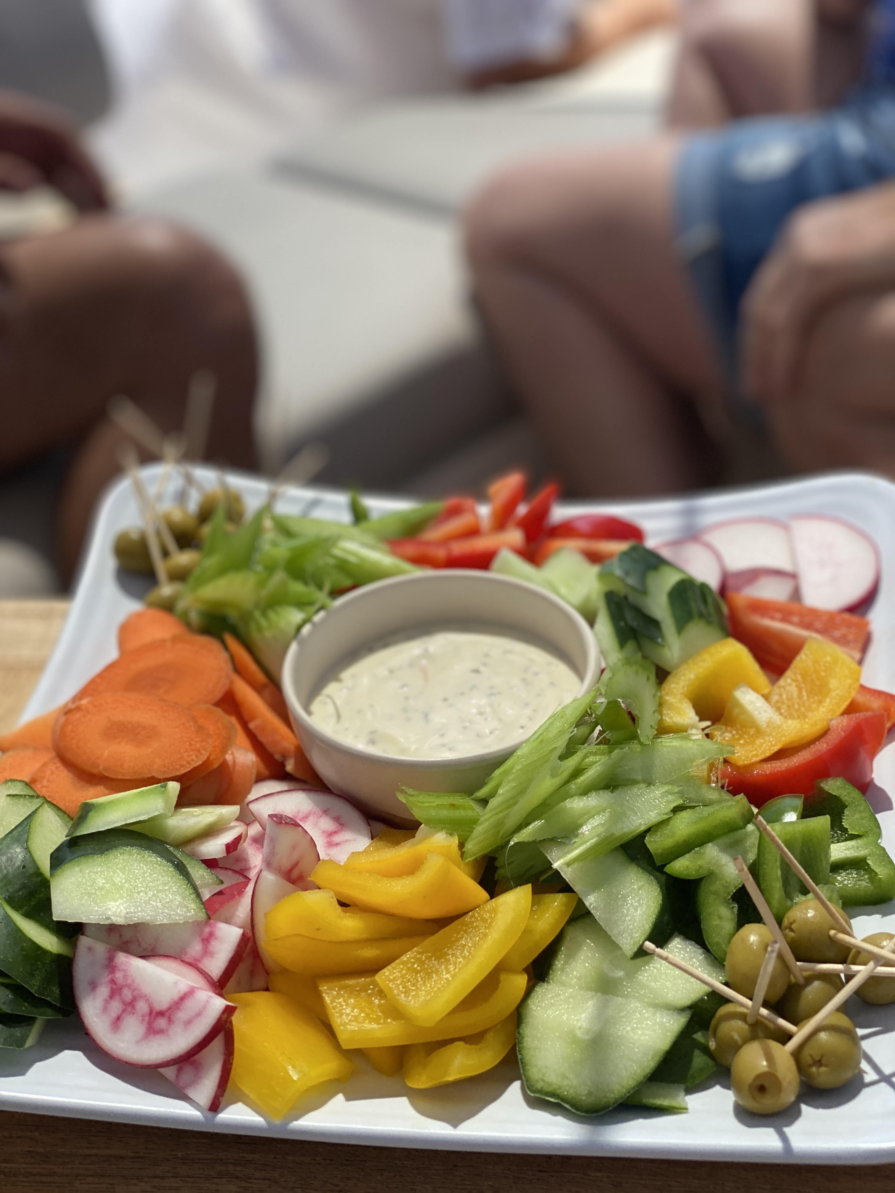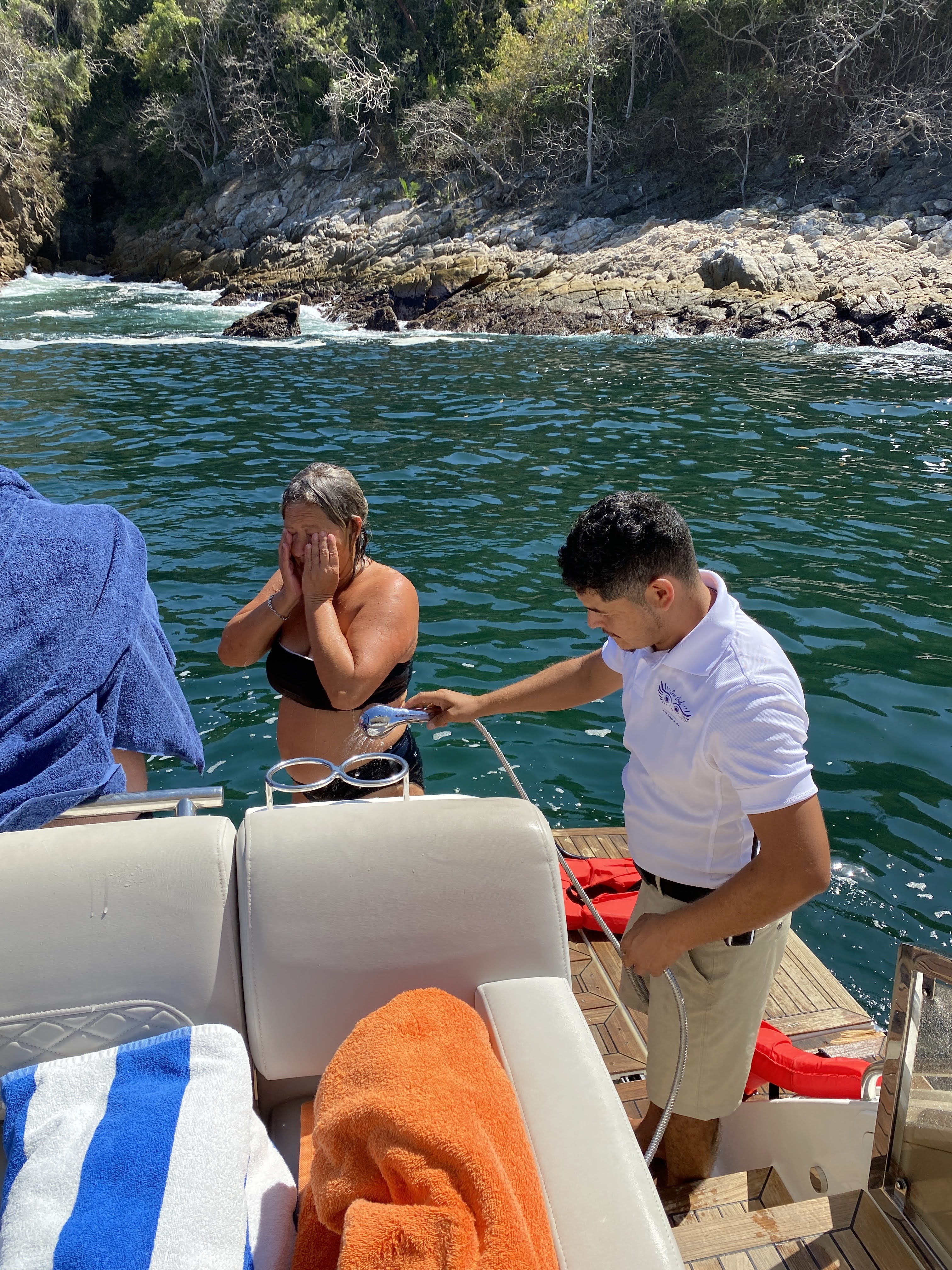 We had hired a cook and we had great food non-stop: salsa, pico de gallo, tuna tartare, veggie platters, olives, shrimp cocktail, fruits and cheese platters, chicken and shrimp skewers. Our waiter was always there checking on refreshing our drinks: water, mojitos, margaritas, wine and beers.