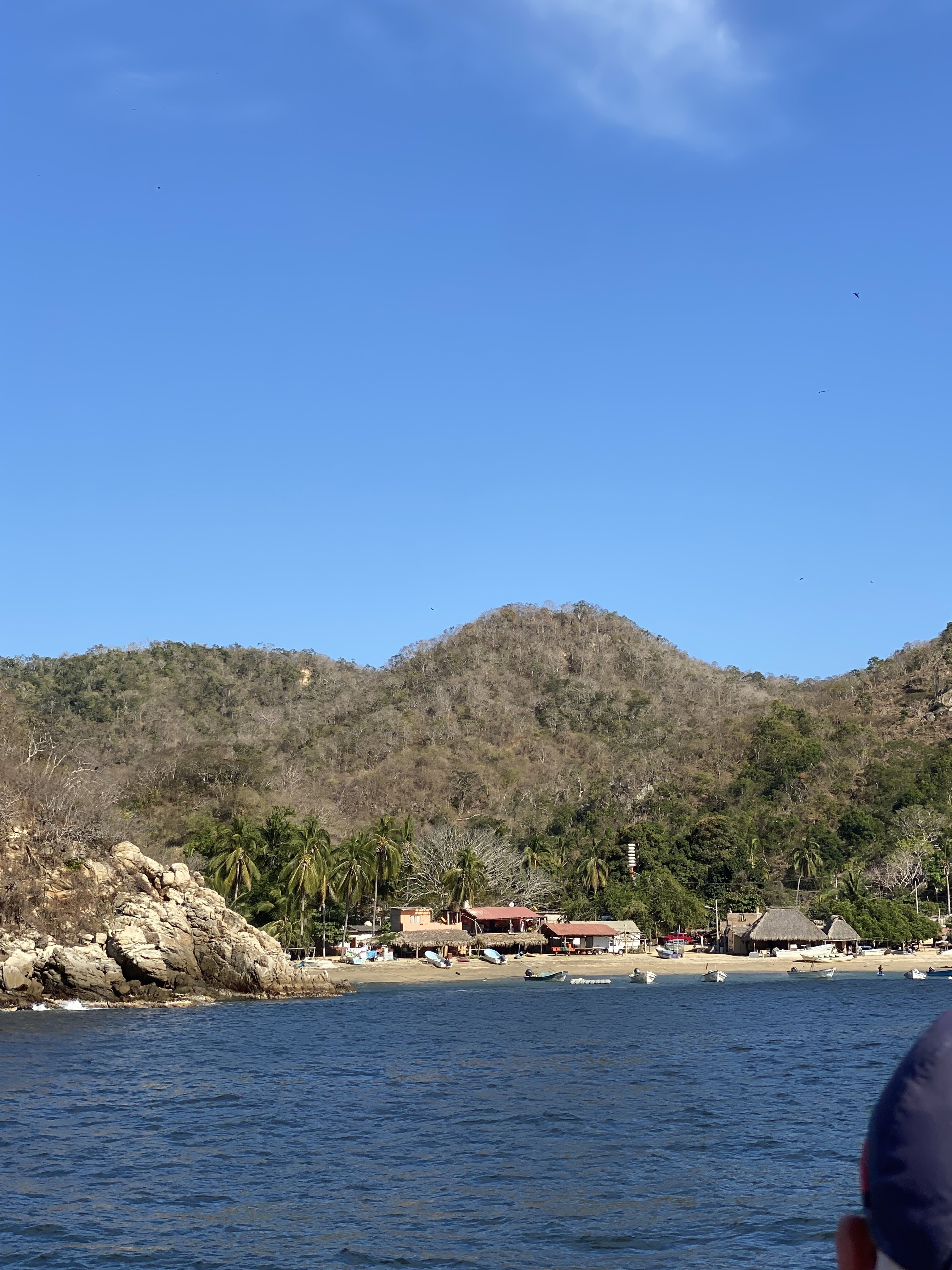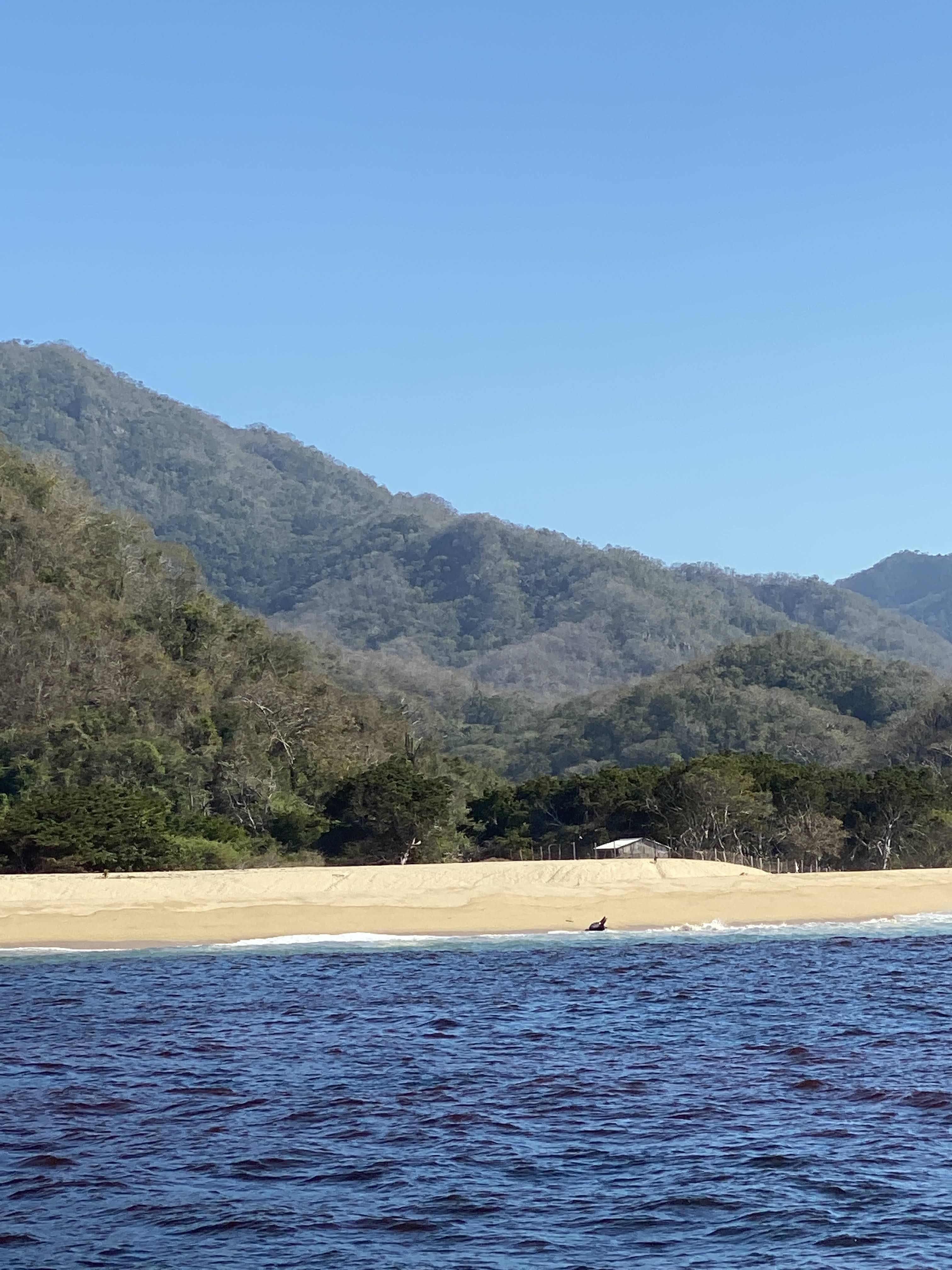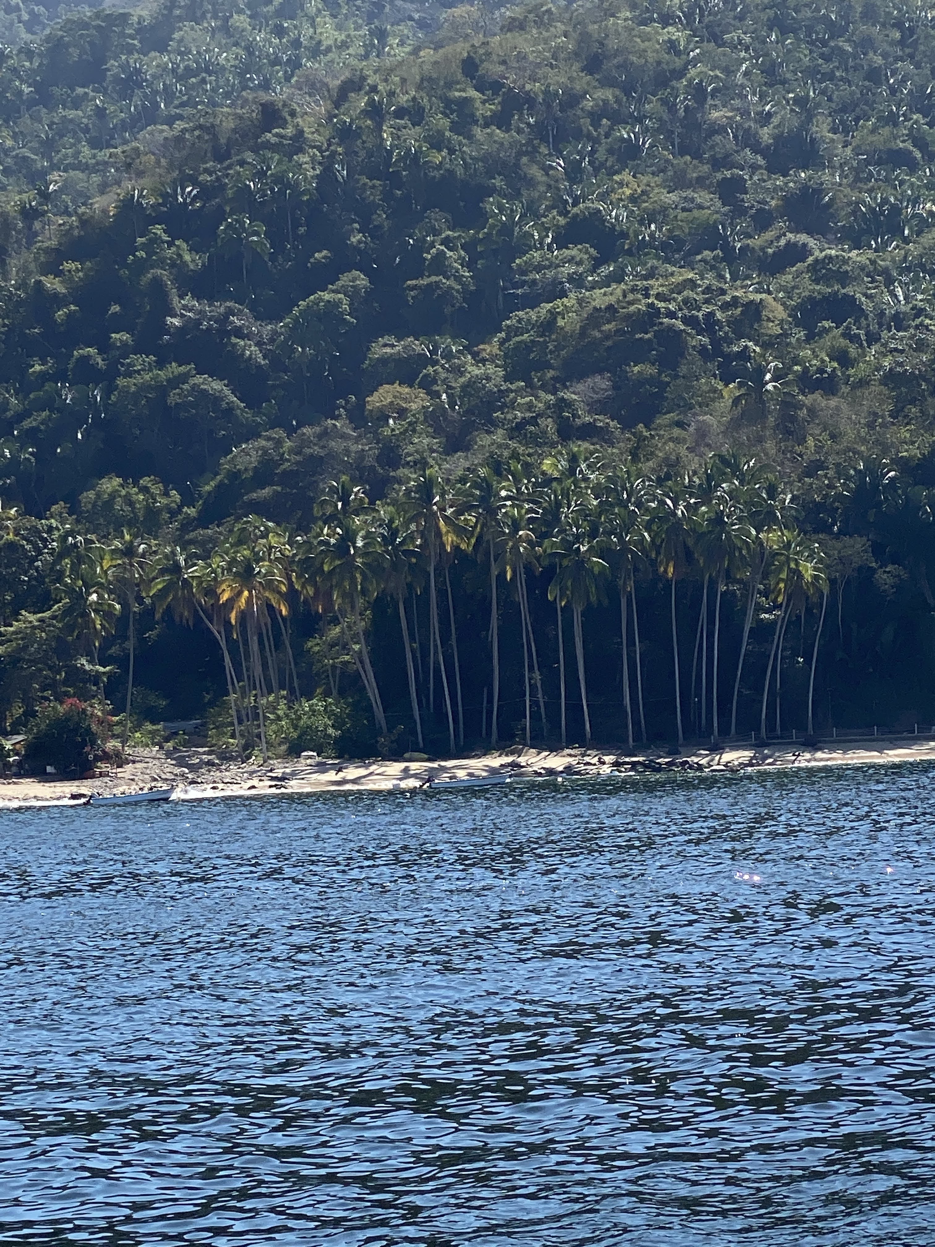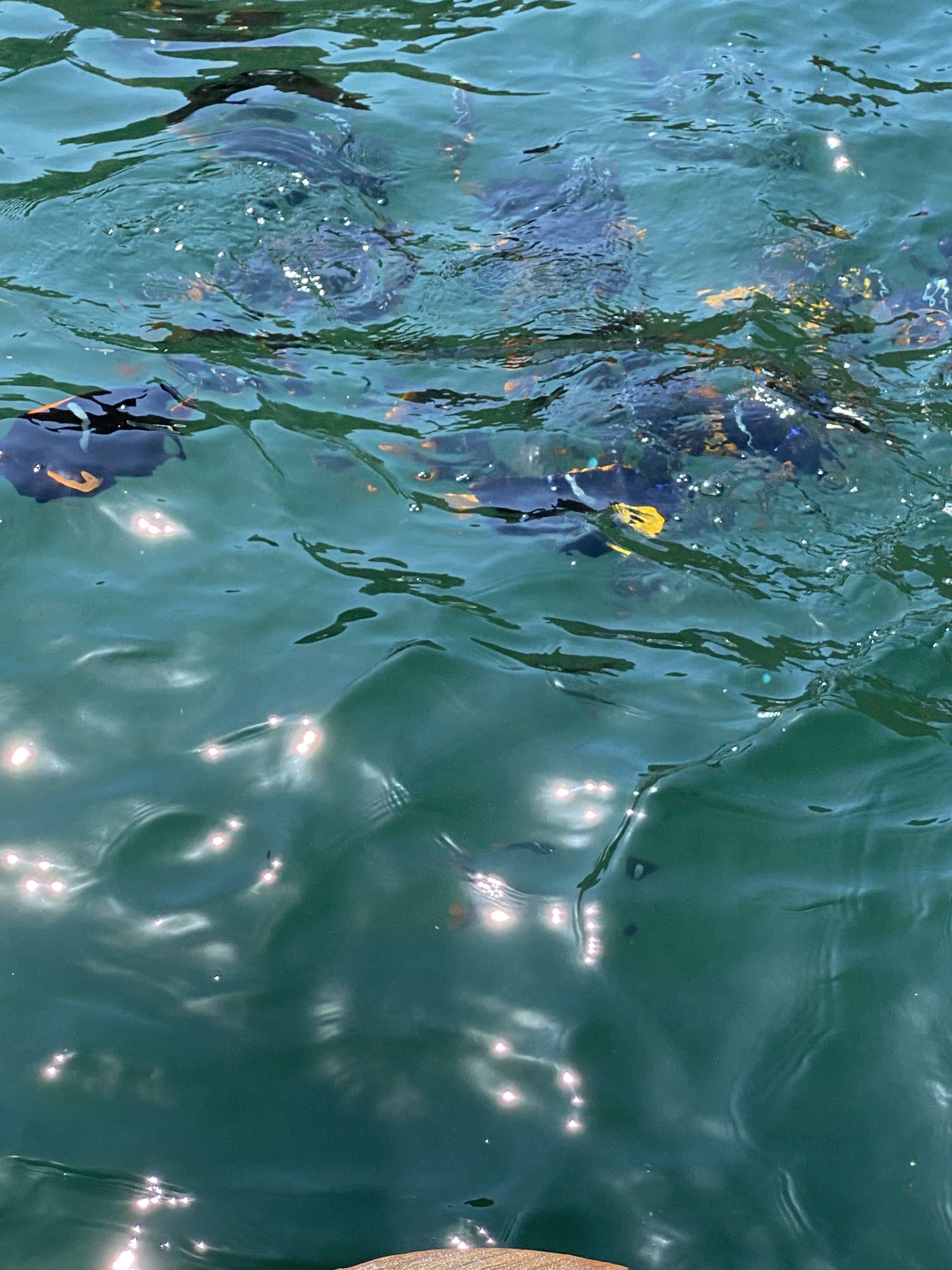 The Captain followed the coast and we saw gorgeous beaches and villages along the way. He stopped a few times for some of us to get a quick dip in the water and to snorkel. At the first stop, the waiter threw some bread in the water and gorgeous black and orange fish came to feed.