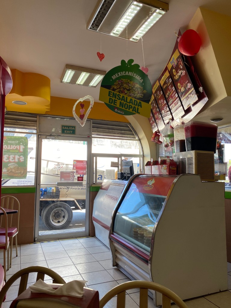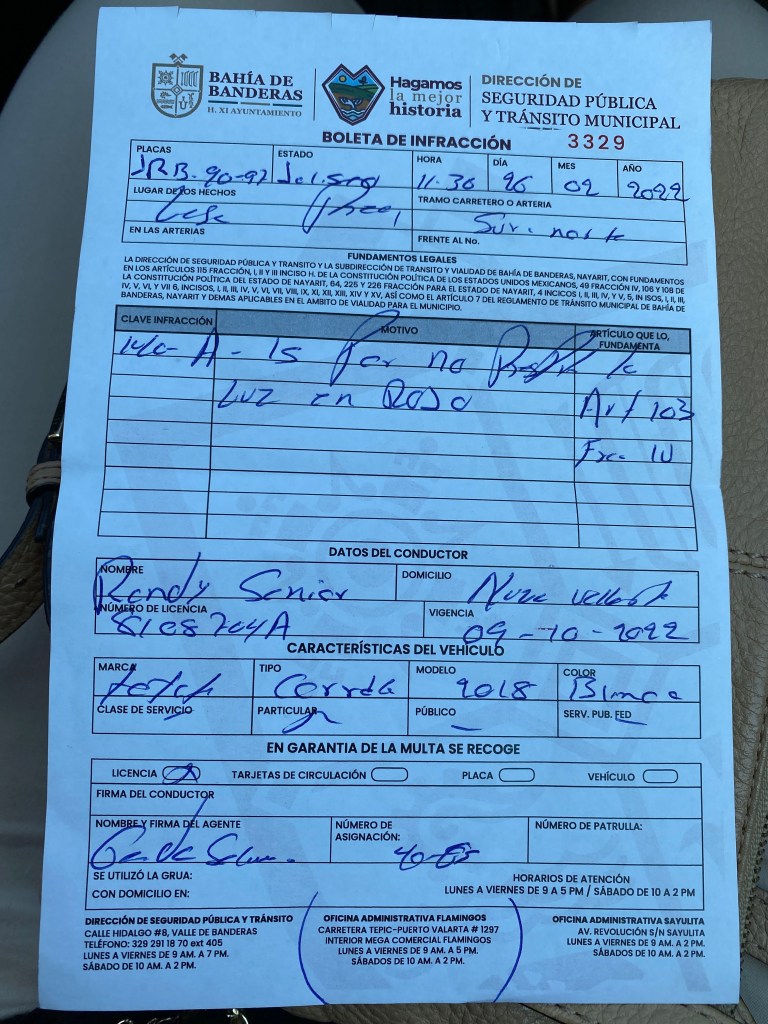 He picked me up at 11:30am and we drove to Mezcales to find some pollo asado since I was craving it. On the way there, Pogo decided to go through a red light at a busy intersection and we were pulled over. The policeman was very nice. He told us that the ticket would be 880 pesos and payable at the station. Pogo asked if we could pay him instead. The policeman said we could but we all knew it would be a bribe so we decided to get the ticket. He took Pogo’s driver’s licence and we will have to go to Mega to retrieve it and pay for the ticket on Monday. Bummer. He can still drive the car without his licence and if he gets stopped again, he just has to show the ticket.