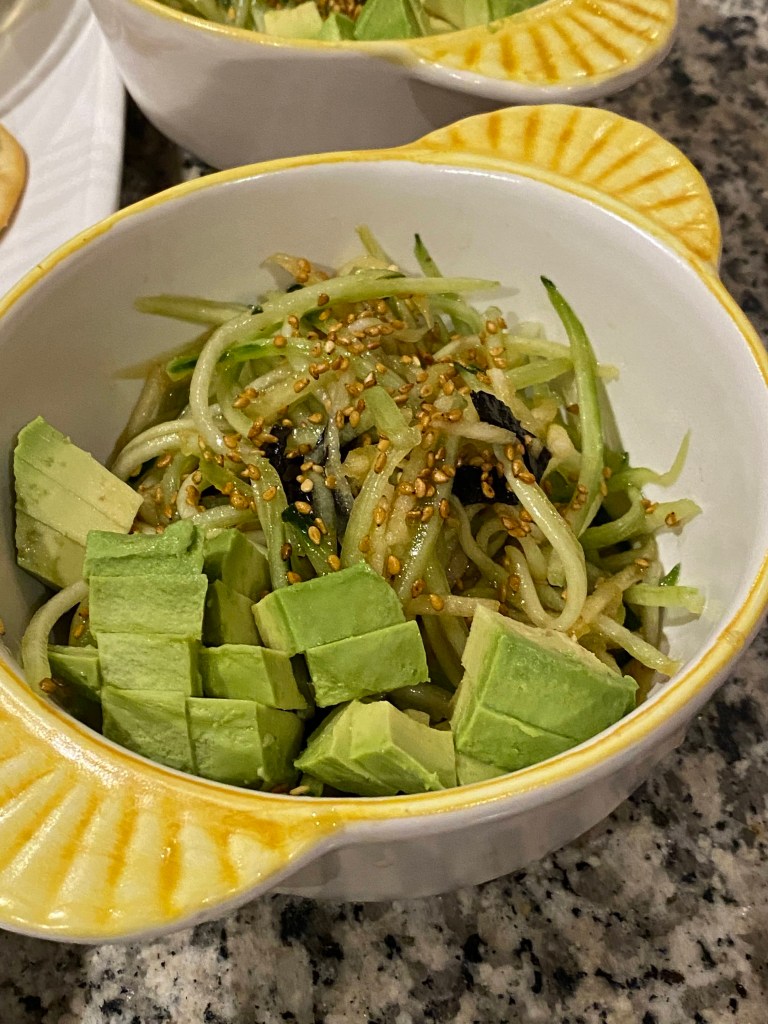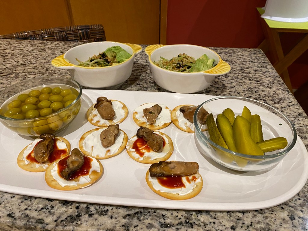 We had decided to stay in for dinner so Pogo made a cucumber salad, similar to the one at Nicksan, the Japanese restaurant next door, and in my opinion, it was just as good. I prepared a bunch of appetizers. Just as we were ready to watch TV, we heard fireworks next door so we went on the balcony to watch them. They were pretty!