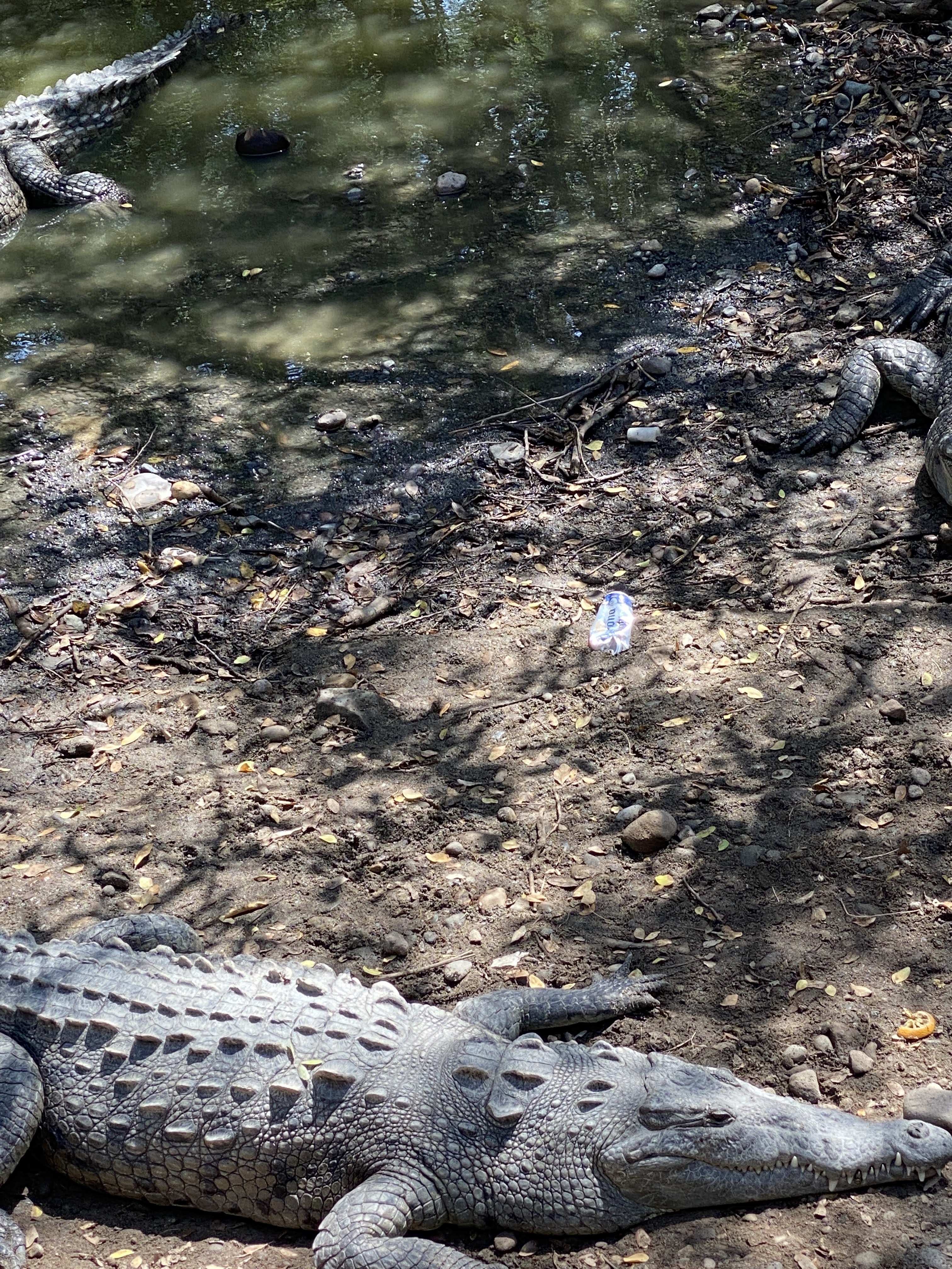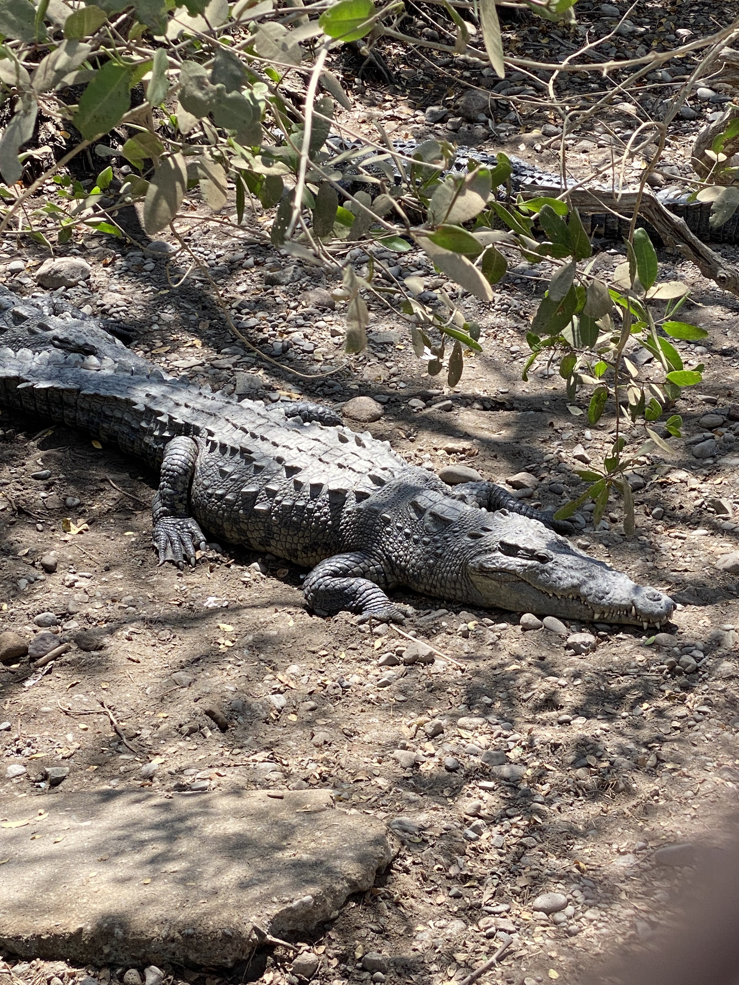 We found the crocodiles while crossing a little bridge at an intersection where the only building was a restaurant called Cocodrilos. The high fence on each side of the bridge was also a good indication. We parked and went to the fence and saw at least 12 huge crocodiles. They were not moving at all. They must have been so tired…For all we know, they were props but we were not about to find out. A few local families had stopped as well to look at them.