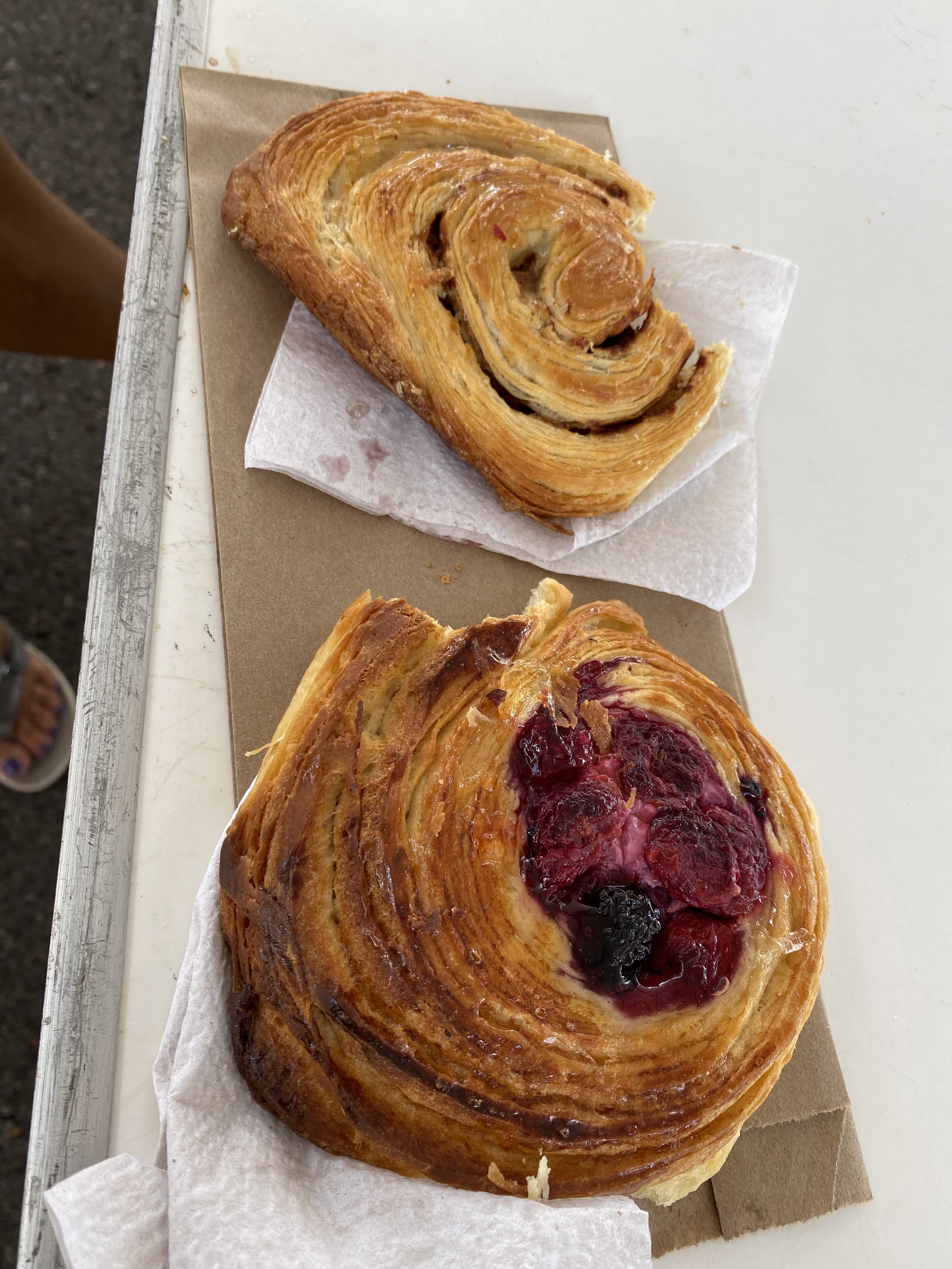 I met Josée in the parking lot at 9:30am and we drove with “l’auto à mon oncle”, their car’s nickname, to the market. We took our time and browsed slowly through all the stalls for a few hours. I got a top and she bought a necklace and a wallet for Mario. We sat for a few minutes and enjoyed a cinnamon roll and a blueberry roll.