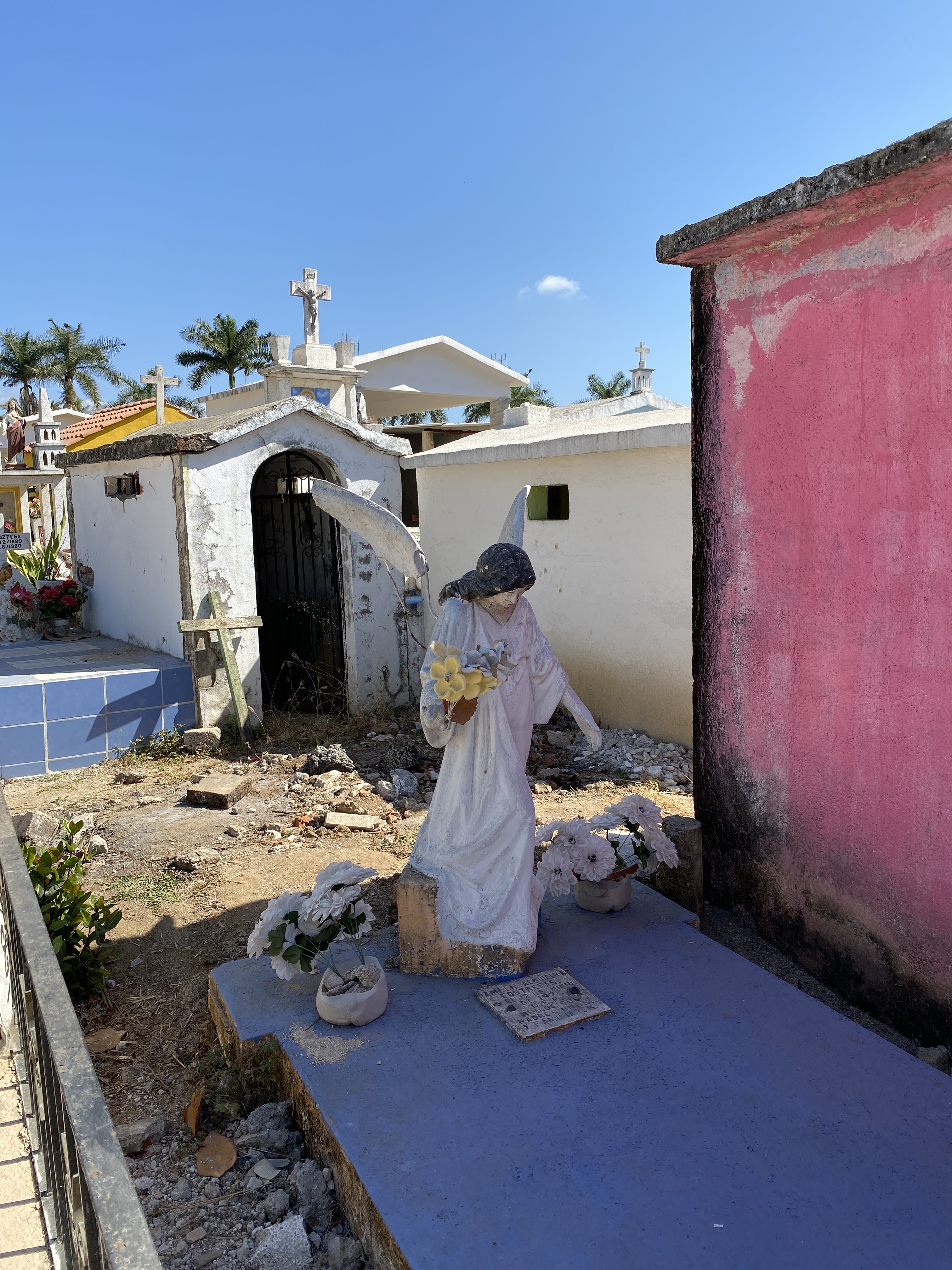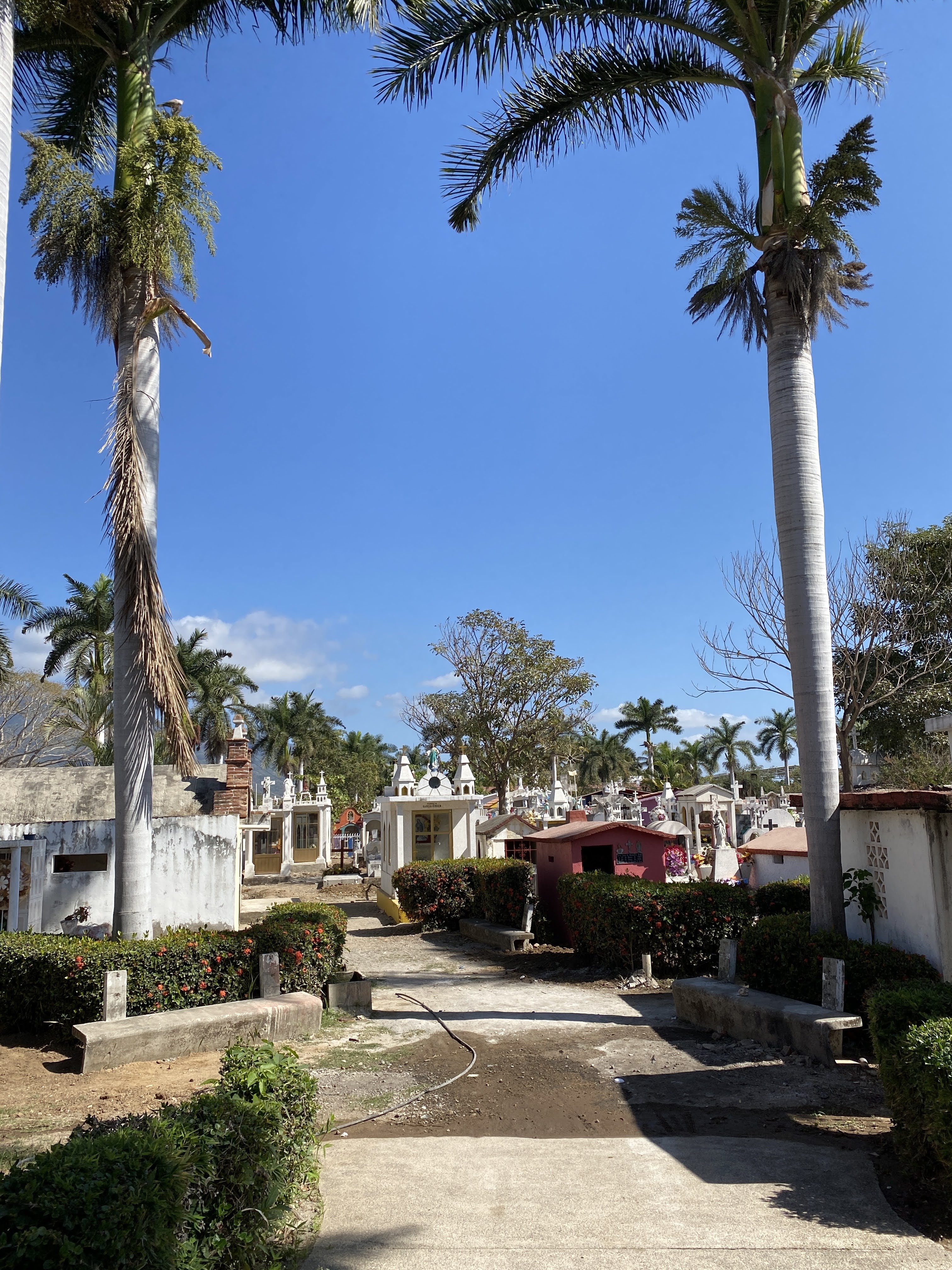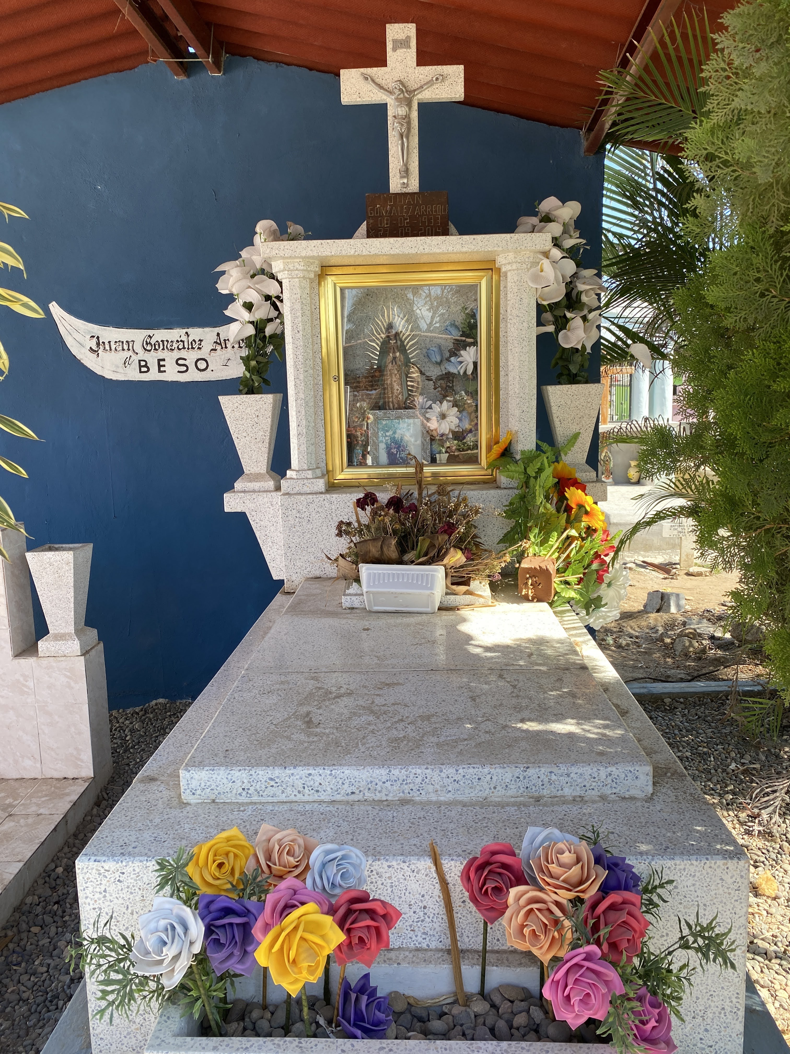 We came back to town and walked through a cemetery. I had noticed a few these past years but we had never stopped to visit one. We saw three different types of graves in the cemetery: The enclosed mausoleums or chapels which were locked but filled with flowers and photos, the more modest outdoor graves surrounded by fences, and the simple outdoor graves with just headstones. It is a place of gathering for the loved ones especially during the Day of the Dead. It felt like we were walking through a maze as there wasn’t one straight line, and only very narrow passages between the graves. There wasn’t any grass like we are used to but only sand between them. They also had a large outdoor church. It was a very unique and colorful experience.