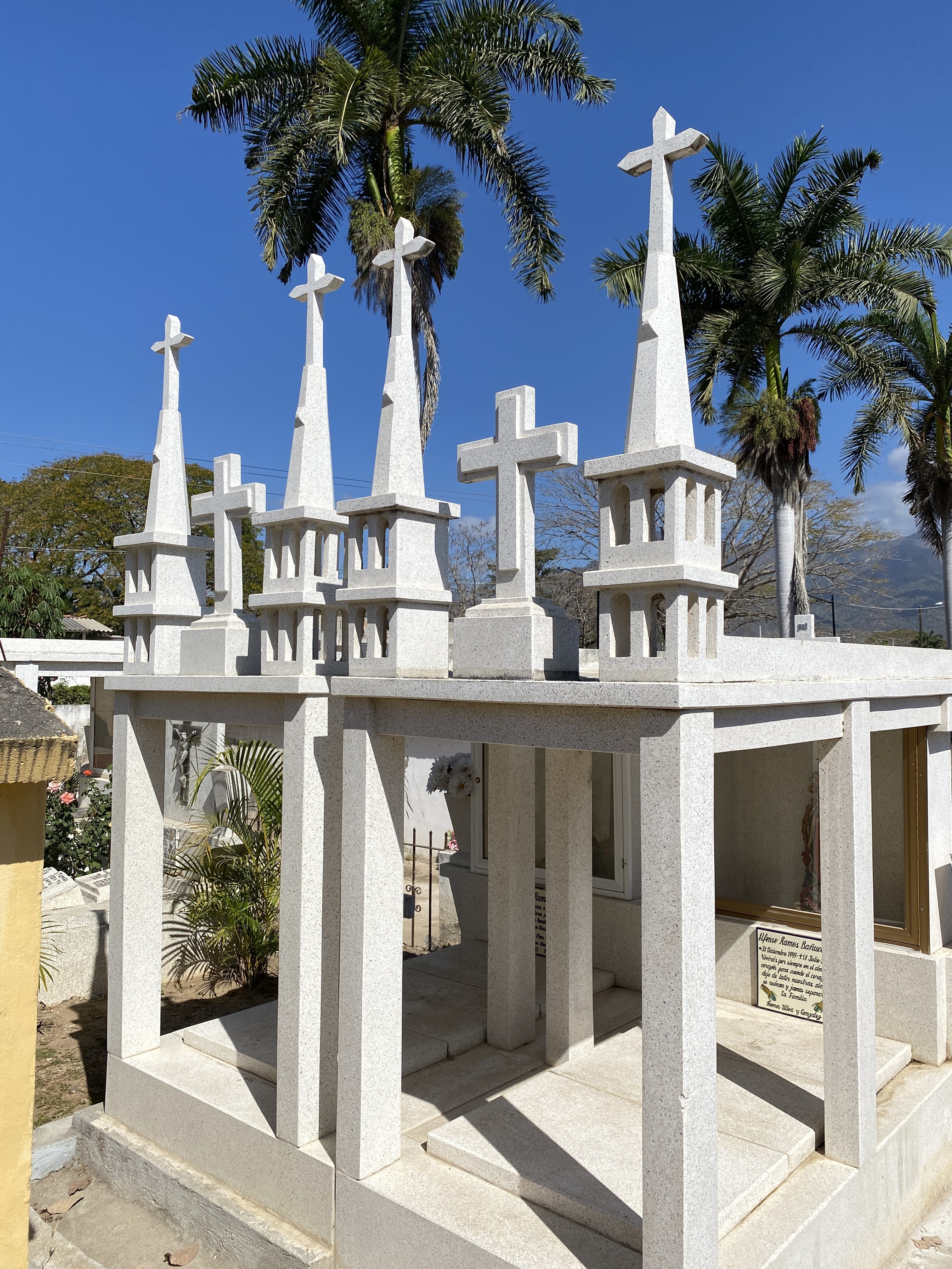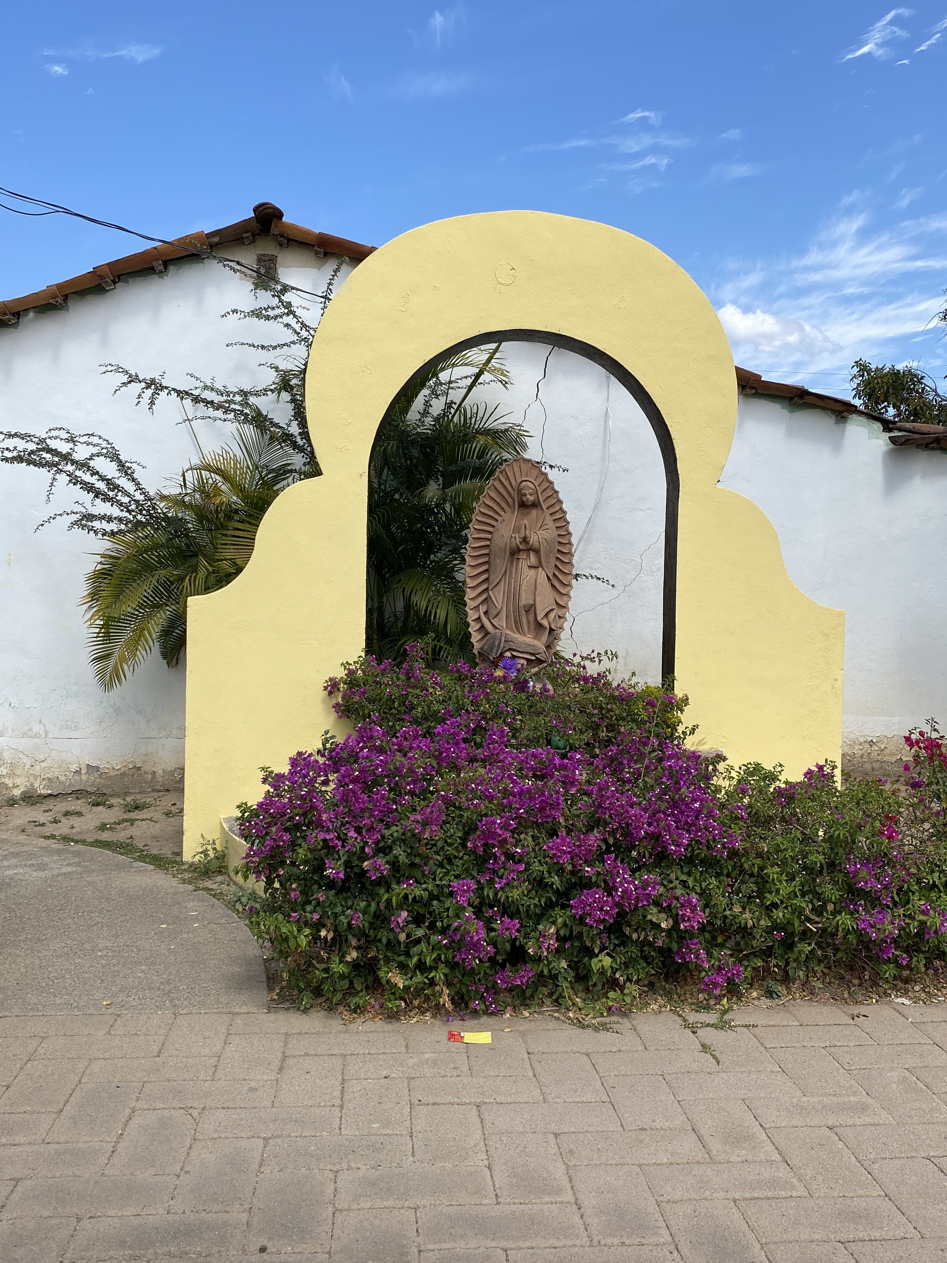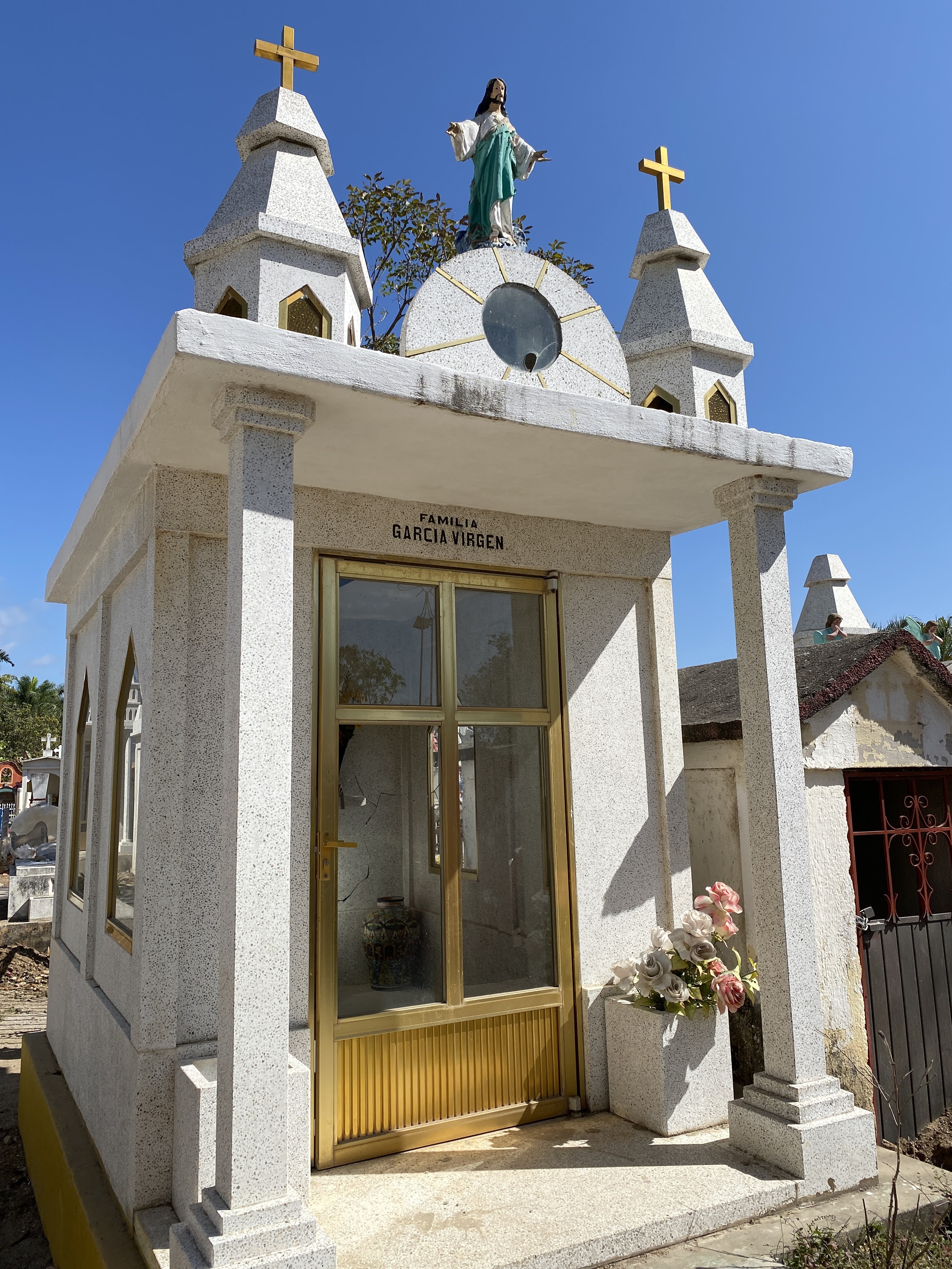 We came back to town and walked through a cemetery. I had noticed a few these past years but we had never stopped to visit one. We saw three different types of graves in the cemetery: The enclosed mausoleums or chapels which were locked but filled with flowers and photos, the more modest outdoor graves surrounded by fences, and the simple outdoor graves with just headstones. It is a place of gathering for the loved ones especially during the Day of the Dead. It felt like we were walking through a maze as there wasn’t one straight line, and only very narrow passages between the graves. There wasn’t any grass like we are used to but only sand between them. They also had a large outdoor church. It was a very unique and colorful experience.