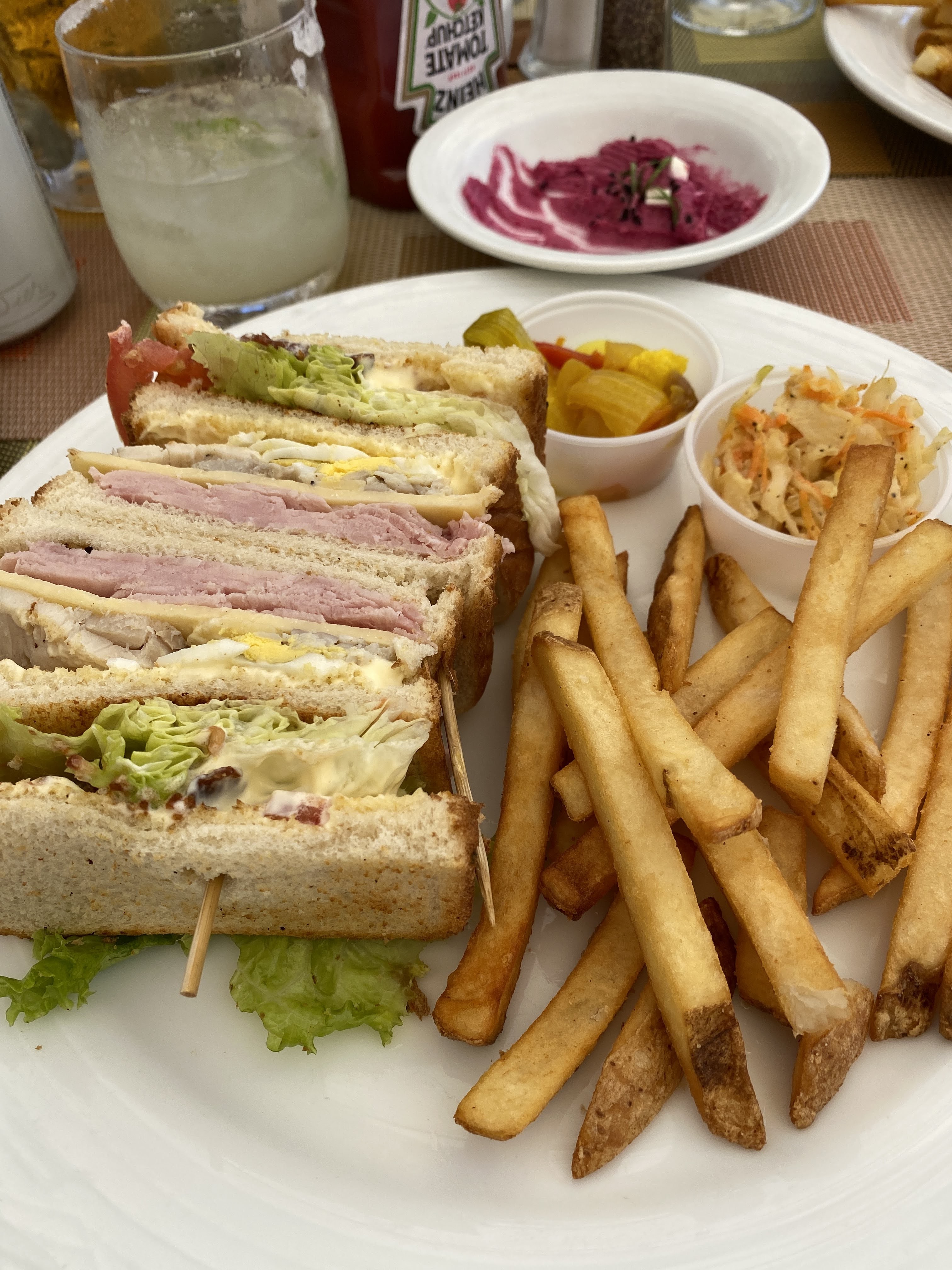 We had lunch at a place called Samba, an outdoor restaurant by one of the pretty pools and we all had club sandwiches. They had all the normal ingredients plus ham and eggs. It was really good.