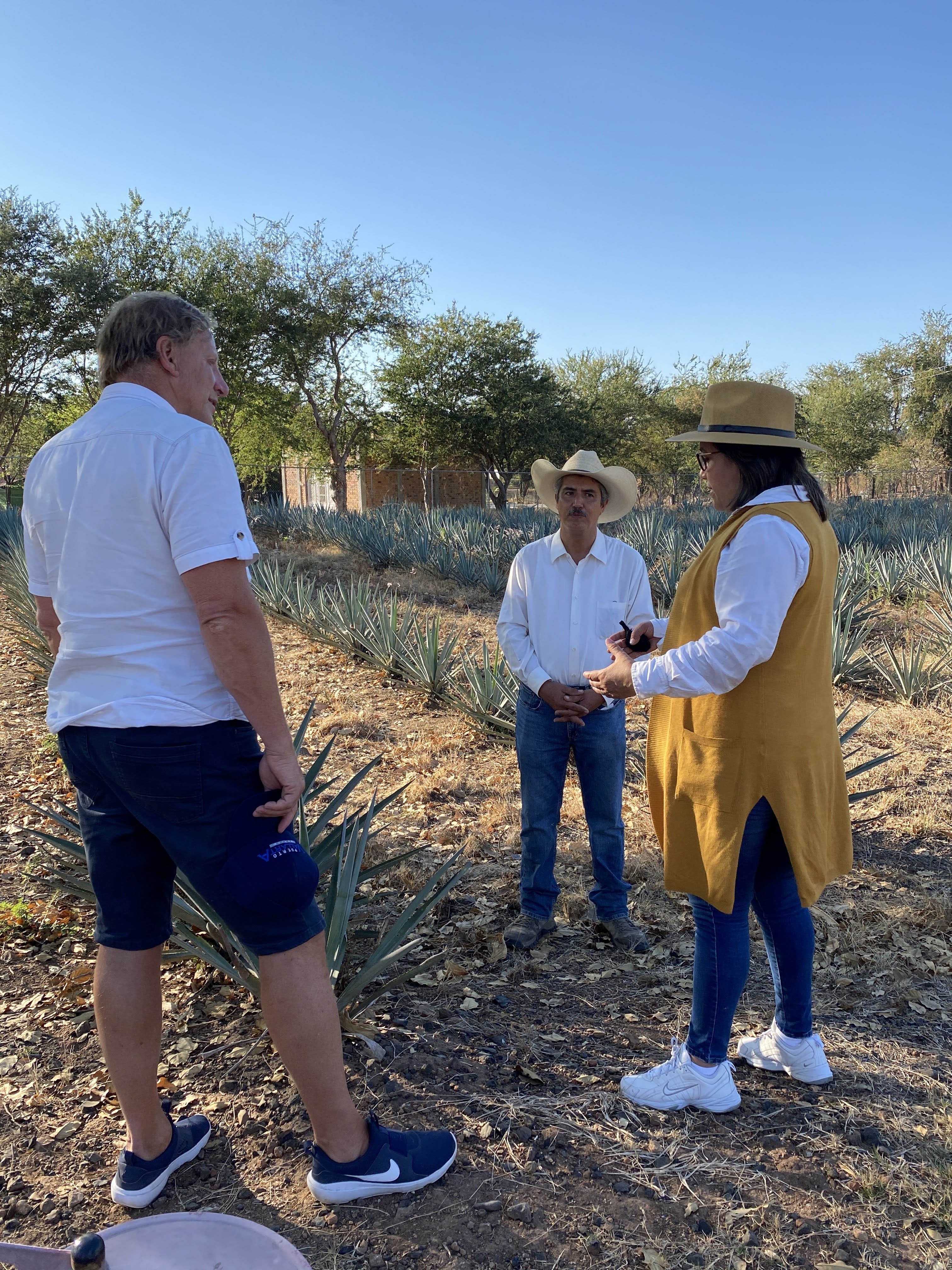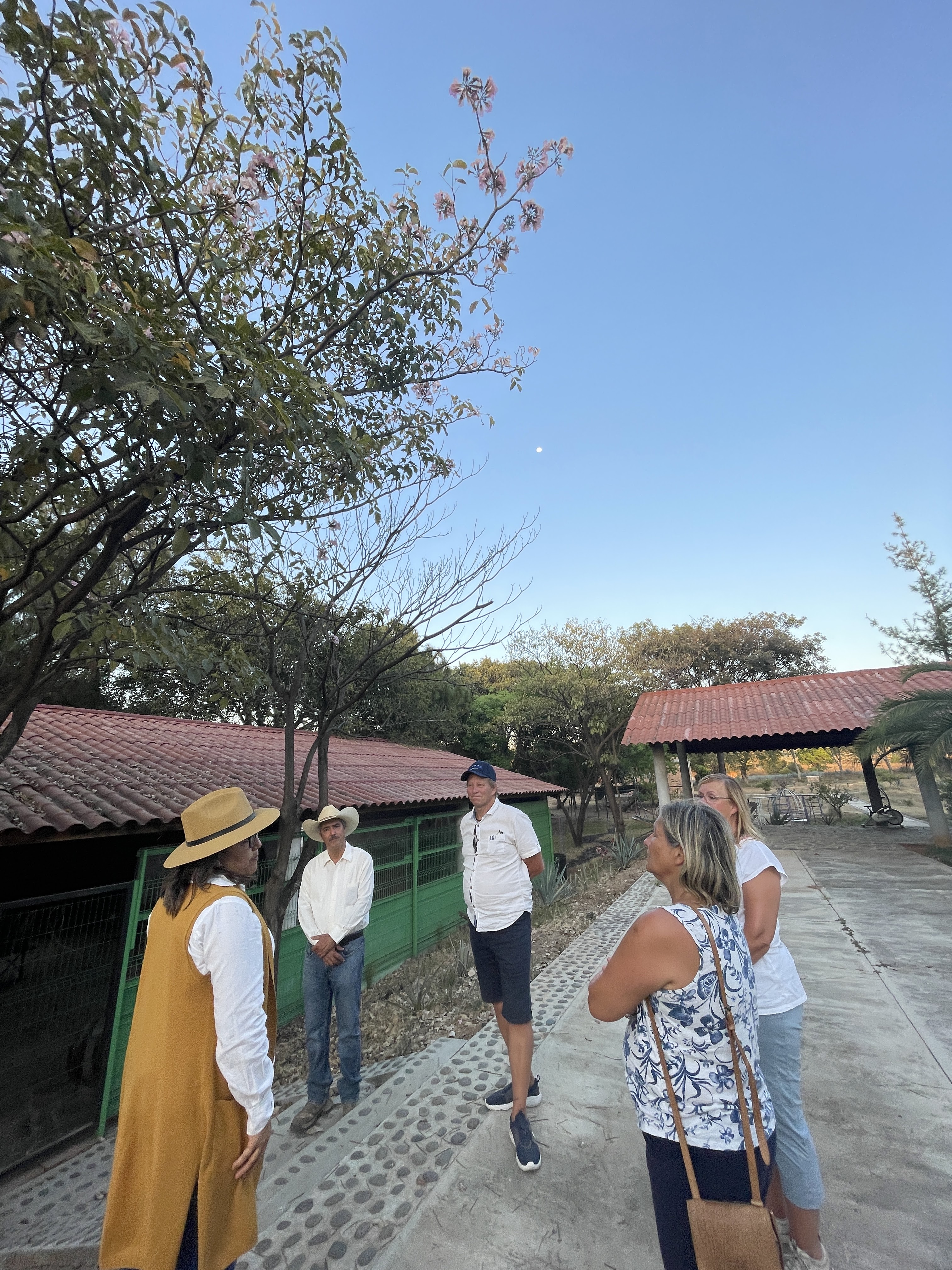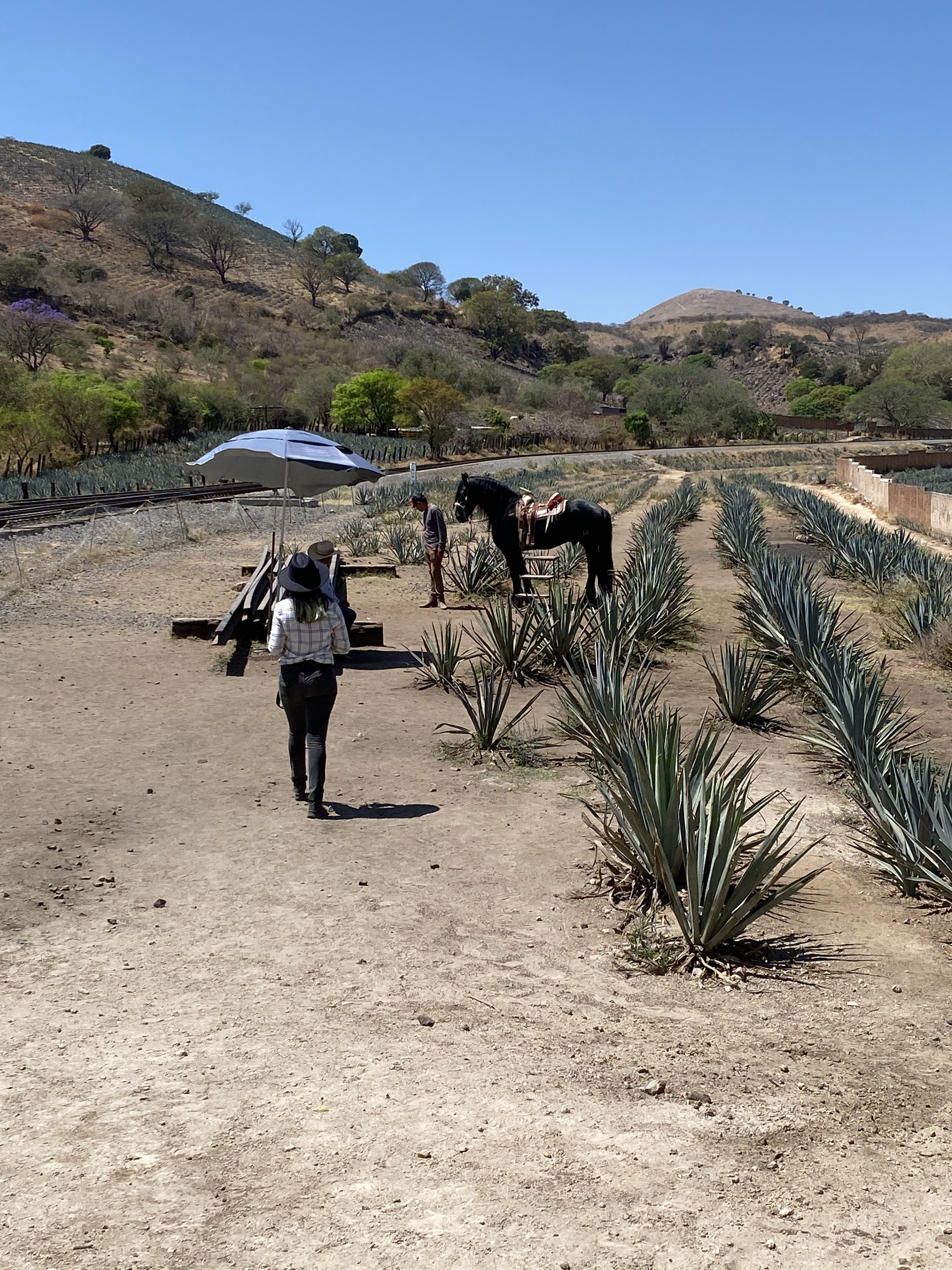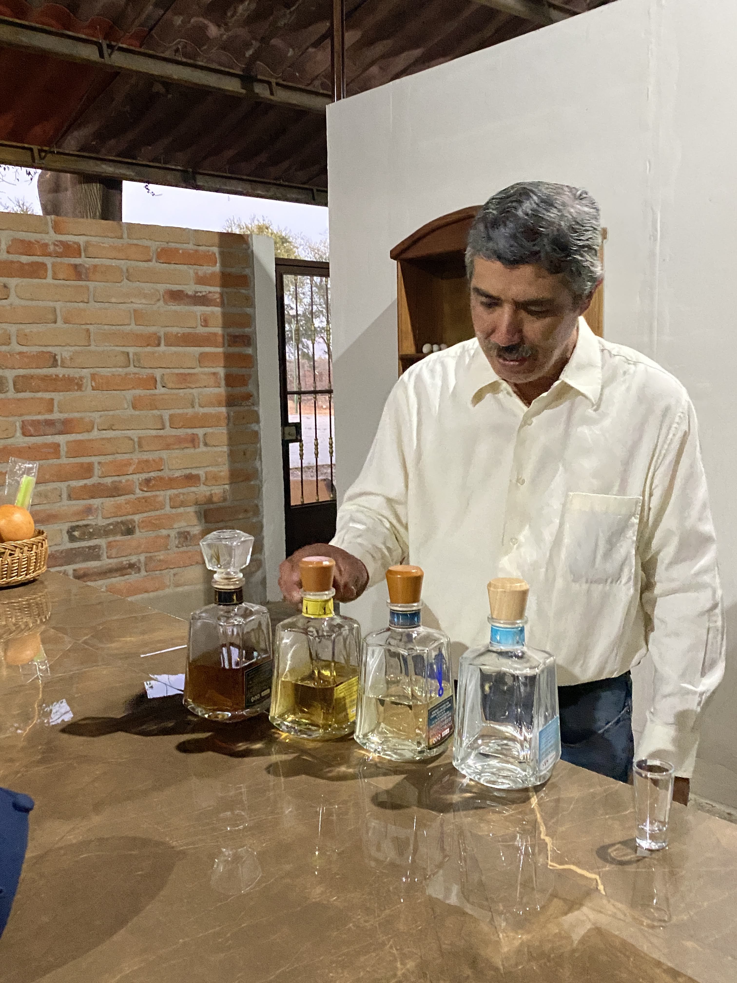 I had looked yesterday at Airbnb experiences to see what was available. I had found one about visiting a small family distillery but it was available only at 8:30pm. I emailed them to see if they could do a private tour for the 4 of us at 5pm. I wanted to go to the agave fields during daylight.  They agreed to meet us from 5 till 7pm.  We were there until 9pm… José, as in José Guadalupe Nuñez Rodriguez, the owner, couldn’t have been more welcoming.  He used to be the mayor of Tequila and worked hard to have it become a Pueblo Magico.  He didn’t speak a lot of English so had asked his friend Monica to be the interpreter. He took us first to the agave field, explained the process of growing and harvesting.  We walked around a very small portion of his 600 acres property, on the outskirts of Tequila with an incredible view of the volcano. We could still find obsidian glass from the last time the volcano erupted 200K years ago. They had a variety of fruit trees all over the property like lime, lemon, avocado, mango and mandarin as well as pistachio trees. They also had a few cows, chickens, horses and dogs.