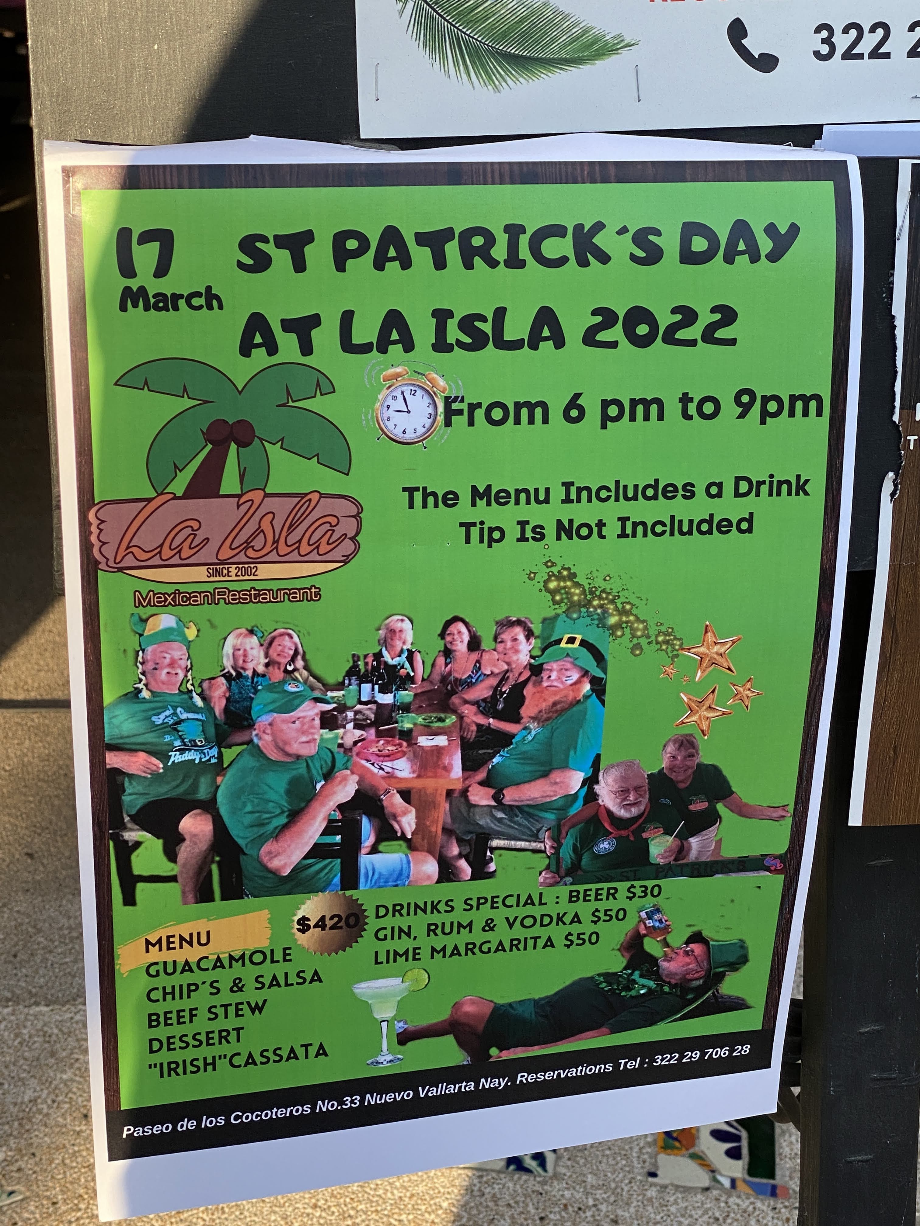 We picked up milk on our way home, saw that La Isla was open (they are usually closed on Thursday) so we stopped to talk to Graciela and she told us that they were having a St. Patrick’s day dinner so we reserved a table.