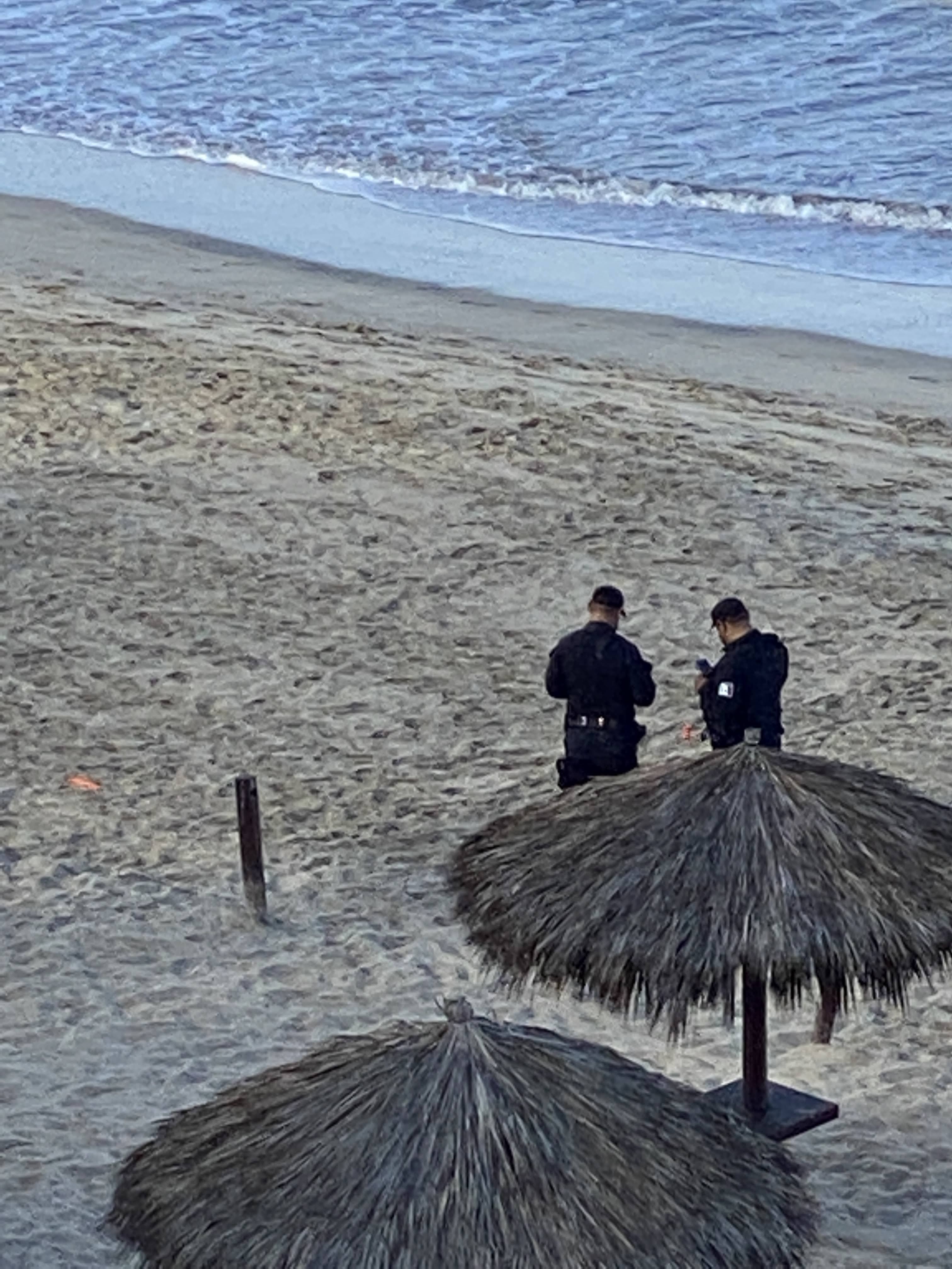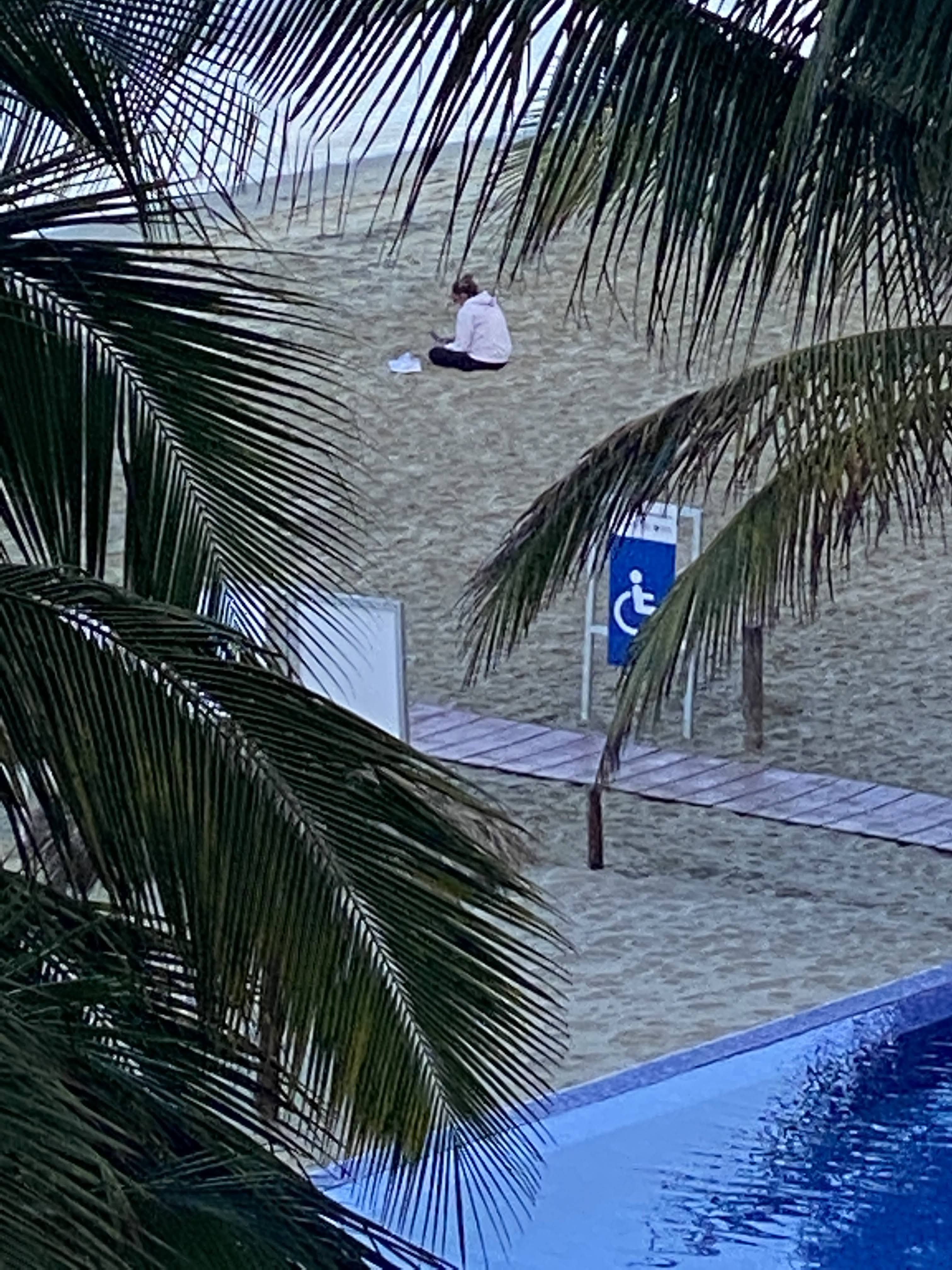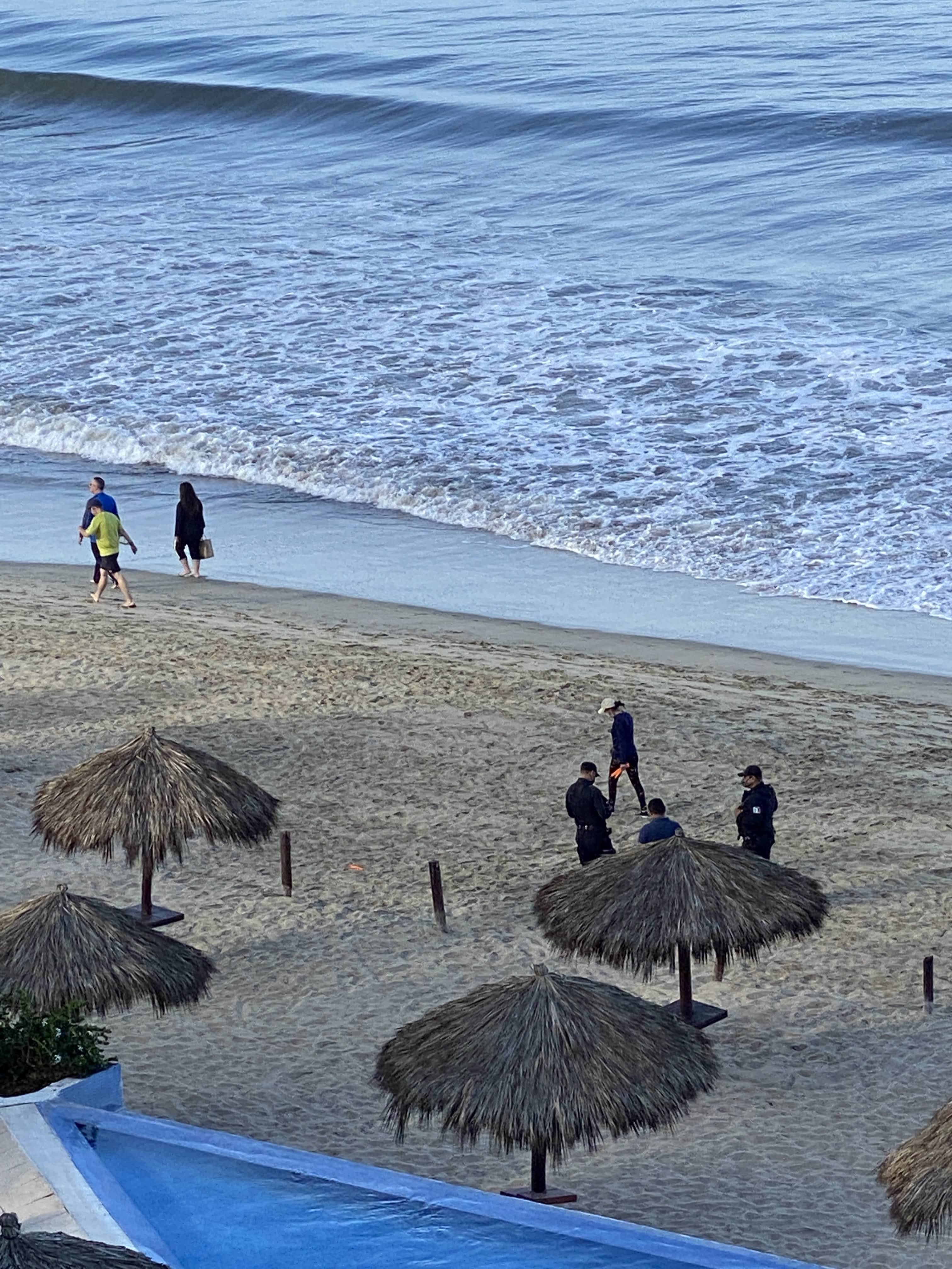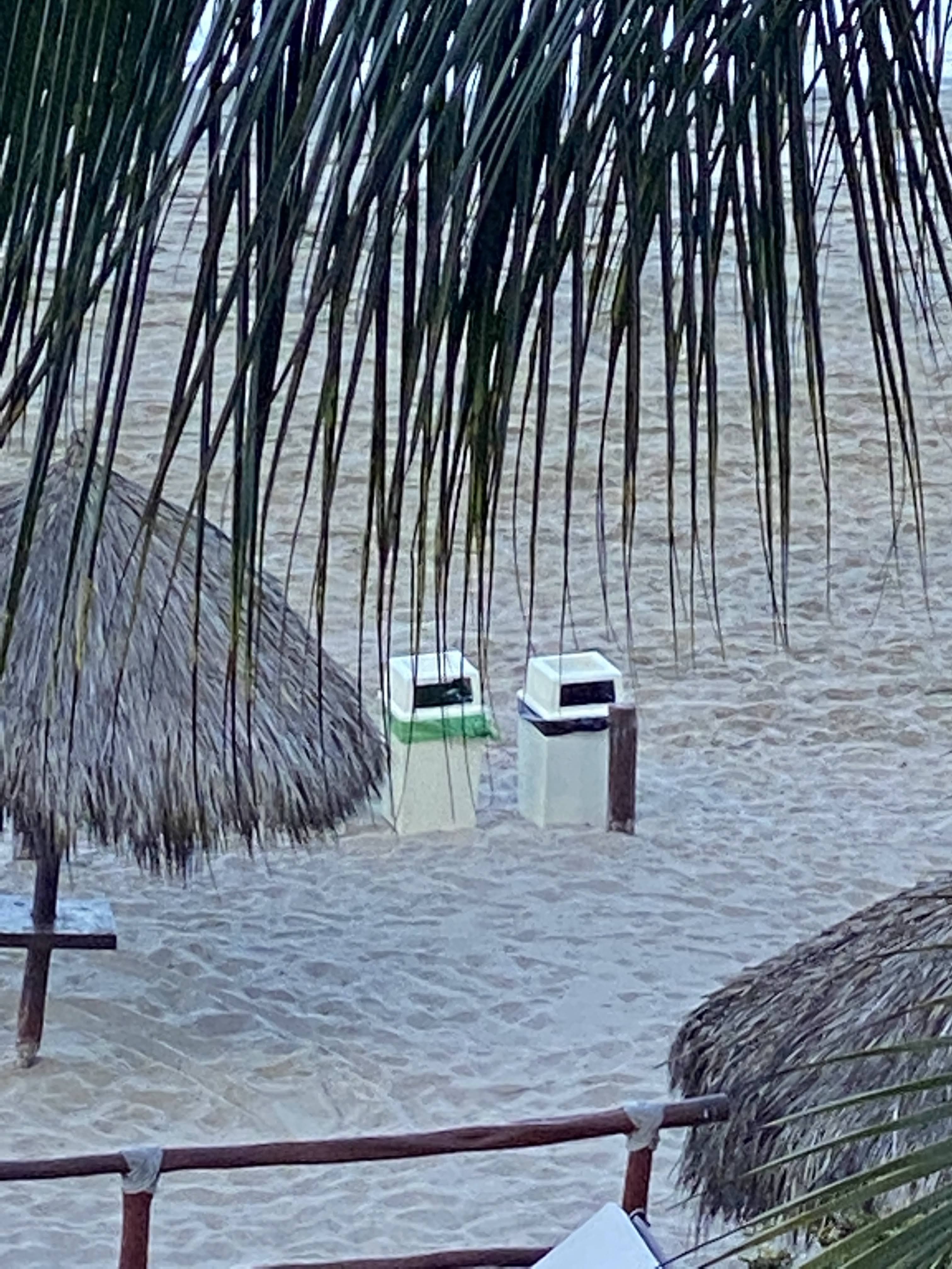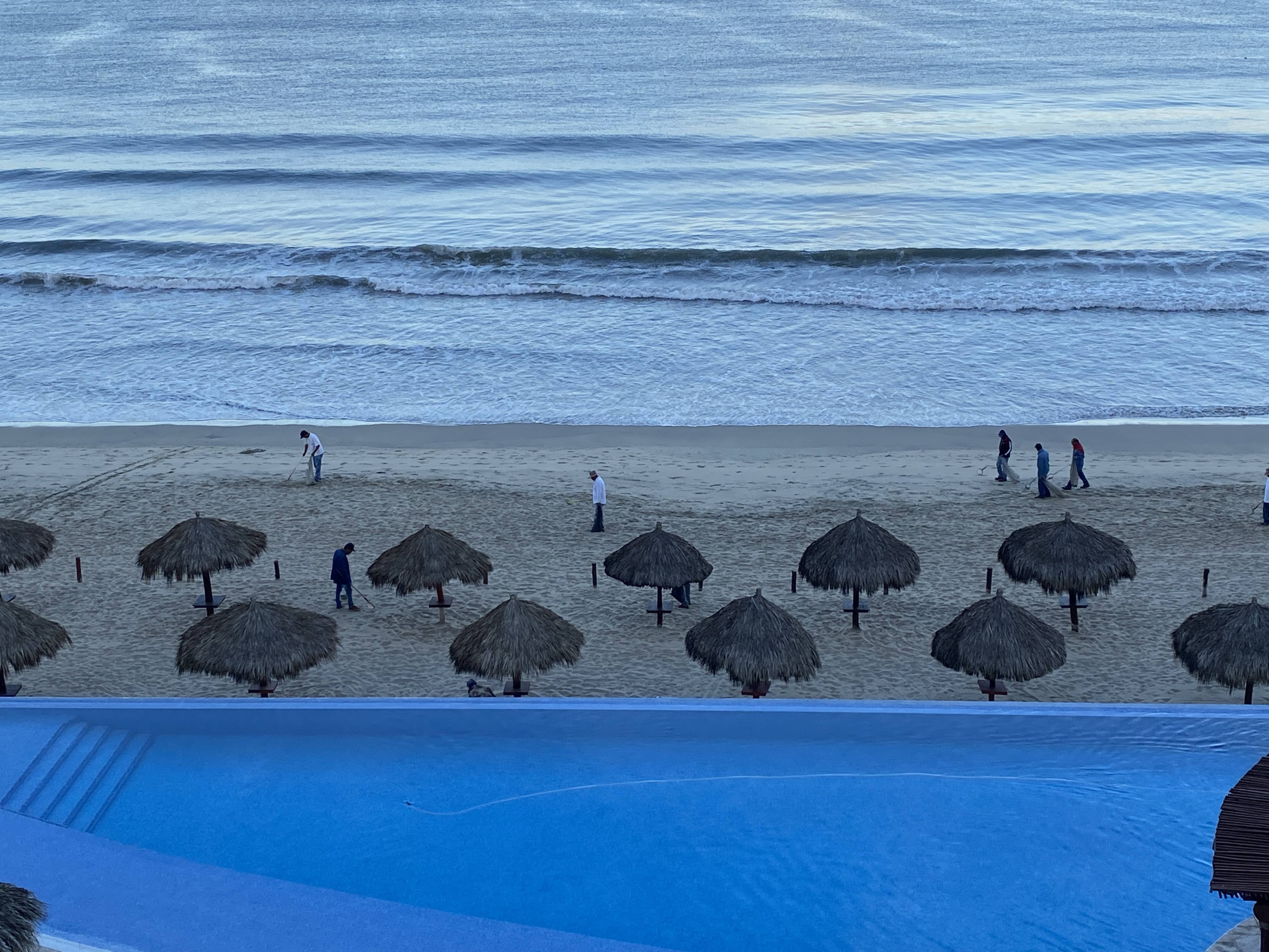 There was action on the beach with a a dozen people cleaning the sand, then a few policemen showed up and were talking with a couple who were leaving red papers on the sand. There is now a wooden path from the public access for handicaps as well as 2 garbage cans. They also put the chairs back by the palapas but still no ropes.