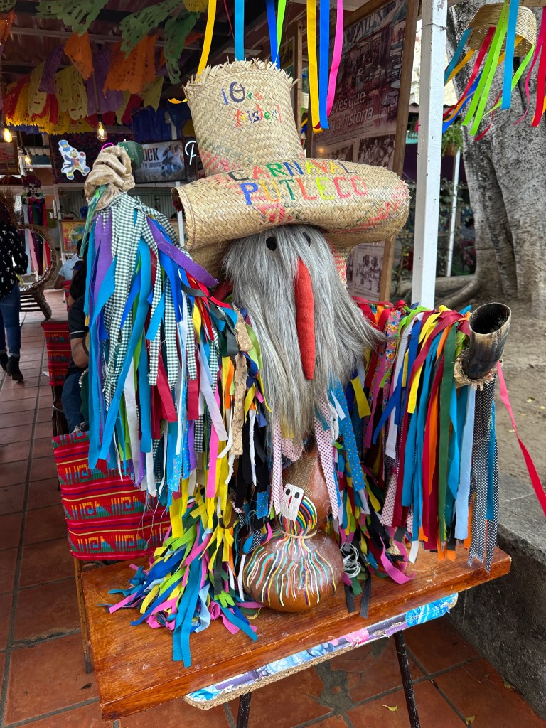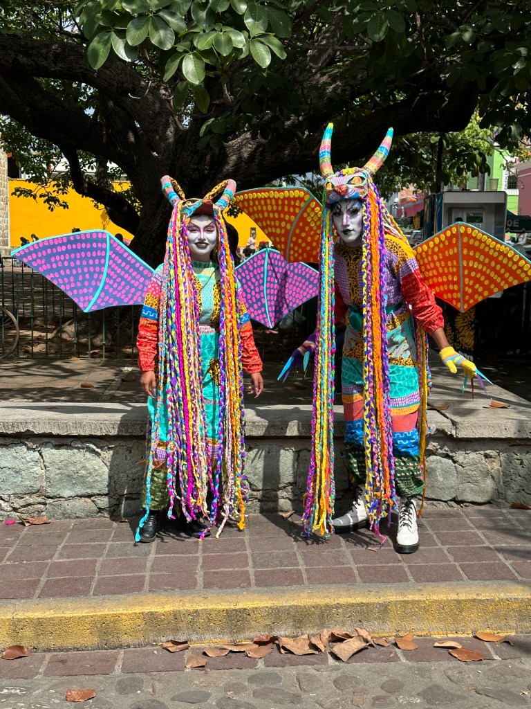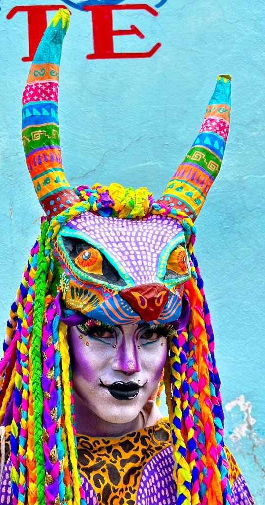 We stopped at a print shop that Max liked and I bought a few small prints of agave plants to put in her room in Vermont.  We saw a wedding and ran into 2 people with elaborate makeup, putting the finishing touch on their Alebrijes costumes. I took a few pictures then we saw them again later on, taking pictures with people for tips.