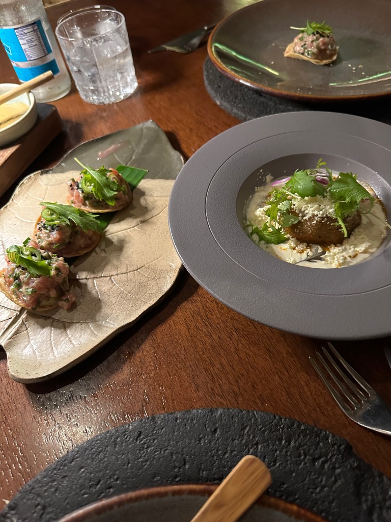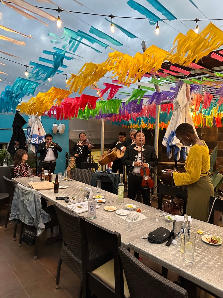 At 6:30pm we took a Didi to the terrace where they were celebrating, had a few drinks, had a great time chatting with more friends of Max, ordered a bottle of mezcal for everyone to share, watched the mariachis then left to have dinner at Los Danzantes, one of the best restaurants in town, according to Max who had made the reservation for us.  Because of the busy time of the year, they were not taking reservations but Max had arranged with her waiter friend to get us a table. It was the best meal in Oaxaca so far: tuna tartar on tostadas, some kind of shredded pork meatball that was so delicious, cheese stuffed chicken with red mole and pork ribs. Yummy!