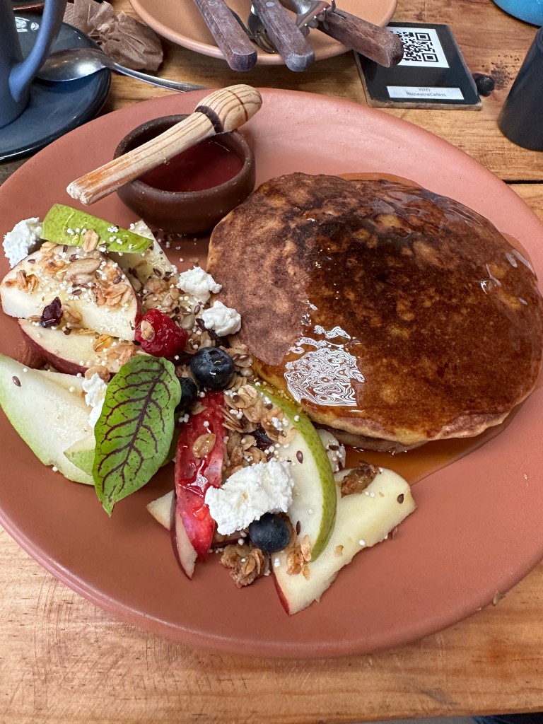 Pogo brought more laundry to be washed and at 10am we decided to go for breakfast. We went to Rupestre Café, another cute café Max had discovered last month, another 5 minutes walk. Pogo and I had pancakes and fruits and Max and Hernan had chilaquiles with chicken and eggs. The portions were really big so no one finished their plates. There were a few stalls in the back of the restaurant so Max and I went to look at them. I had tried a dress in a store a few days ago with a hummingbird print but I didn’t like the fit. It just happened that that company had clothing at the restaurant and I couldn’t resist getting a little jacket with the hummingbird print and a top with a rabbit print. And…bonus….they were half priced!