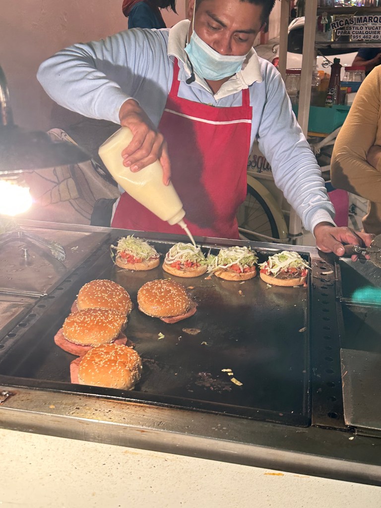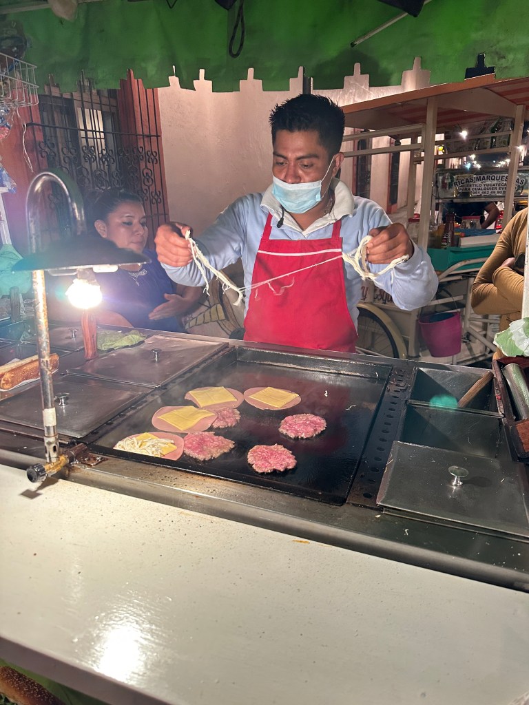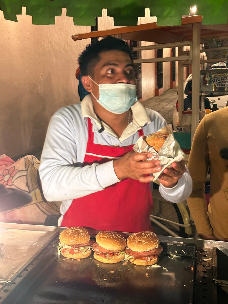 We stopped in Centro to have hamburguesas because I was really hungry by then. It was the best hamburger I have had in a long time! They first cooked the patty then they cooked sliced bologna (or maybe ham?) added American cheese then Oaxaca stringy cheese on top of it. Then they cooked small pieces of pineapple, put the bottom bread on top of it, flipped it, added the meat and cheese on top, then added cubed tomatoes, lettuce, ketchup, mayo and mustard. So good! Even Pogo who had said he wasn’t hungry, devoured it in a second.