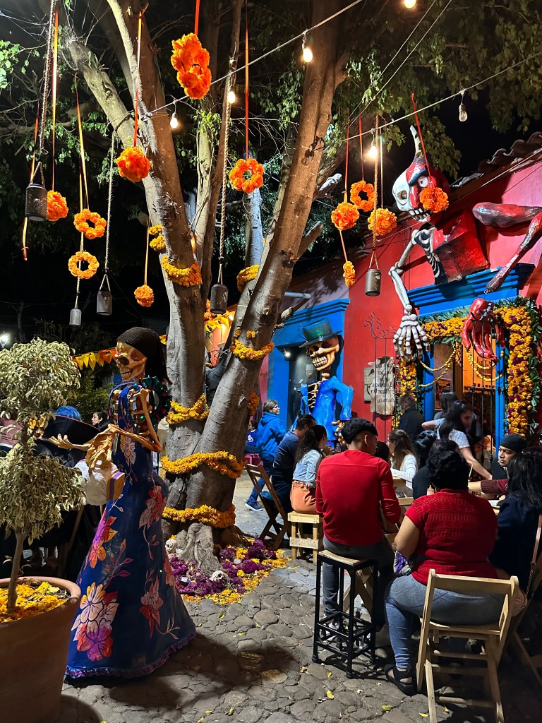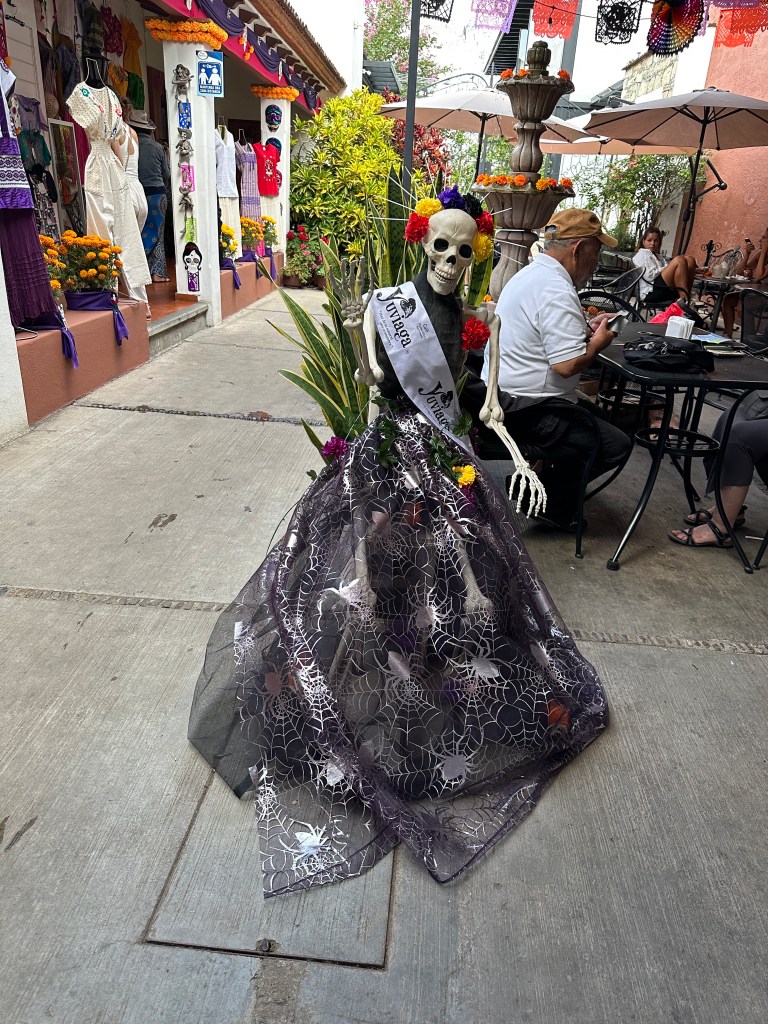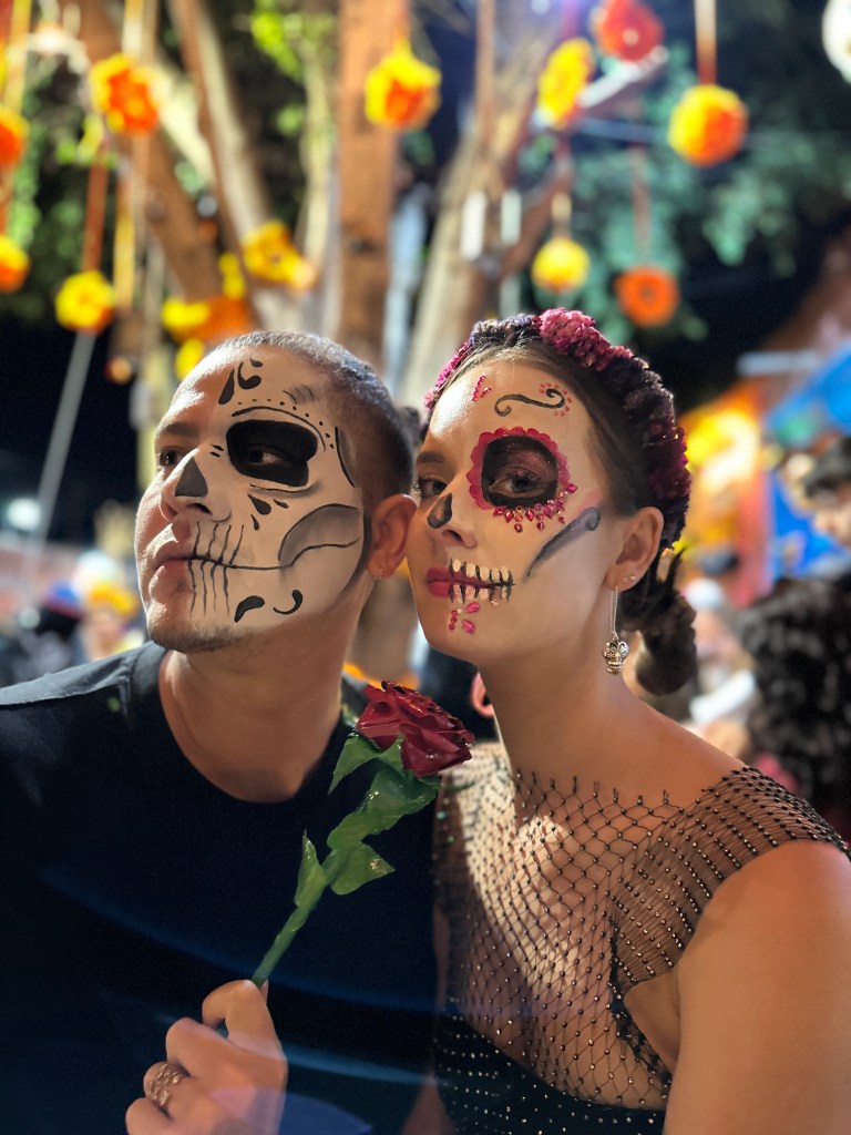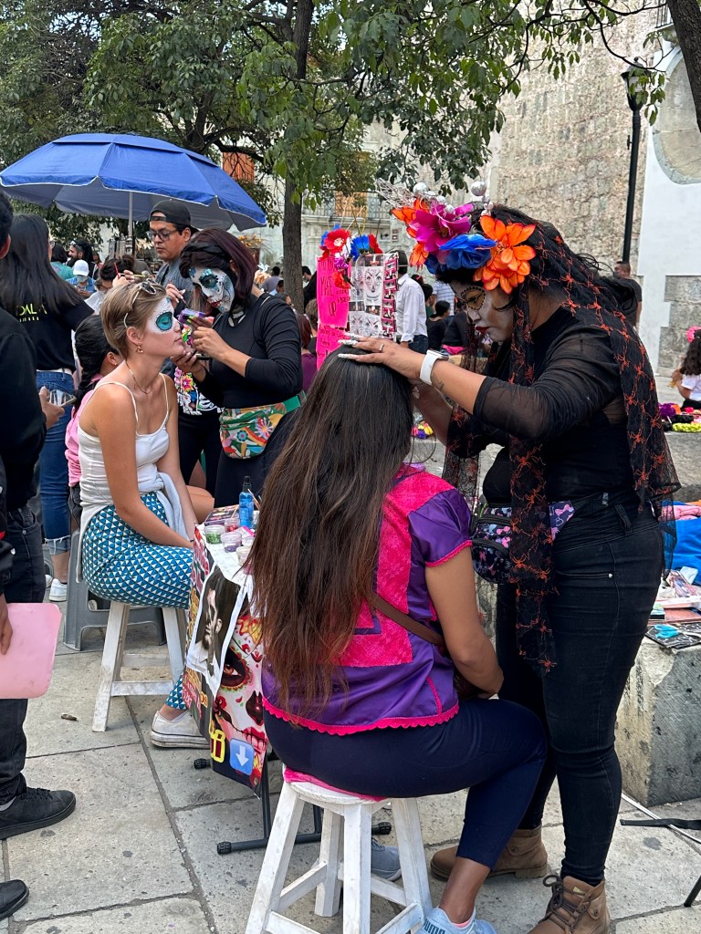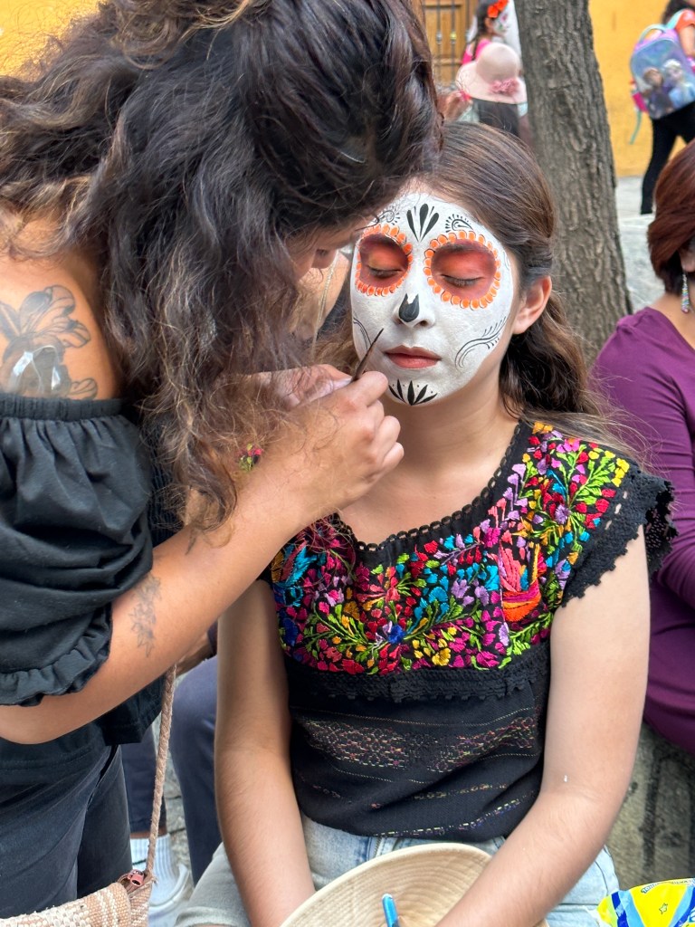 We went to get a bite to eat and shared tacos and queso fundido. We walked around town to see more decorations and the streets were full of pop up makeup stands. We had decided to have our face painted and since our hotel was offering it, we had made appointments for 5:30pm. I had started to have a cough and had to constantly drink water to avoid coughing while doing my makeup.