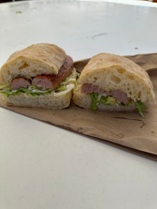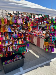 Martha was still home when we came back so we went to La Comer to pick up some grocery aka liquors and electrolytes. We didn’t know that the Bucerias market was Wednesday at La Comer outdoor parking lot. It was really busy but we found a parking spot. We did our grocery and decided to see what they had at the market for food. It was almost 1pm and they were about to close down but we shared a choripan, basically a sausage sandwich. All the vendors were packing up but I managed to find a booth with all my colorful pompoms!