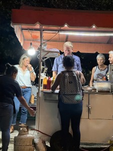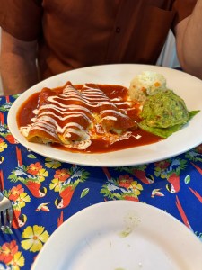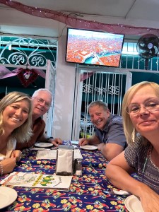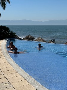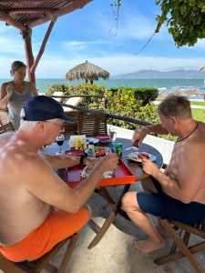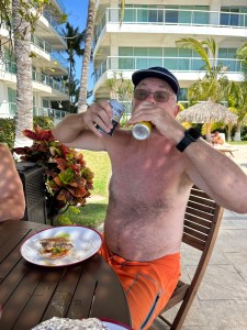 We hit the pool as soon as we were back and Mario and Josée were there. We ended up spending most of the afternoon by the pool and Mario made us all hamburgers for a late lunch. Max made an appearance to eat quickly and went back to work. At some point, Pogo had opened two beers for himself without realizing….We made plans to go to Los Pericos with our friends for dinner. We stopped for churros on our way home. They came over for a tequila afterwards.