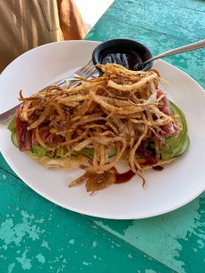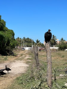 We sat in the courtyard to decide our next move but the mosquitos were eating us alive so we just went to pack our bags and left. We went to discover the San Blas beach and went to Tuna Break, the restaurant our new friends had told us about. We saw some vultures eating an animal, maybe a dog, on the way. So sad. We were the only ones at the restaurant. We were still hungry since breakfast had not been a hit. It was another beautiful beach almost deserted. It probably is very busy during the weekends. We had taquitos vengador (an “eggroll” stuffed with shrimp, bacon and pineapple) and tostadeo San Pancho (a tostado with cucumber, avocado, tuna and fried onions). Droning was involved.