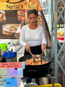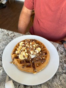 I washed the sheets and the dishes from last night before Martha arrived to clean the condo. We drove to the Tuesday market to buy some salad dressing then went to Mr. Cream for breakfast. Pogo loved his waffle but my poached eggs had not been dried out so each bites were watered down.