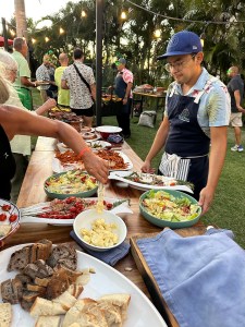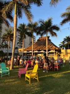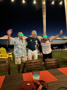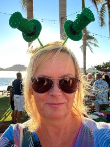 Our guests rested for a few hours then the 3 of, after much deliberation and pressure from Pogo, went to dinner at Sabal Playa. Our friends Jean-Marie and Christiane had organized a dinner there to celebrate birthdays. It was a nice venue on the ocean. They had a buffet which included salad, all kinds of veggies and grilled shrimp, steak, chicken and ribs. Everything was really good and the drinks were all included. Being St Patrick’s Day, they had put green glasses and headbands on the tables and the margaritas were green as well.