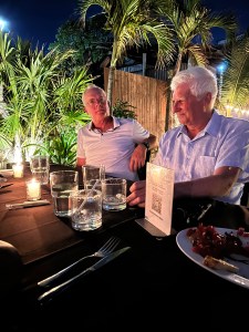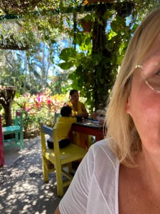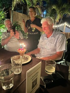 Deidre and I went to Paradise Village to do a little shopping. She bought a beautiful shirt for Derrick’s birthday gift. We picked the guys up at pickleball and drove to Mama Nena for an early afternoon breakfast. Leo, the manager who we always chat with when we go, brought Derrick a birthday cake. I noticed that people sitting around us were wearing the same color shirt as their chairs’ color.
