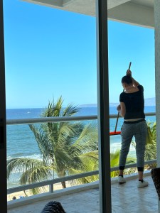 We came back at noon and they were still not finished. They had decided to wash all the windows probably in preparation of the owners coming back for their Easter vacation next week, after our departure. Then another lady came to wash the really dirty glass railing on the balcony. We will definitely not miss all the bird poop on it.