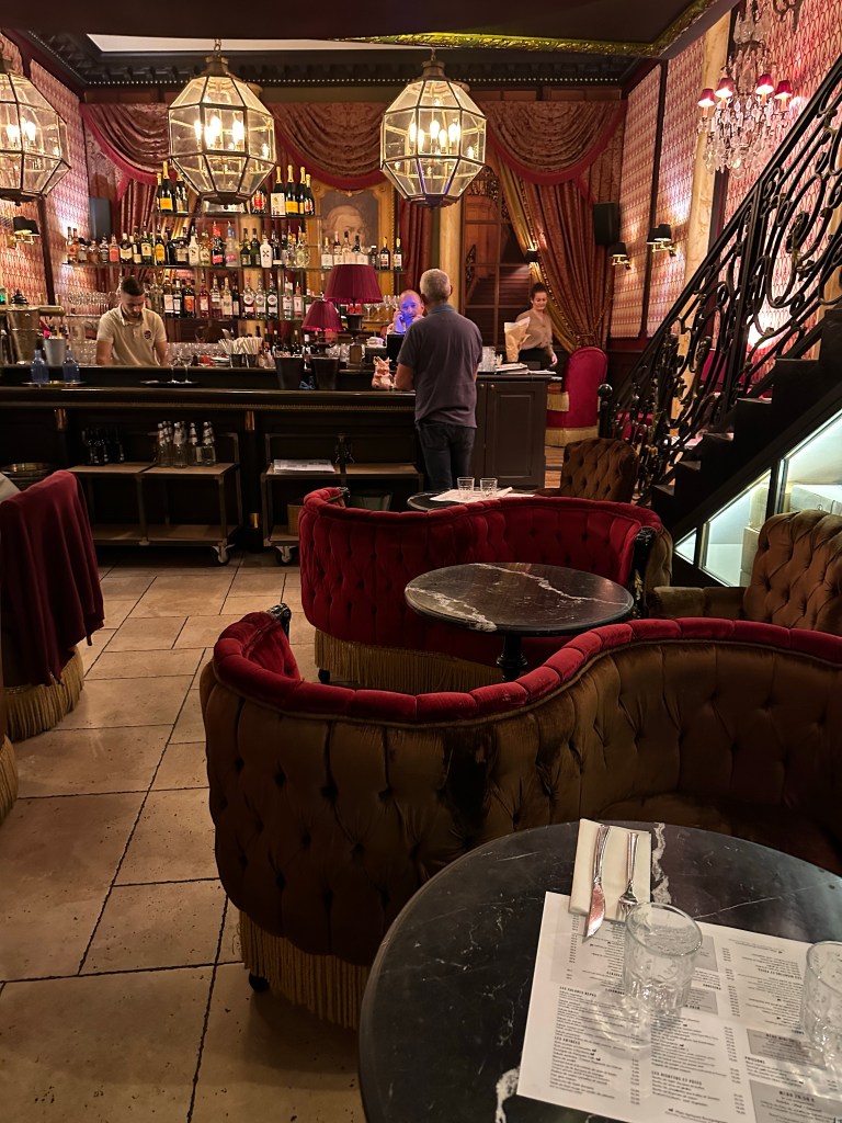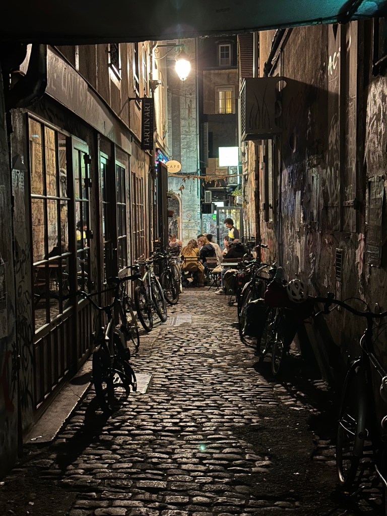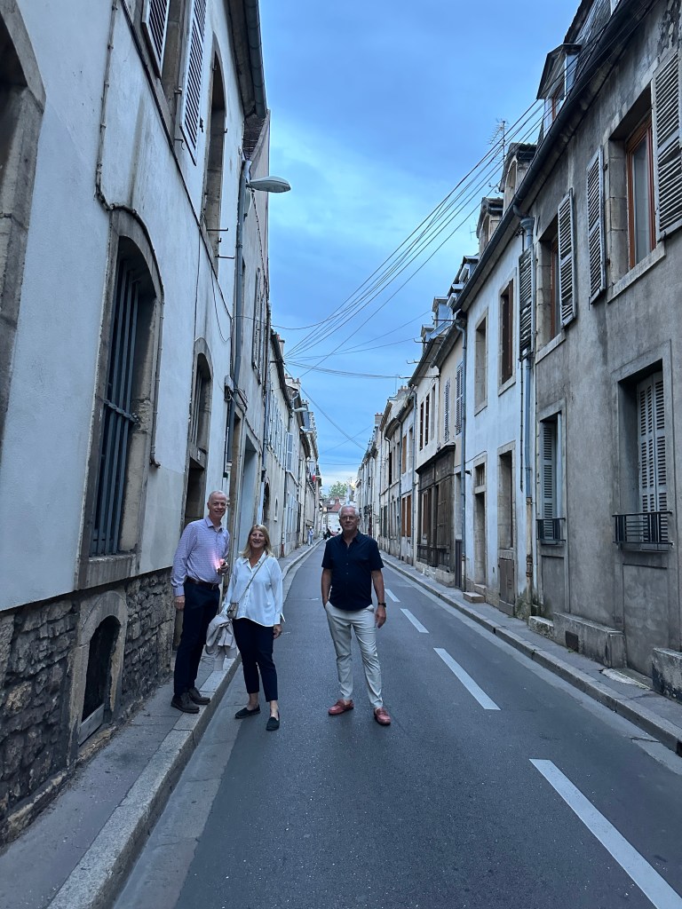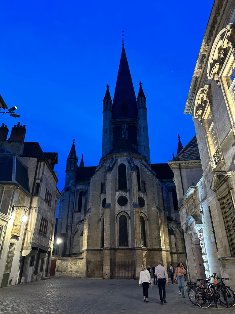 We went to a few restaurants but they were all booked. We finally found a place called Bouillon and it ended up being really good despite the waiter not being very nice. We all had a salad but for Heather who had the pâté de campagne. Then we all had the beef bourguignon, a local dish, but for Bob feeling contrary, who had the fish. We discovered a small part of our Dijon neighborhood at nighttime and I’m looking forward to seeing more of it tomorrow morning.