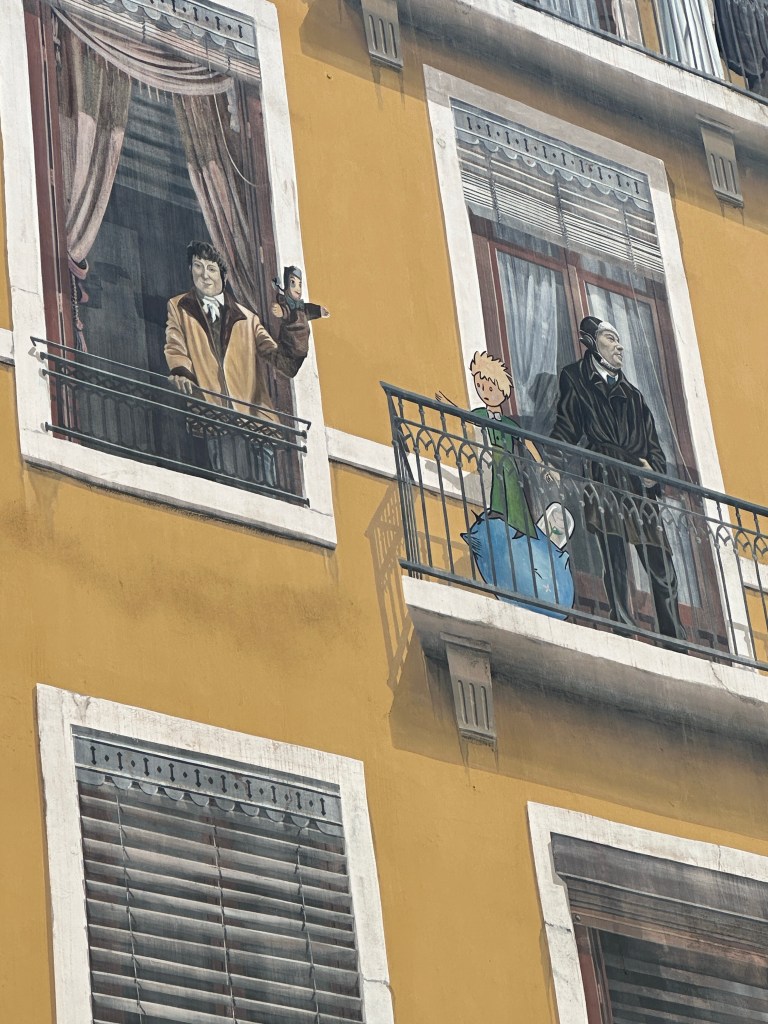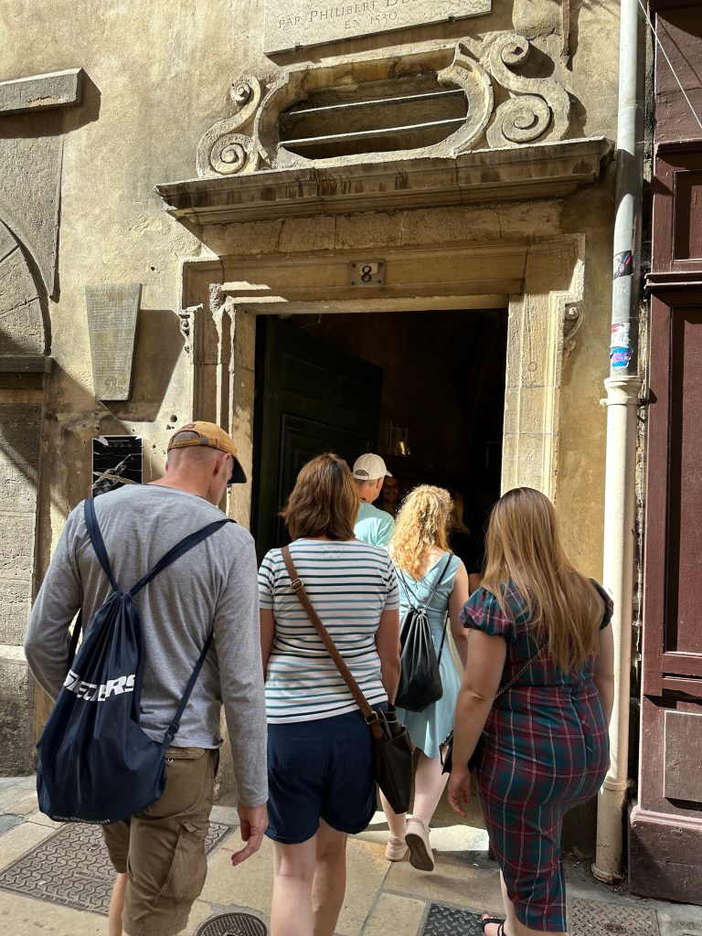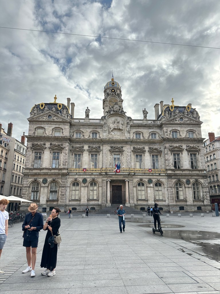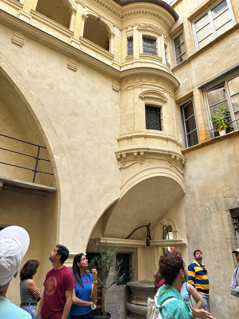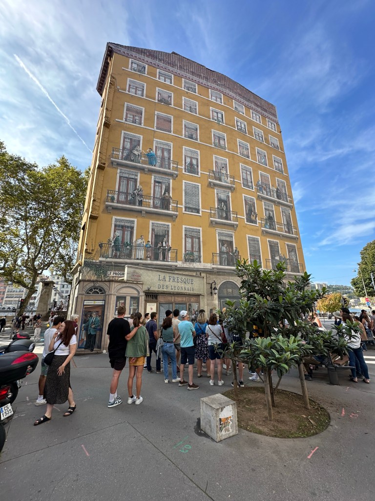 We all walked down, crossed the river and went to Place des Terreaux to meet up with a guide. Hugo and 30 of our new friends walked from there, up to Croix Rousse, saw some Roman ruins, an amazing fresco, walked down the hill, walked back to Old Lyon, walked through 4 Traboules ( hidden passageways) and learned a ton about the city.