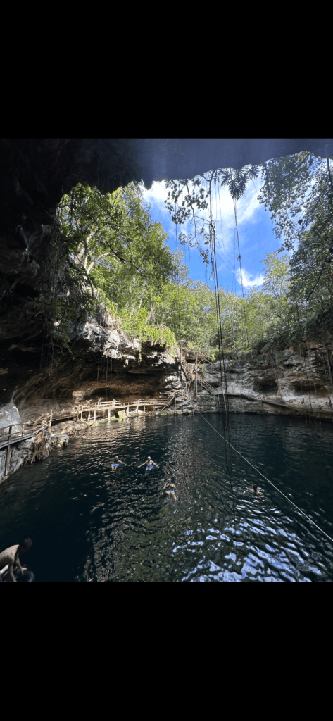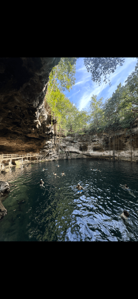 We packed our suitcases and walked to a little café to get coffees then went back to the house to finish picking up, got a little sand sample for our collection and went to Naia for breakfast. We said our goodbyes to El Cuyo then drove 2 1/2 hrs to swim in the beautiful Cenote Xcanche, an open-air cenote located in the Yucatán jungle, about a mile from the Ek Balam archeological site Pogo and I had visited last year.