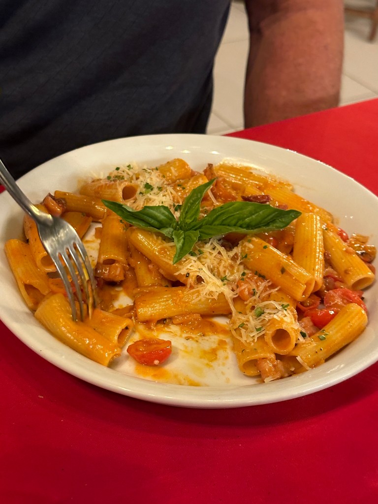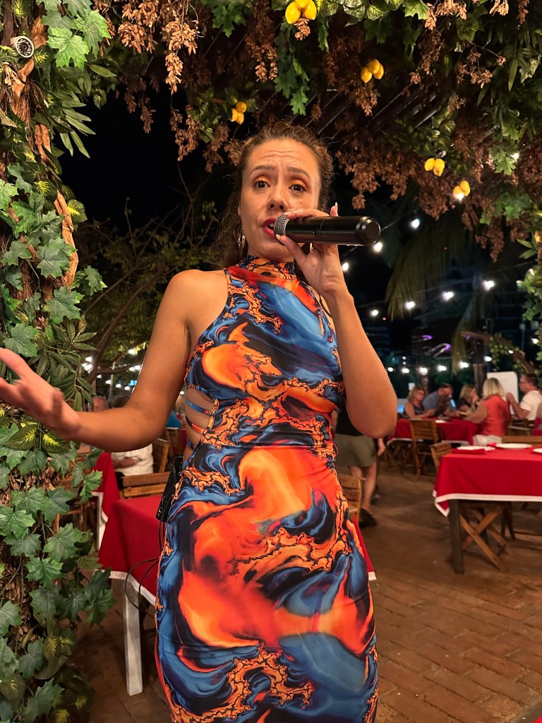 More balconville for the afternoon since the beach and pool were very busy. Before we knew it, it was time for dinner. I wasn’t very hungry but everyone else was so we went to Ciao. Pogo and Deidre had pizza and Derrick and I had pasta. They had an amazing singer who sang some Abba, Celine Dion, opera, you name it, she could sing it.