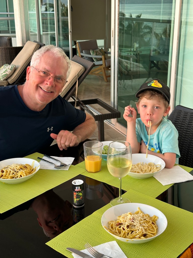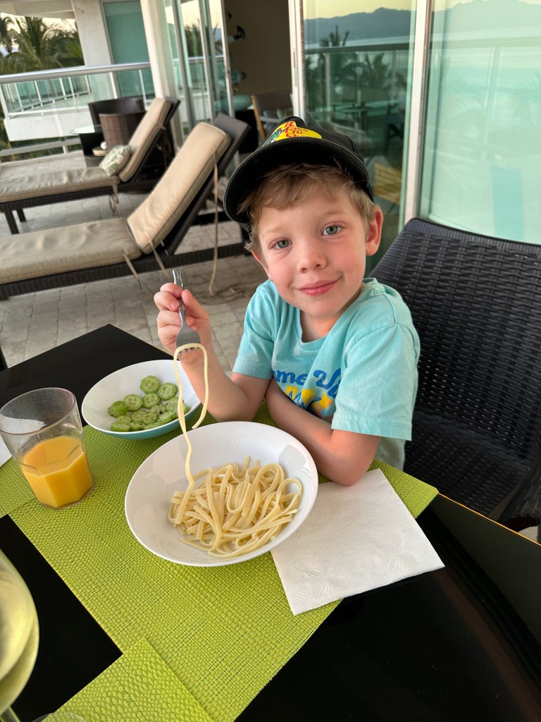 We did more balconville then Ryan came over for dinner while his parents and grandparents were going out. We were having pasta carbonara but he wanted plain pasta, and I mean plain, no butter no cheese, which he thought was very delicious. He colored, we played cards and we watched funny animals youtube videos on tv. We all had a great time!