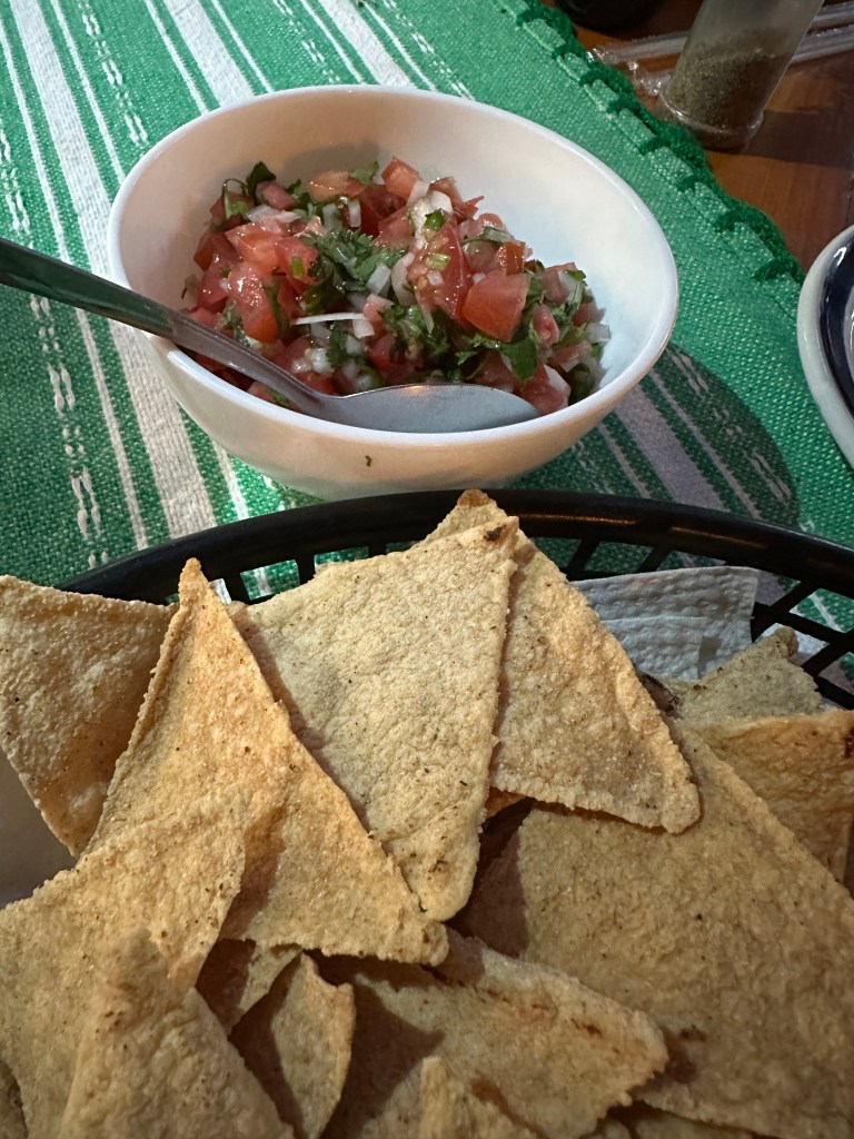 We were still full from our late lunch so we just had chips and salsa and watched the first episode of the series The Tourist.