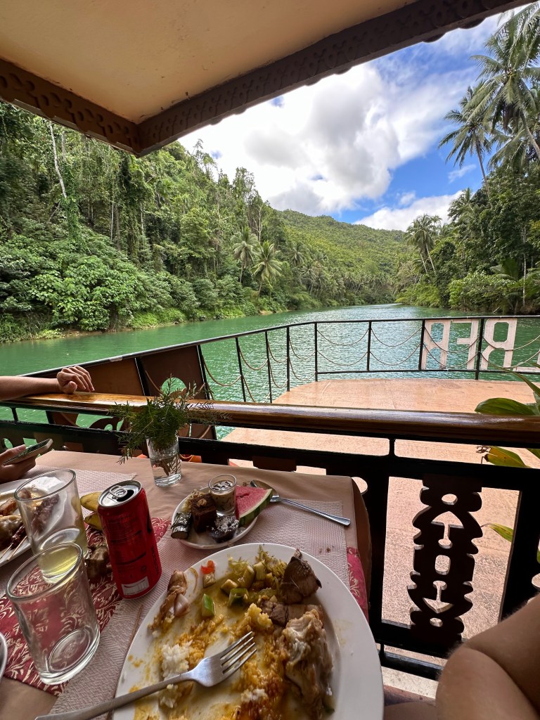 – Loboc River: Known for its picturesque river cruises, the Loboc River winds through lush greenery, wildlife habitats, and traditional Filipino villages. The 1.5 hour cruise (essentially a floating restaurant) is a unique dining experience, serving local Filipino cuisine while cruising along the river listening to live local music and seeing some cultural performances.
