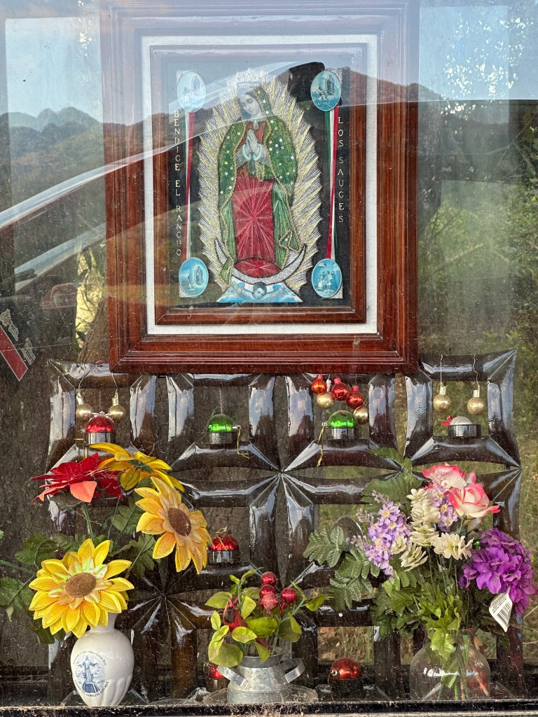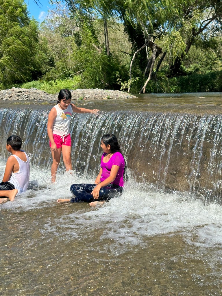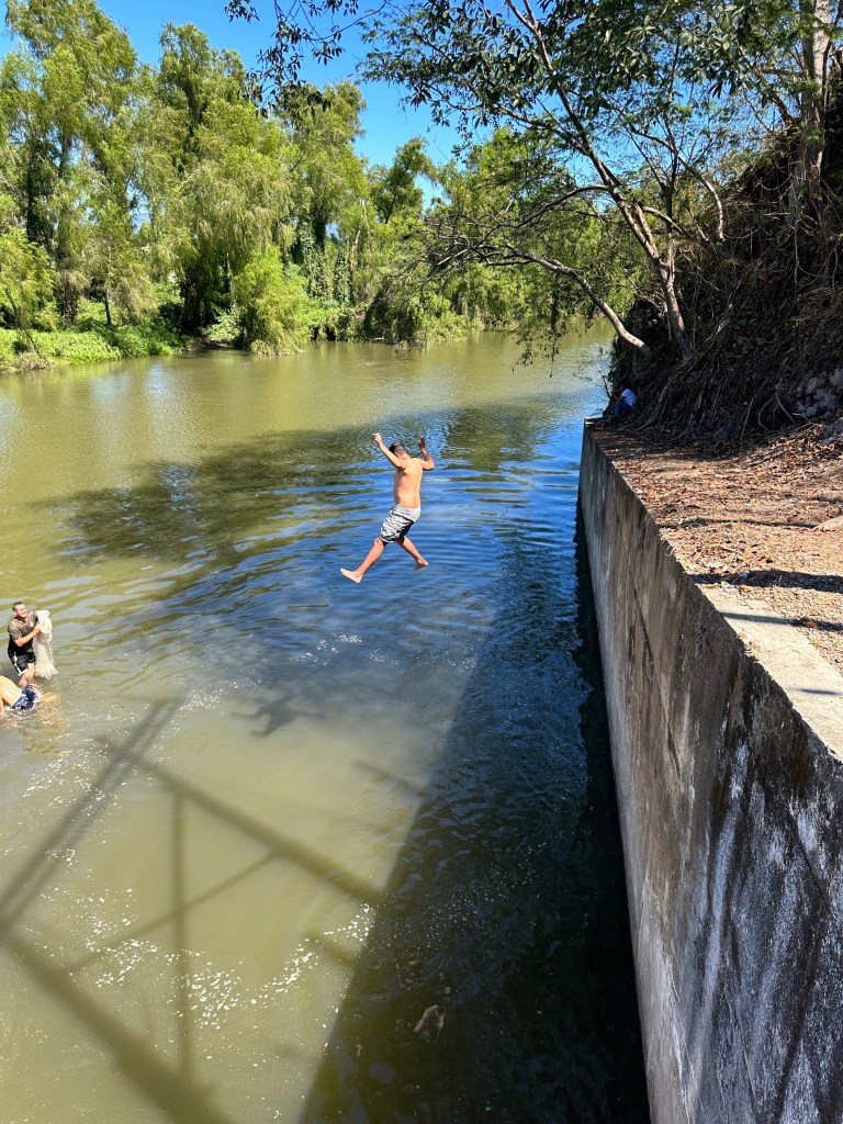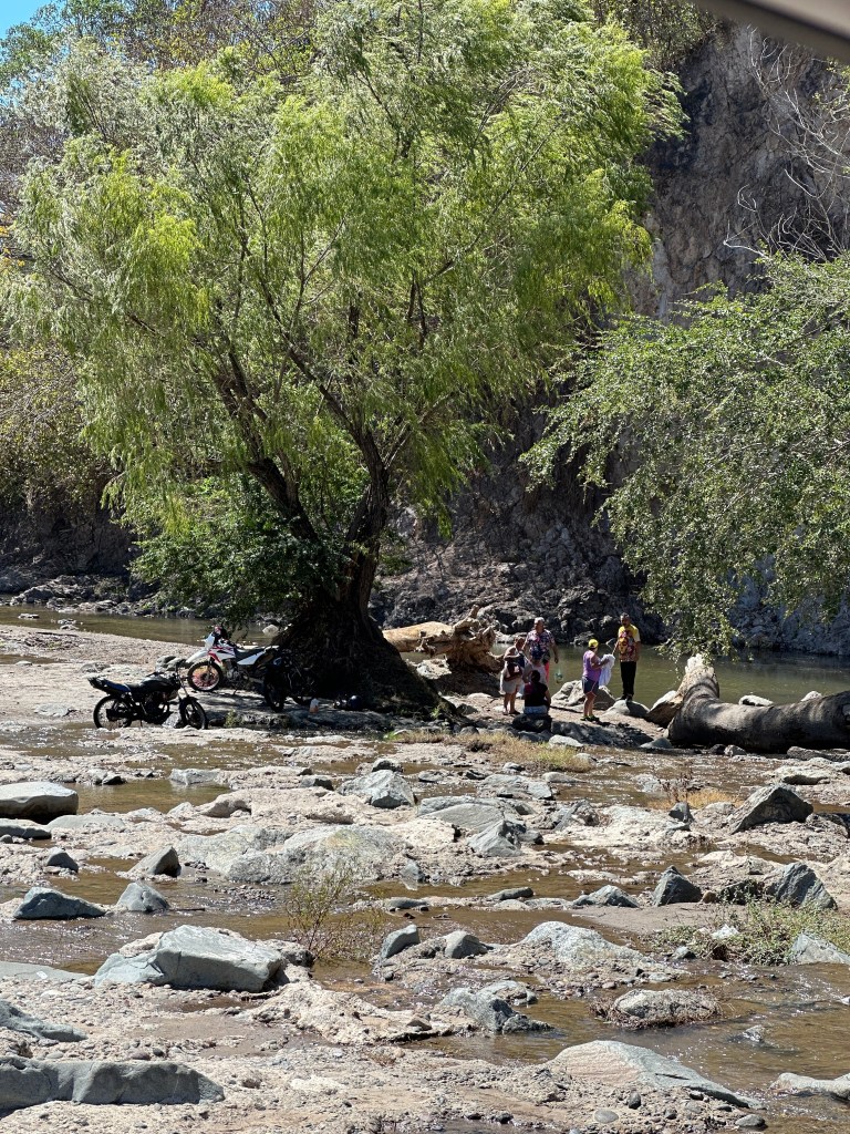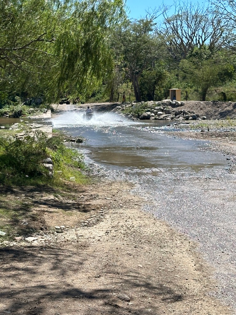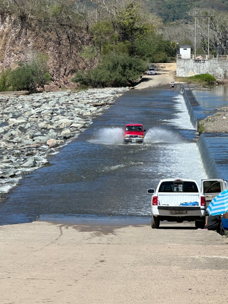 We continued on our drive, I took plenty of pictures of caballeros, churches, flowers, stores, cute kids, fairs, etc. When we arrived at the drivable water dam at El Coatante that crosses the Ameca river, the water was flowing over like a waterfall. We had never seen it so strong. People were enjoying driving through it and splashing everywhere. Some side by sides, were having a blast. The people were drenched and kept going back and fort. We watched a fisherman throwing his net for a while until his kids decided to jump in the water. We continued on the road and ran into a caballero. Pogo asked him if he could take his picture. His name was Raoul. It turned out that he was the brother and co-owner of the place that we like to take pictures of the amazing tree overlooking the river. In all of our years driving there, the gate of their property has been opened only twice. This year, it happened to be opened and we talked to his brother who was just as friendly. We found out that they used to live in Salt Lake City for 20 years with their other three brothers but the two of them came back and bought that beautiful ranch. The buildings need work but the property is breathtaking. Their brothers are still in the States. Raoul said to stop by again for a coffee or a beer next time we drive by.