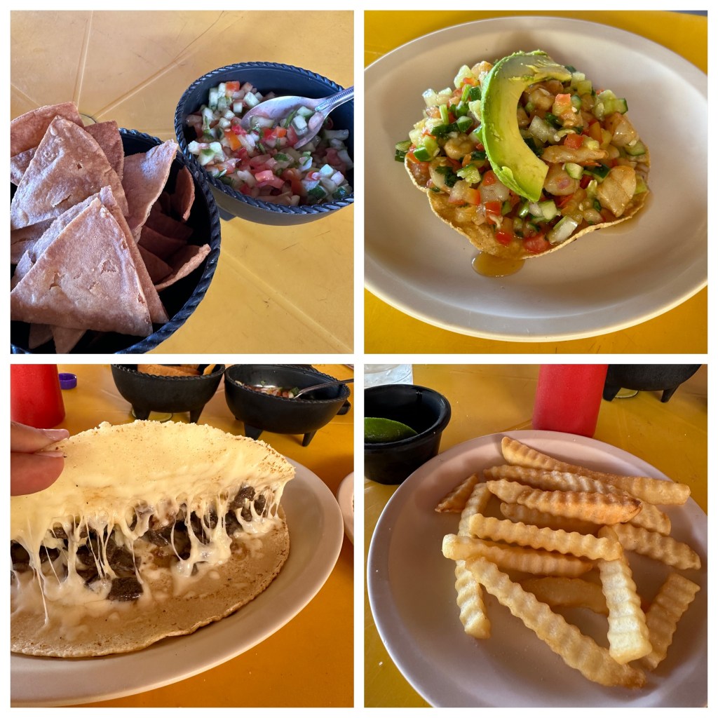 We made our way to Pogo’s favorite out of the way restaurant, the Ameca River Restaurant. It was pretty full with locals being a Sunday. Loud Mexican music was playing on the jukebox. A couple arrived, set up their computer and speakers and started singing Mexican folkloric songs. We had pico de gallo, a shrimp ceviche tostada, a steak quesadilla, French fries and 2 sodas for only 190 pesos ($11 usd). By the time we left at 3:45pm, the place was full! What a fun experience!