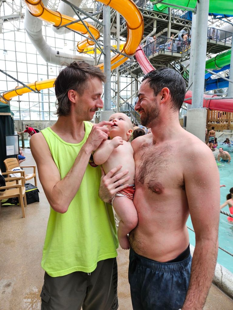 Shaun and Sarah spent the day with Tommy and Lauren at the waterpark in Jay Peak and he sent me a funny picture of him and Tommy holding baby Tommy. He said they looked like the gay couple that just moved in next door. Haha! To me, it looks like baby Tommy is admiring Shaun’s haircut :).