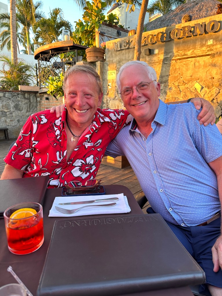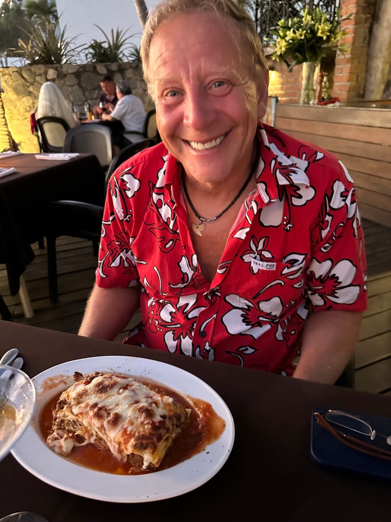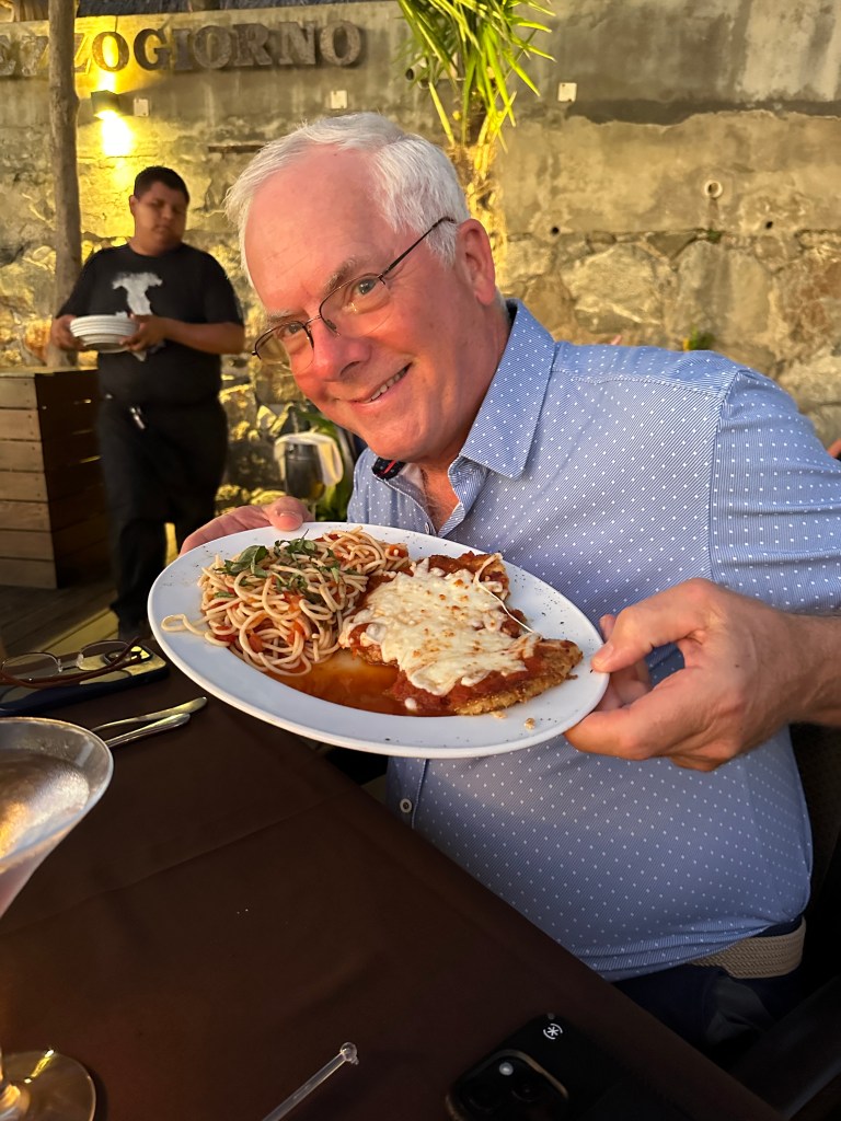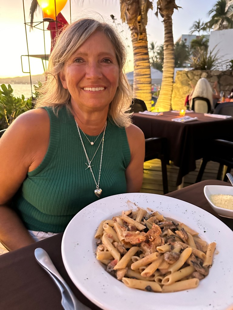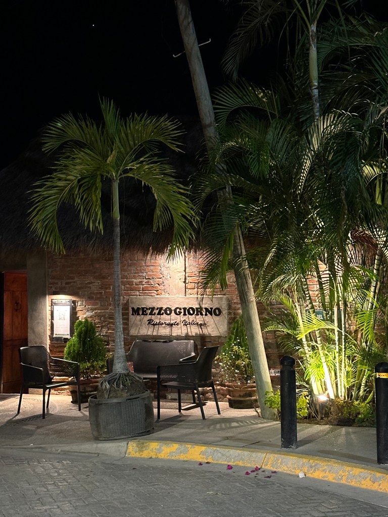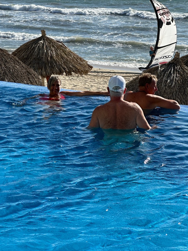 Tuesday morning, Pogo went to pickleball and I went to the market with Josée. We were there for a few hours. We might have bought a few shiny thingies. After lunch, we sat on the beach for awhile. We went to play dice by the pool and the boys won again. We took a quick dip in the pool then got ready to go to Bucerias to take Mario and Josée to dinner at Mezzogiorno, our gift for their 25th wedding anniversary. We had an excellent meal and just as much fun as we always have together. We stopped for churros on our way out of town because, duh!