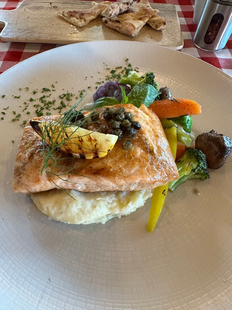 We had an early dinner at Tarantella and I tried the salmone al limone, a salmon with a lemon sauce with dill and capers with parmesan mashed potatoes and veggies. Pogo tried the cannelloni allo zafferano, cannelloni stuffed with shrimp and ricotta with a creamy saffron sauce and mushroom. It is becoming one of our favorite restaurant. We had tried it last year when they opened, and had not been impressed but the food has really improved. We brought back lasagnas and caesar salad for our friends.