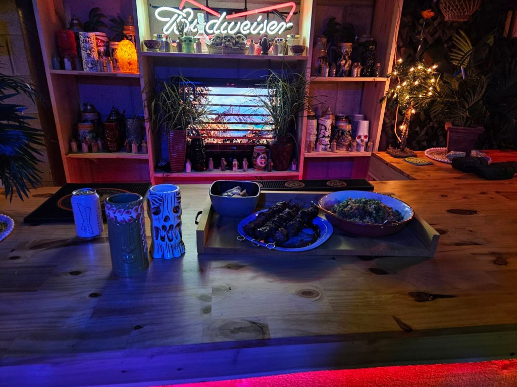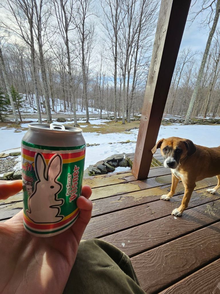 Shaun had a big raise at work and celebrated with a beer outside with Penny (it looked like the snow he got a few days ago was melting away) and a tiki dinner in his downstairs bar.