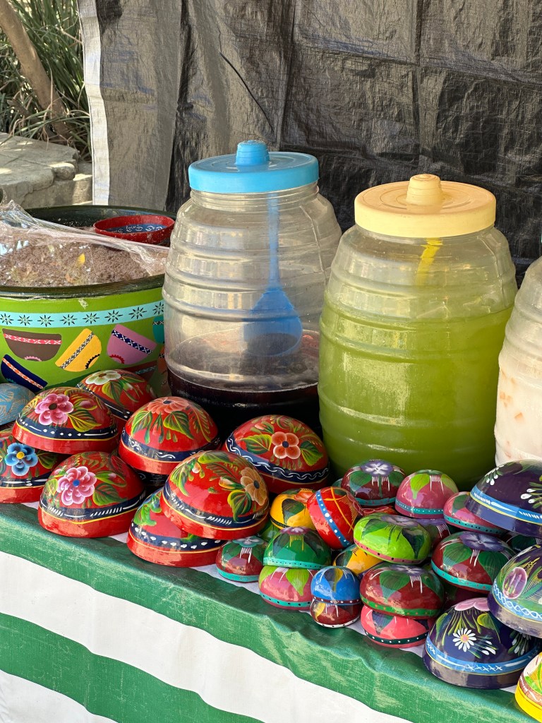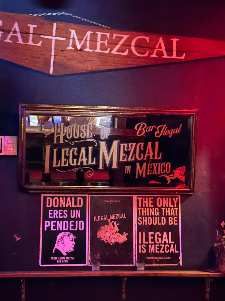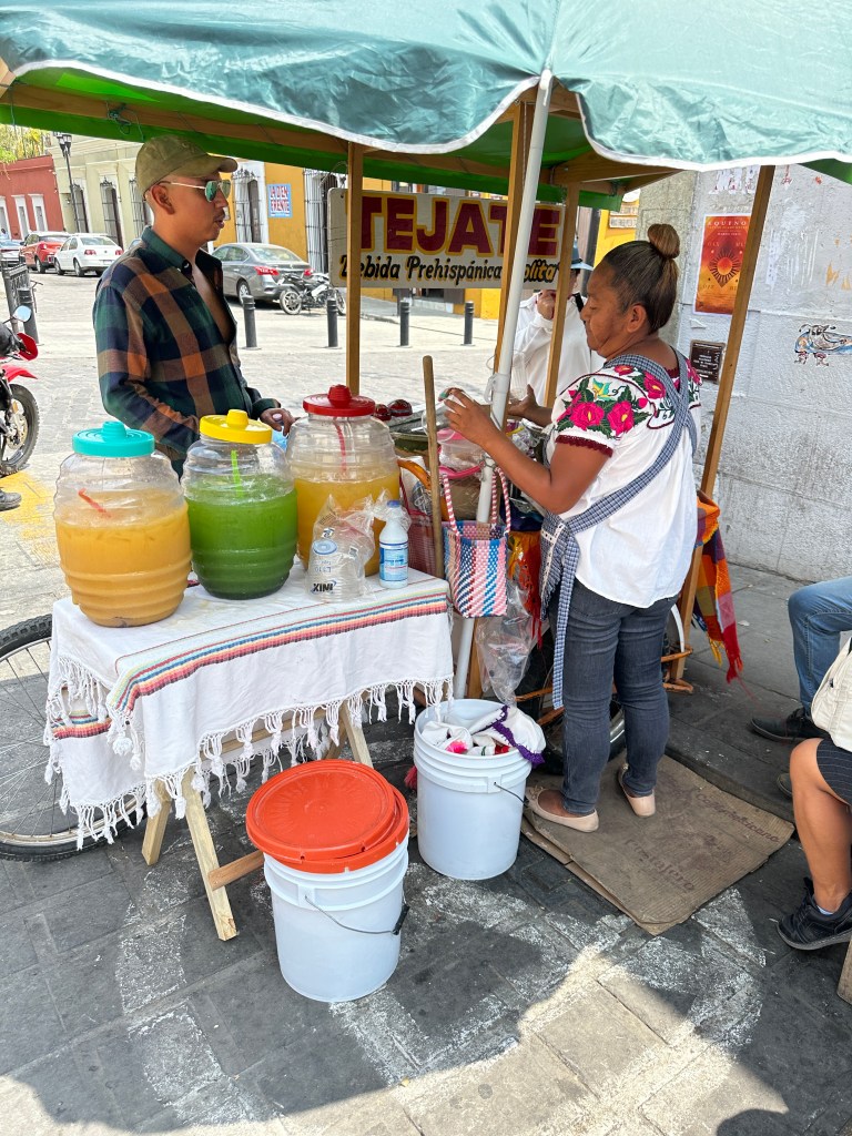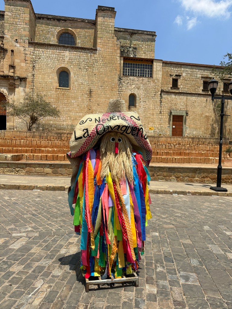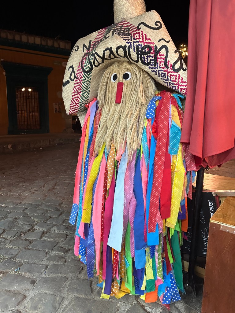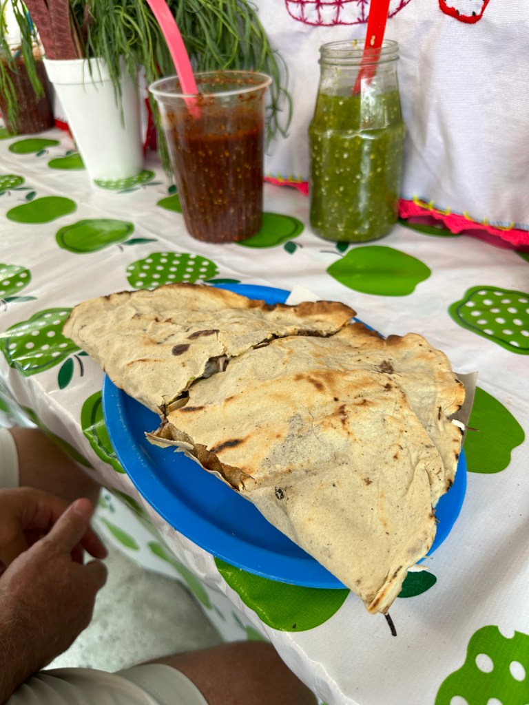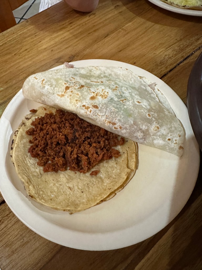 We went back to the hotel to rest. Oaxaca has been going through a heatwave, it’s been in the 90s and very humid so we have been needing air conditioning once in awhile. Pogo took his usual nap and I started writing my other blog. It took me forever to go through my pictures, I took so many. Later on, we went for a walk to go to some markets Max had told us about but we went to the wrong ones and they were closed. We stopped at a street stall to have a quick bite to eat and shared a tlayuda. It was humongous and not very good. We had a few bites to be polite but left most of it in our plate. We were back at the hotel around 6pm. Max had just arrived there as well. She had to do more work so we just hung out, watched another parade, a wedding, go right by our window this time and went to dinner at 7:30pm. We had called a taxi to bring us to a little restaurant called Taqueria Tacomer. We all had the Al Pastor tacos but I also tried a chorizo taco. We then walked to a taco cart where they sold only pork tacos so we tried a pork taco with chicharron (crispy pork rind). On our way back, we stopped at a mezcal bar that had interesting art inside. We just walked slowly, people watched by Santo Domingo and took picture of the almost full moon. We went to a bar. We stop to get a dorilocos, a bag of doritos filled with corn, mayonnaise, 2 sauces, and cheese. It was actually good. We went to bed early because we were planning on getting up early the next day.