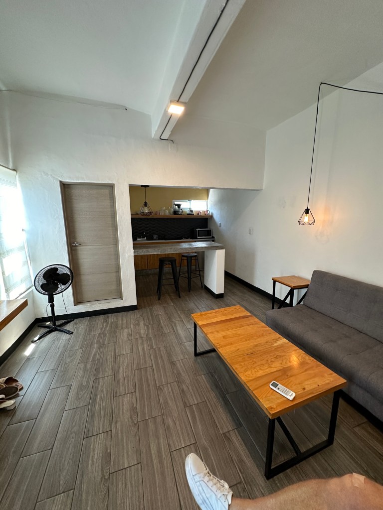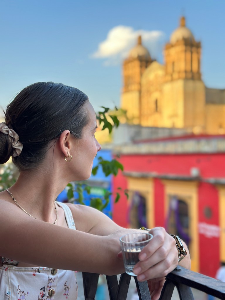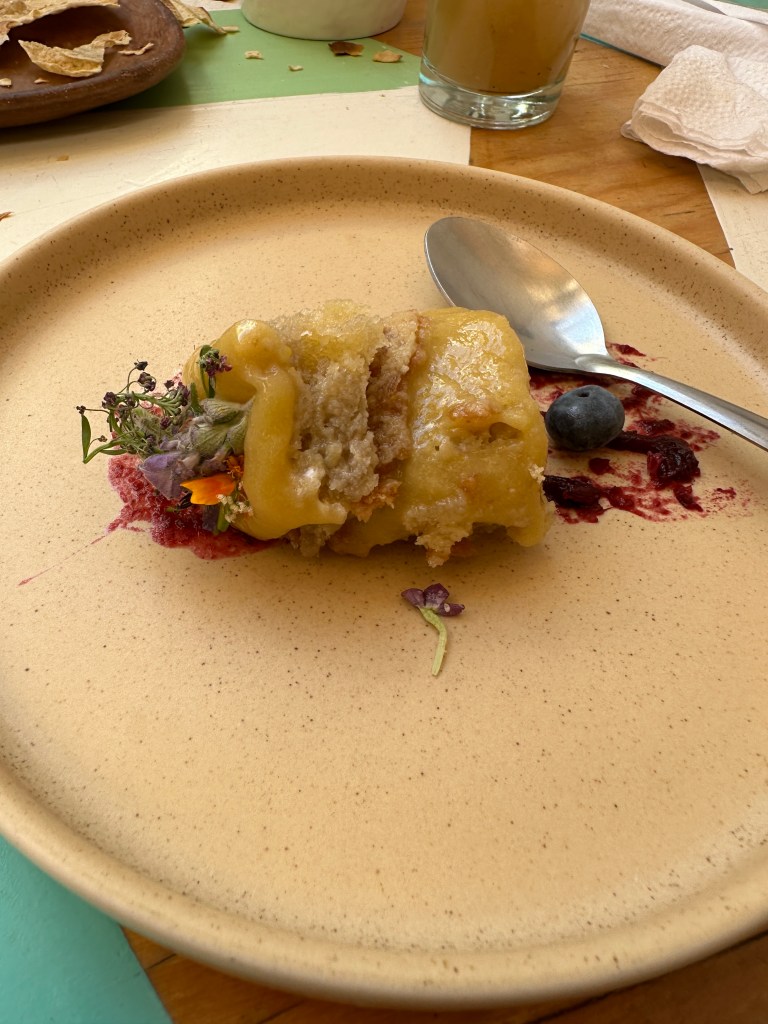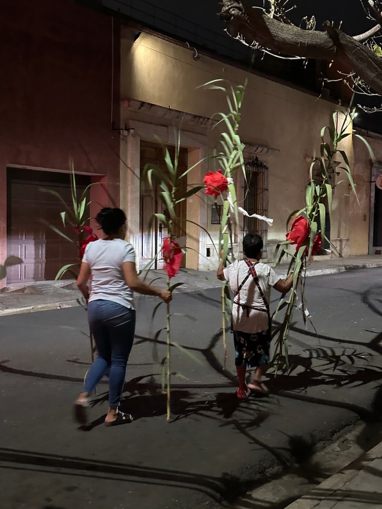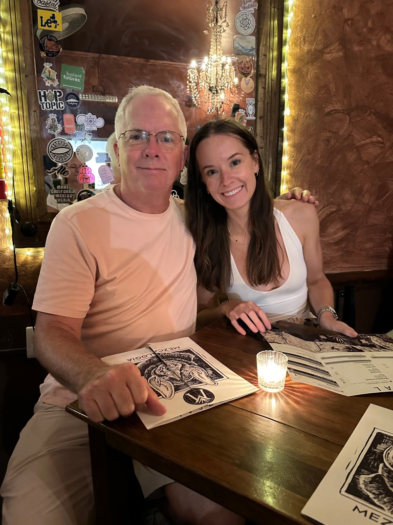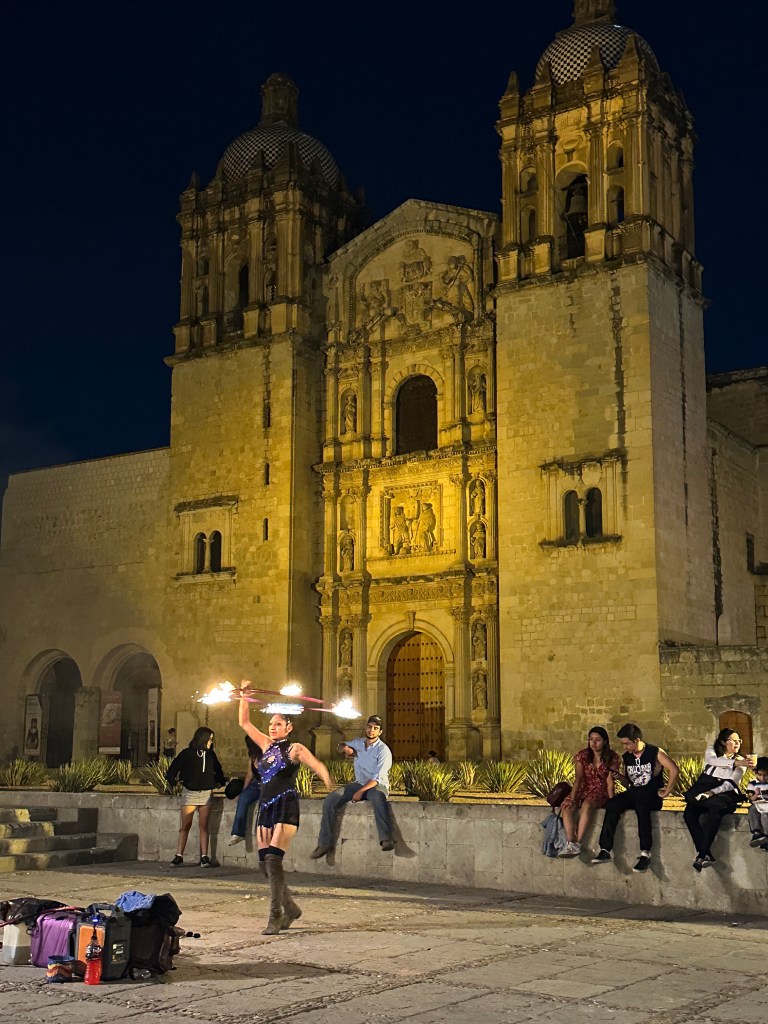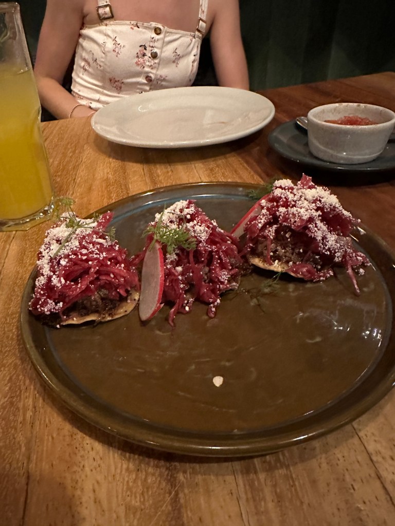 We went back to the hotel to rest. Oaxaca has been going through a heatwave, it’s been in the 90s and very humid so we have been needing air conditioning once in awhile. Pogo took his usual nap and I started writing my other blog. It took me forever to go through my pictures, I took so many. Later on, we went for a walk to go to some markets Max had told us about but we went to the wrong ones and they were closed. We stopped at a street stall to have a quick bite to eat and shared a tlayuda. It was humongous and not very good. We had a few bites to be polite but left most of it in our plate. We were back at the hotel around 6pm. Max had just arrived there as well. She had to do more work so we just hung out, watched another parade, a wedding, go right by our window this time and went to dinner at 7:30pm. We had called a taxi to bring us to a little restaurant called Taqueria Tacomer. We all had the Al Pastor tacos but I also tried a chorizo taco. We then walked to a taco cart where they sold only pork tacos so we tried a pork taco with chicharron (crispy pork rind). On our way back, we stopped at a mezcal bar that had interesting art inside. We just walked slowly, people watched by Santo Domingo and took picture of the almost full moon. We went to a bar. We stop to get a dorilocos, a bag of doritos filled with corn, mayonnaise, 2 sauces, and cheese. It was actually good. We went to bed early because we were planning on getting up early the next day.