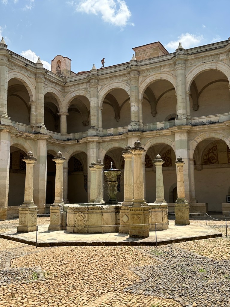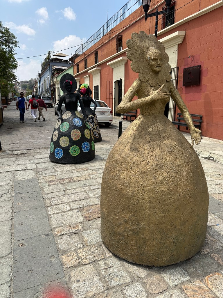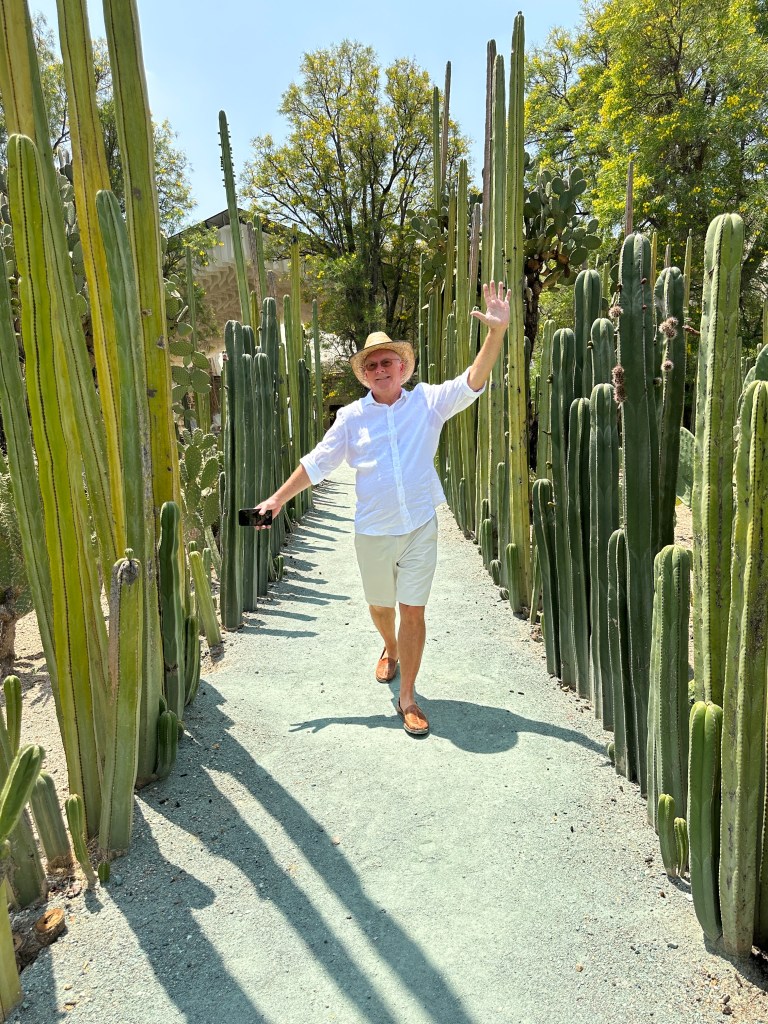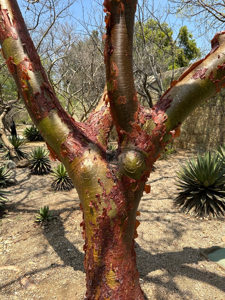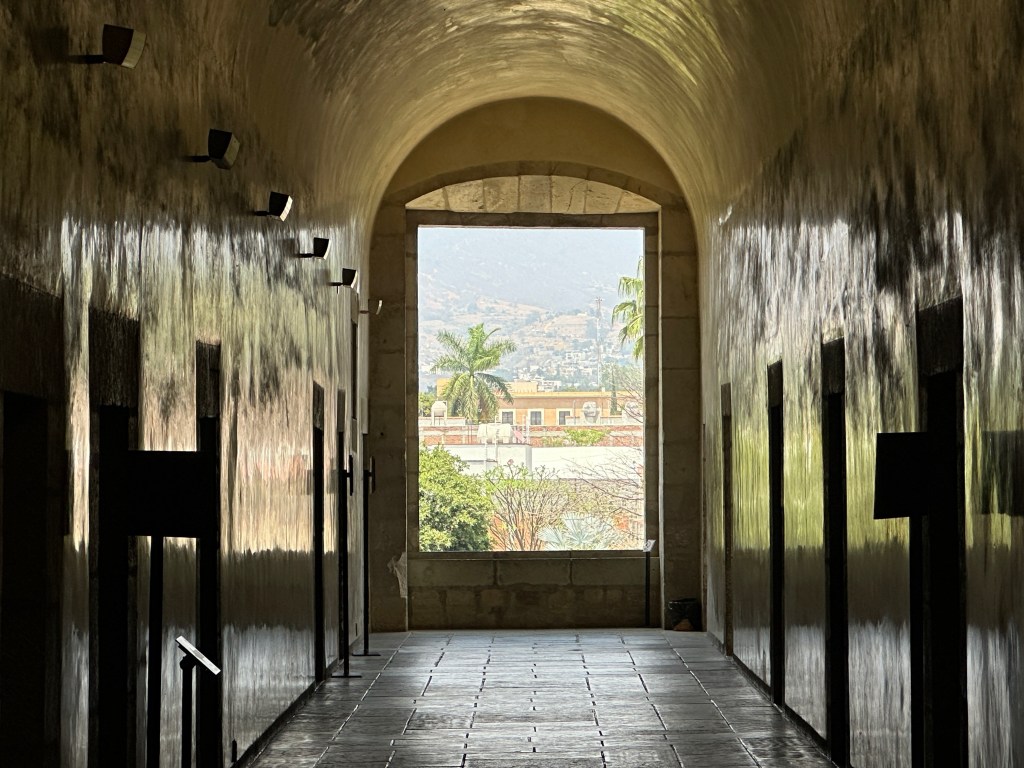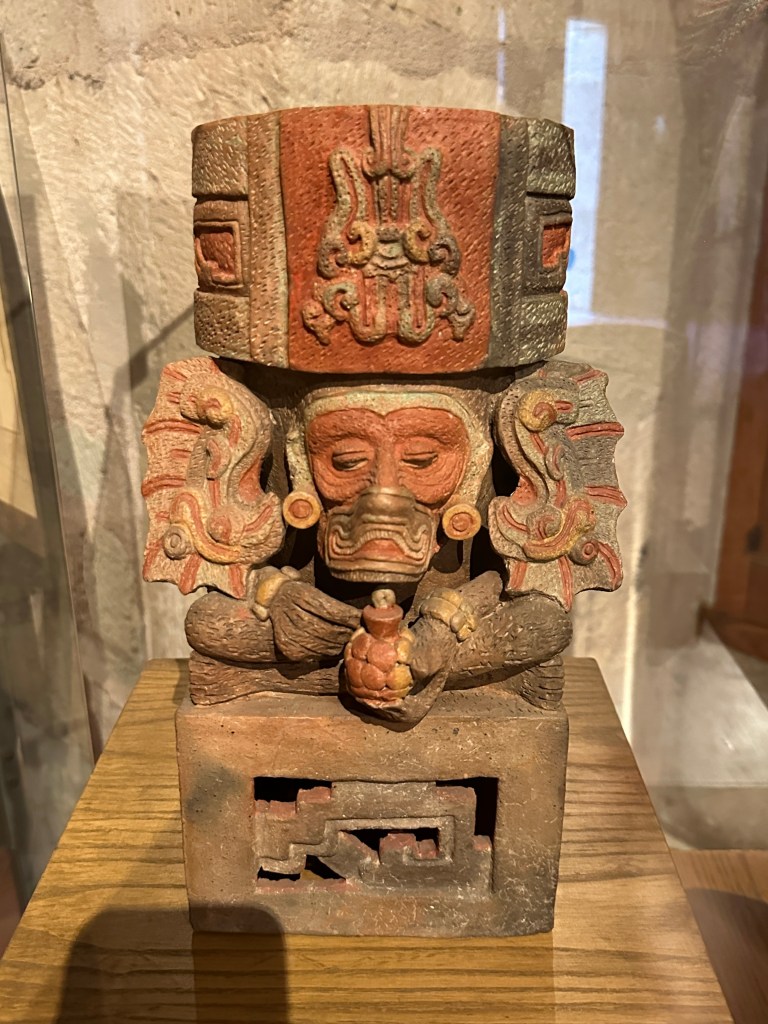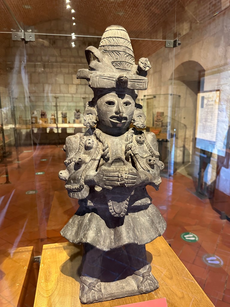We went to the botanical gardens finally for the 11am tour. You can visit only with tour guides. The English tour was full so we went with the Spanish tour. I didn’t understand much so I decided to just take pictures. I ended up being the mother of an influencer, my favorite photography work. We were there for an hour. Max then went to a café to work and Pogo and I went to the Museo de las Culturas de Oaxaca (Museum of Oaxacan Cultures) in the beautiful monastery buildings adjoining the Templo de Santo Domingo. The most interesting part to me was seeing the treasure found in tomb 7 at Monte Alban, an archaeological site we visited the last time we were here. Dating from the 14th century and discovered in 1932, a king and his sacrificed servants were found with a stash of silver, turquoise, coral, jade, amber, pearls finely carved bones, crystal goblets, a skull covered in turquoise and lots of gold. We spent another hour there. It could have been longer but without a guide, it was not easy to understand any of the displays.
