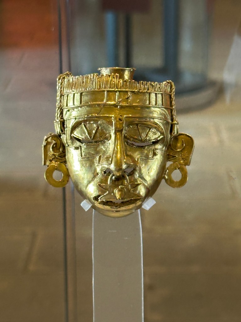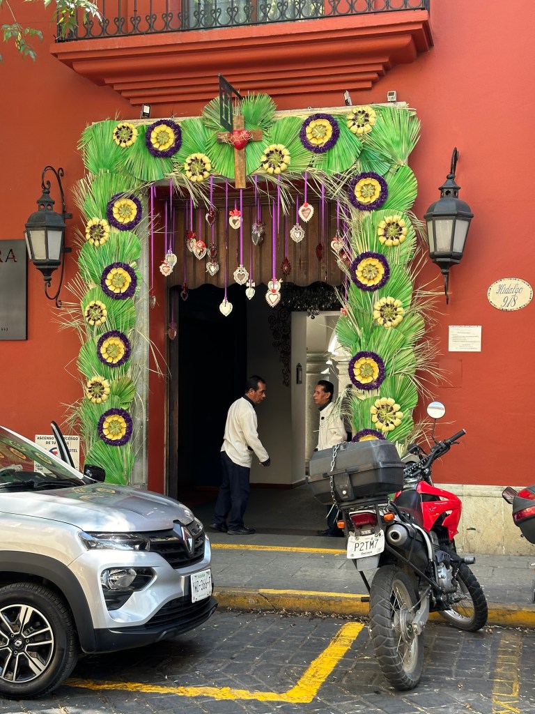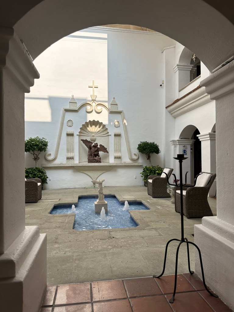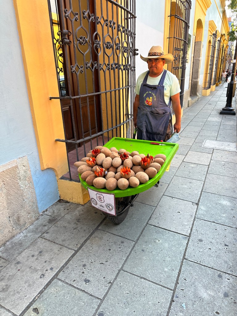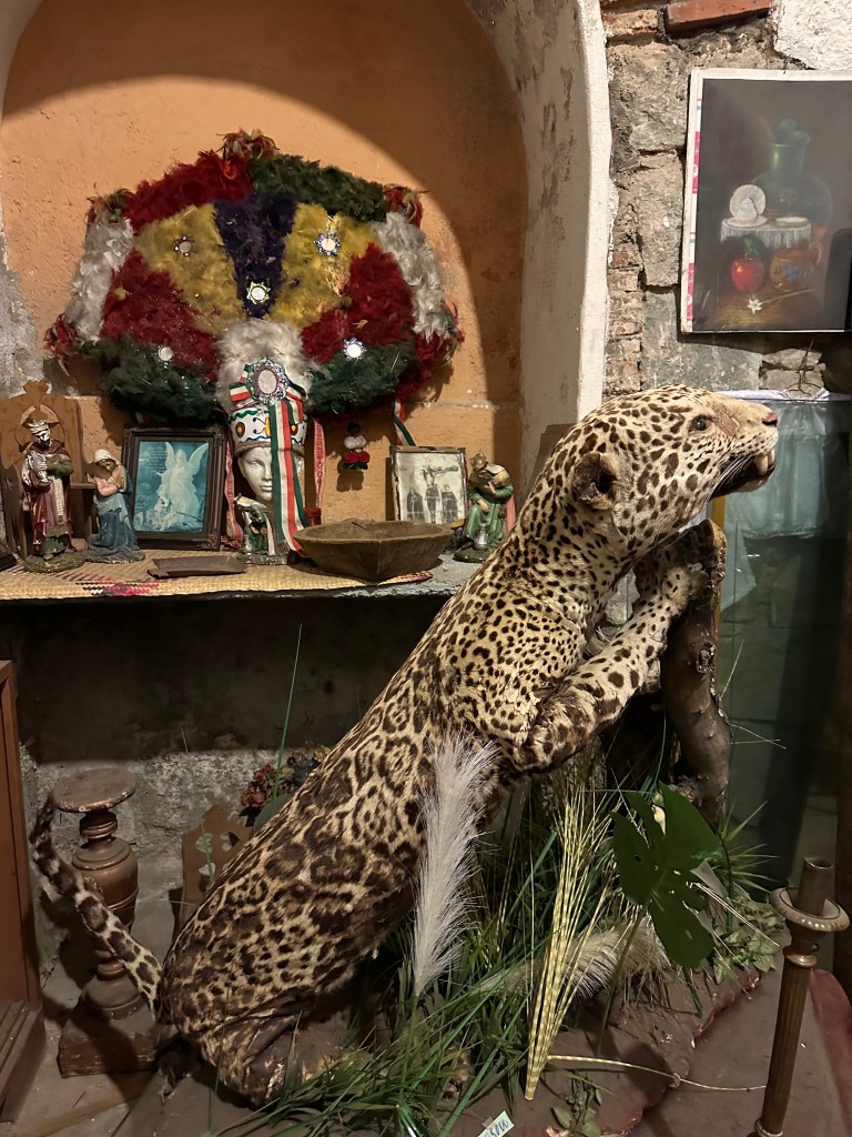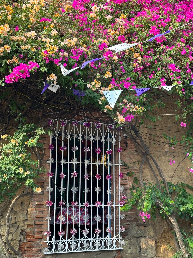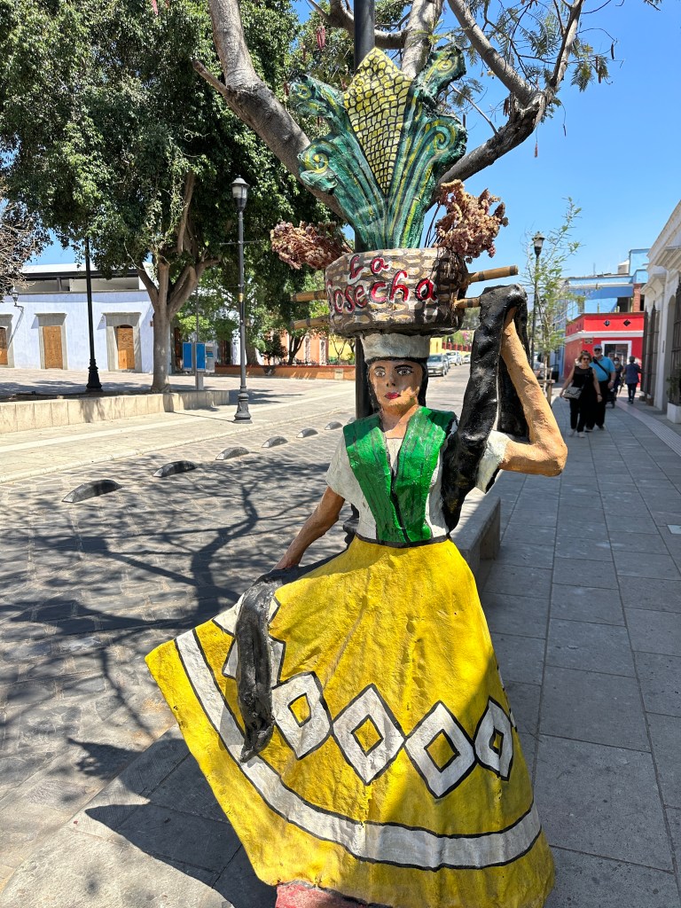 We went to the botanical gardens finally for the 11am tour. You can visit only with tour guides. The English tour was full so we went with the Spanish tour. I didn’t understand much so I decided to just take pictures. I ended up being the mother of an influencer, my favorite photography work. We were there for an hour. Max then went to a café to work and Pogo and I went to the Museo de las Culturas de Oaxaca (Museum of Oaxacan Cultures) in the beautiful monastery buildings adjoining the Templo de Santo Domingo. The most interesting part to me was seeing the treasure found in tomb 7 at Monte Alban, an archaeological site we visited the last time we were here. Dating from the 14th century and discovered in 1932, a king and his sacrificed servants were found with a stash of silver, turquoise, coral, jade, amber, pearls finely carved bones, crystal goblets, a skull covered in turquoise and lots of gold. We spent another hour there. It could have been longer but without a guide, it was not easy to understand any of the displays.