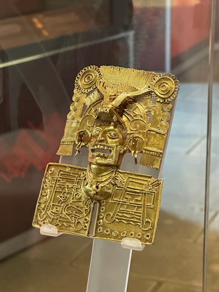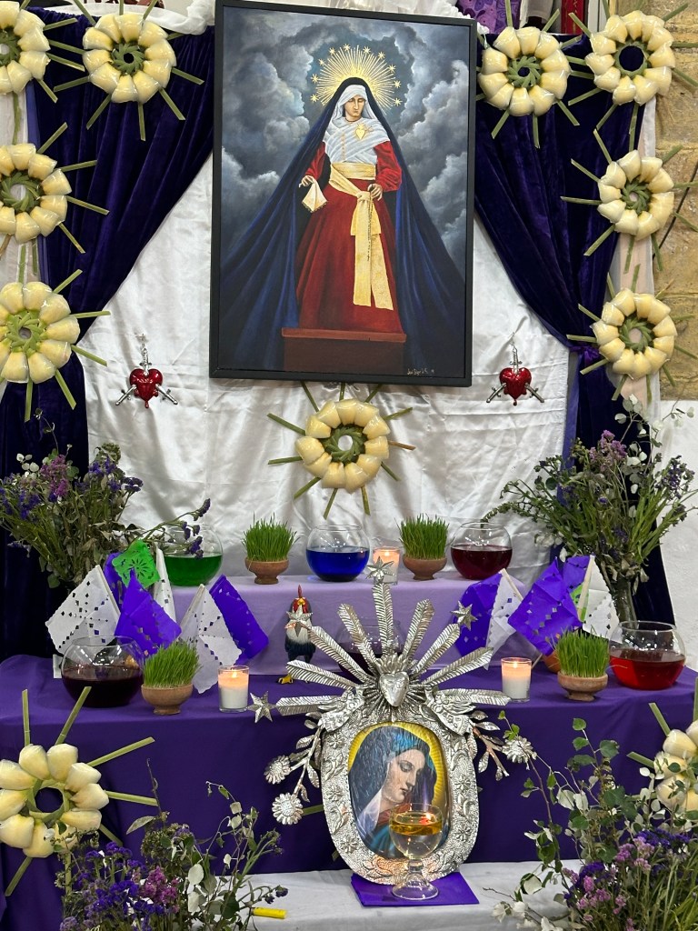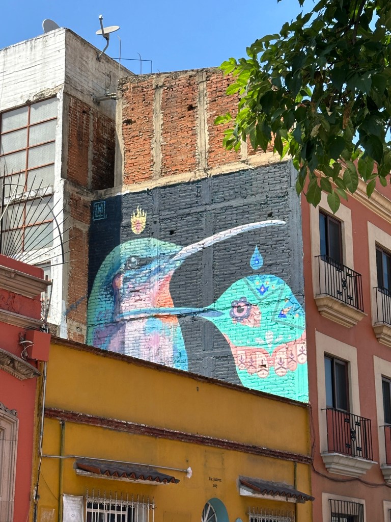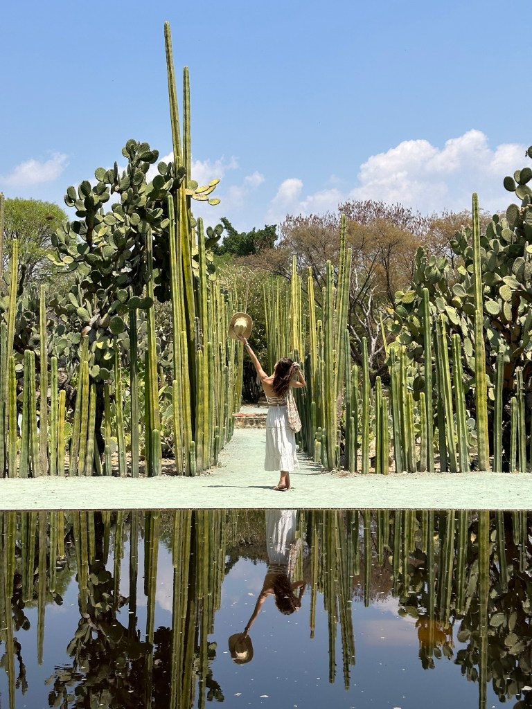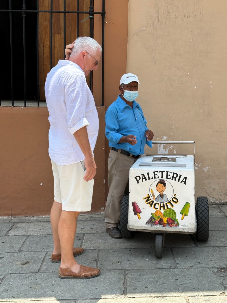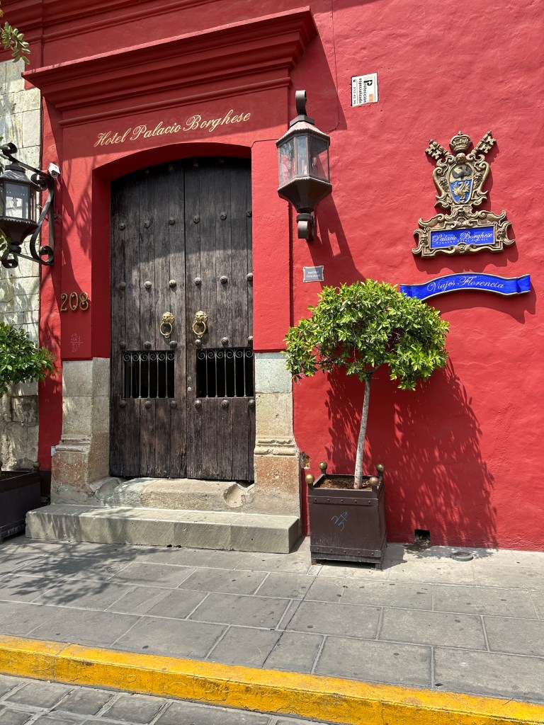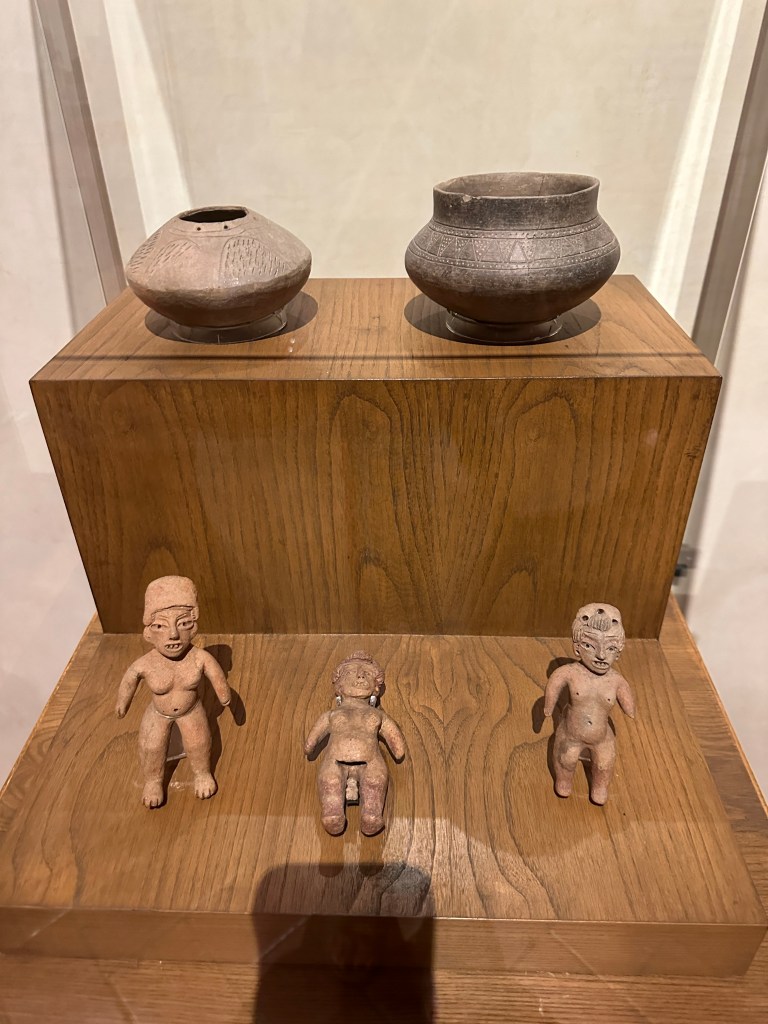 We went to the botanical gardens finally for the 11am tour. You can visit only with tour guides. The English tour was full so we went with the Spanish tour. I didn’t understand much so I decided to just take pictures. I ended up being the mother of an influencer, my favorite photography work. We were there for an hour. Max then went to a café to work and Pogo and I went to the Museo de las Culturas de Oaxaca (Museum of Oaxacan Cultures) in the beautiful monastery buildings adjoining the Templo de Santo Domingo. The most interesting part to me was seeing the treasure found in tomb 7 at Monte Alban, an archaeological site we visited the last time we were here. Dating from the 14th century and discovered in 1932, a king and his sacrificed servants were found with a stash of silver, turquoise, coral, jade, amber, pearls finely carved bones, crystal goblets, a skull covered in turquoise and lots of gold. We spent another hour there. It could have been longer but without a guide, it was not easy to understand any of the displays.