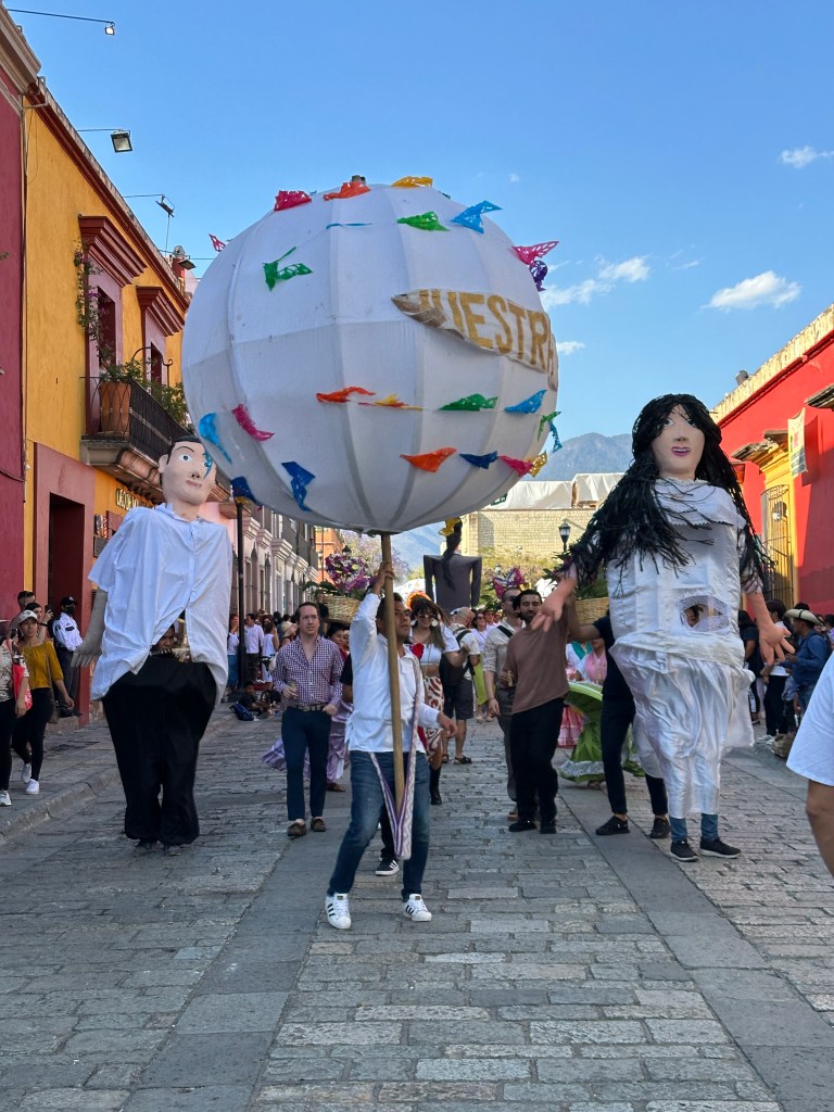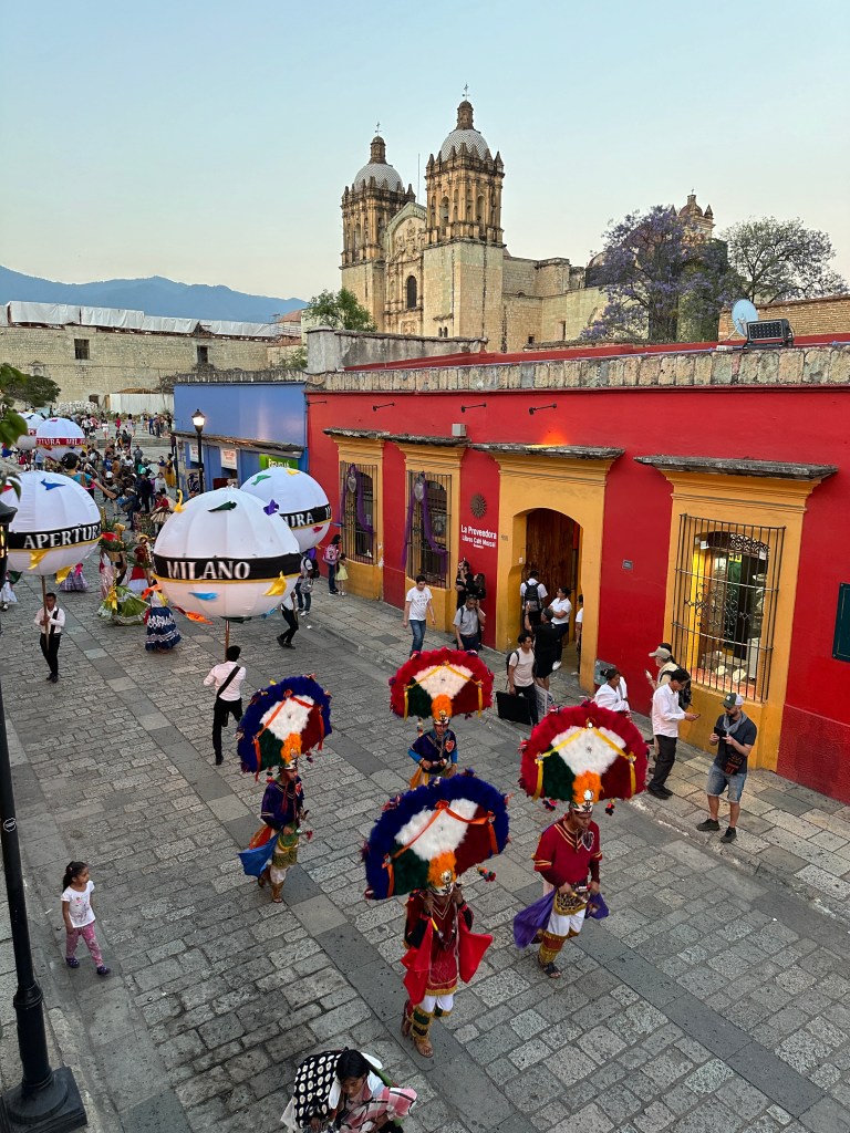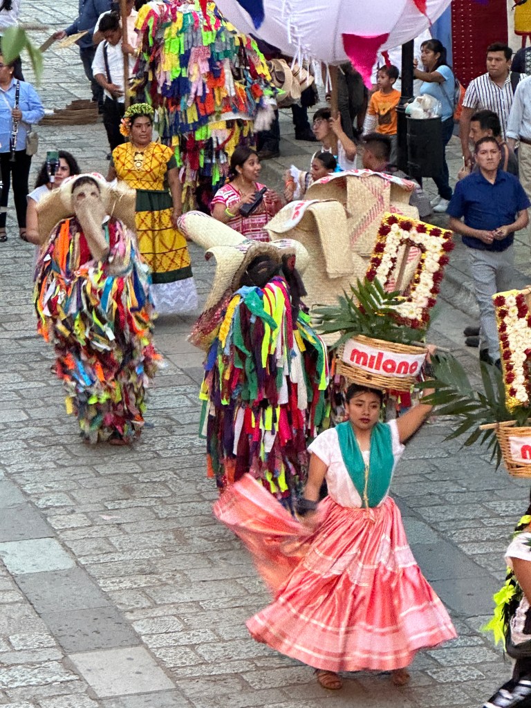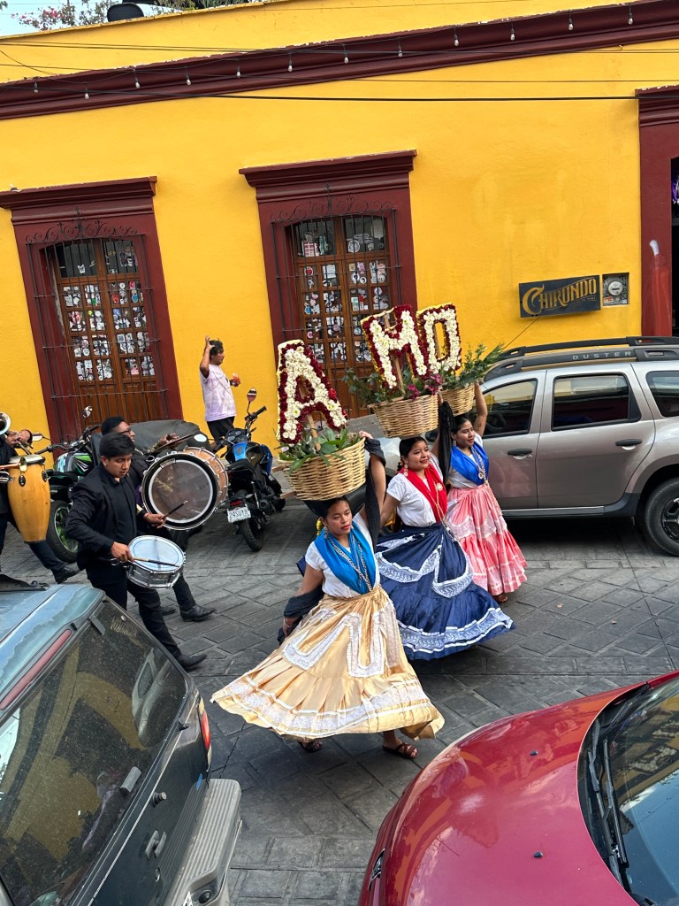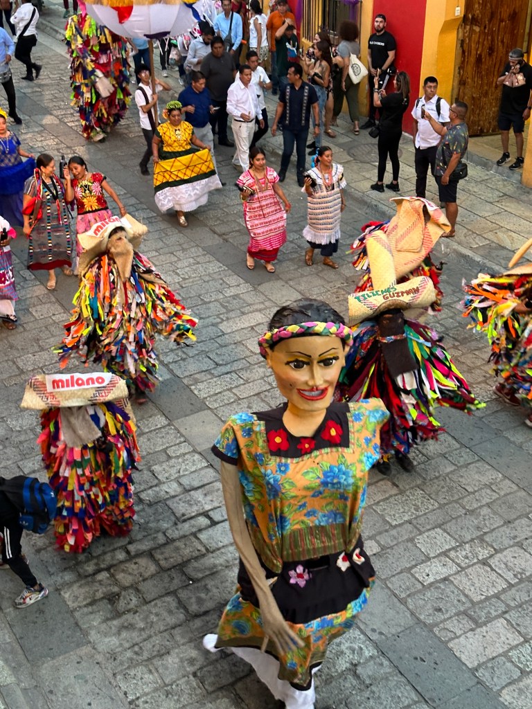 We met Max at a restaurant where she was having breakfast. We then walked to her apartment to look at it and we made our schedule for the week. We walked around the little streets of Centro for a while then had lunch at Casa Taviche. We had the special of the day: a creamy vegetable soup with cheese croutons, peanut chicken with rice and vegetables and guava tiramisu. We also had tamarind agua fresca. All for 145 pesos each ($8.60 usd). After lunch, Pogo went back to the hotel to rest and Max and I did a little shopping. We were supposed to meet Pogo at 4:30pm at the Botanical Gardens but we ran into a parade and one thing led to another, we decided to watch the parade instead. We went to a really cute bar called Selva, rated one of the best 50 in North America. We were lucky to sit on one of the 2 small balconies and witnessed 3 more parades! One was for a school graduation, 2 for weddings and the other one was maybe just because they love parades? They are so colorful and all have monos de calendas (giant puppets) dancing and twirling to the music.