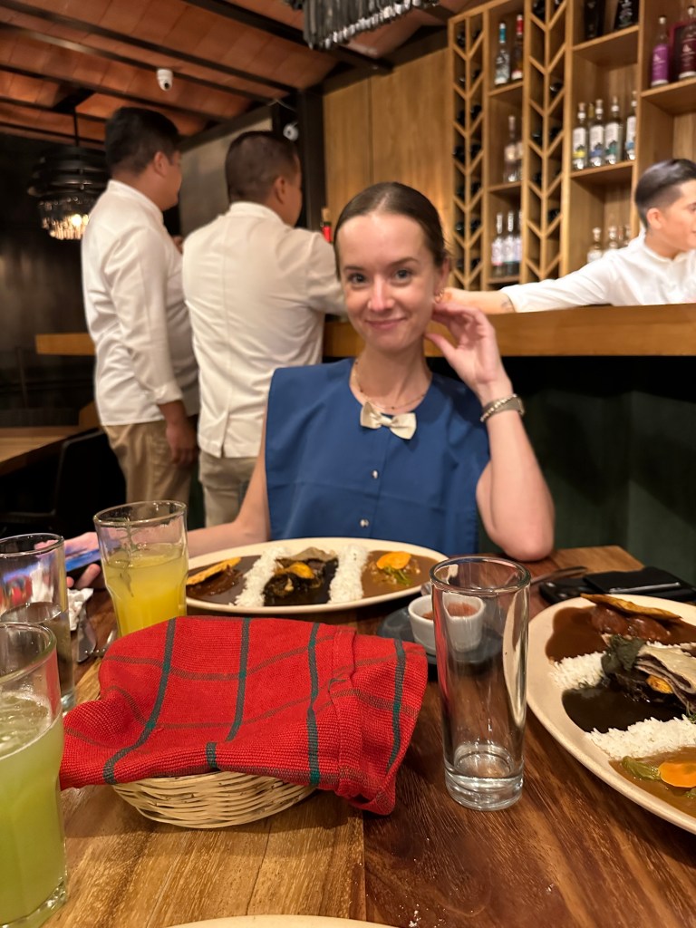 We had dinner at Las Quince Letras and had garnachas for appetizers and chicken with 3 types of mole (chocolate, almond and rojo). They put cute bibs on us to protect our clothings. Very delicious.