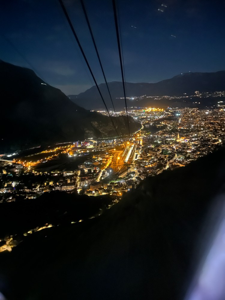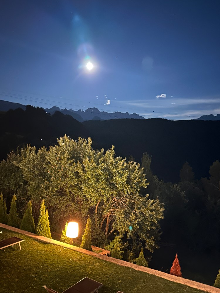 The steep walk back, about 1/2 mile long) was challenging for my knees especially with a full belly. It was really nice to see Bolzano from that high shimmering with all the streetlights and the full moon.