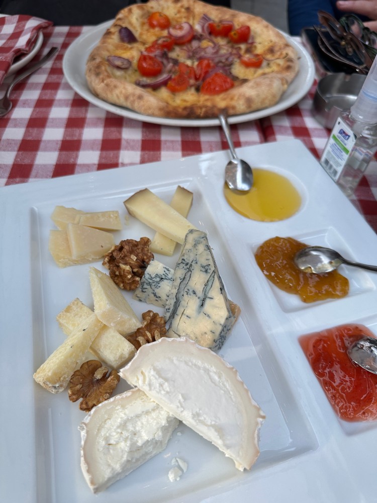 It had started raining when we go out of the bus, so Deidre, Pogo and I stopped at a cafe on our way home and had a glass of wine and shared a pizza while Derrick went to take a nap, ahead of a phone meeting he was having at 4pm.