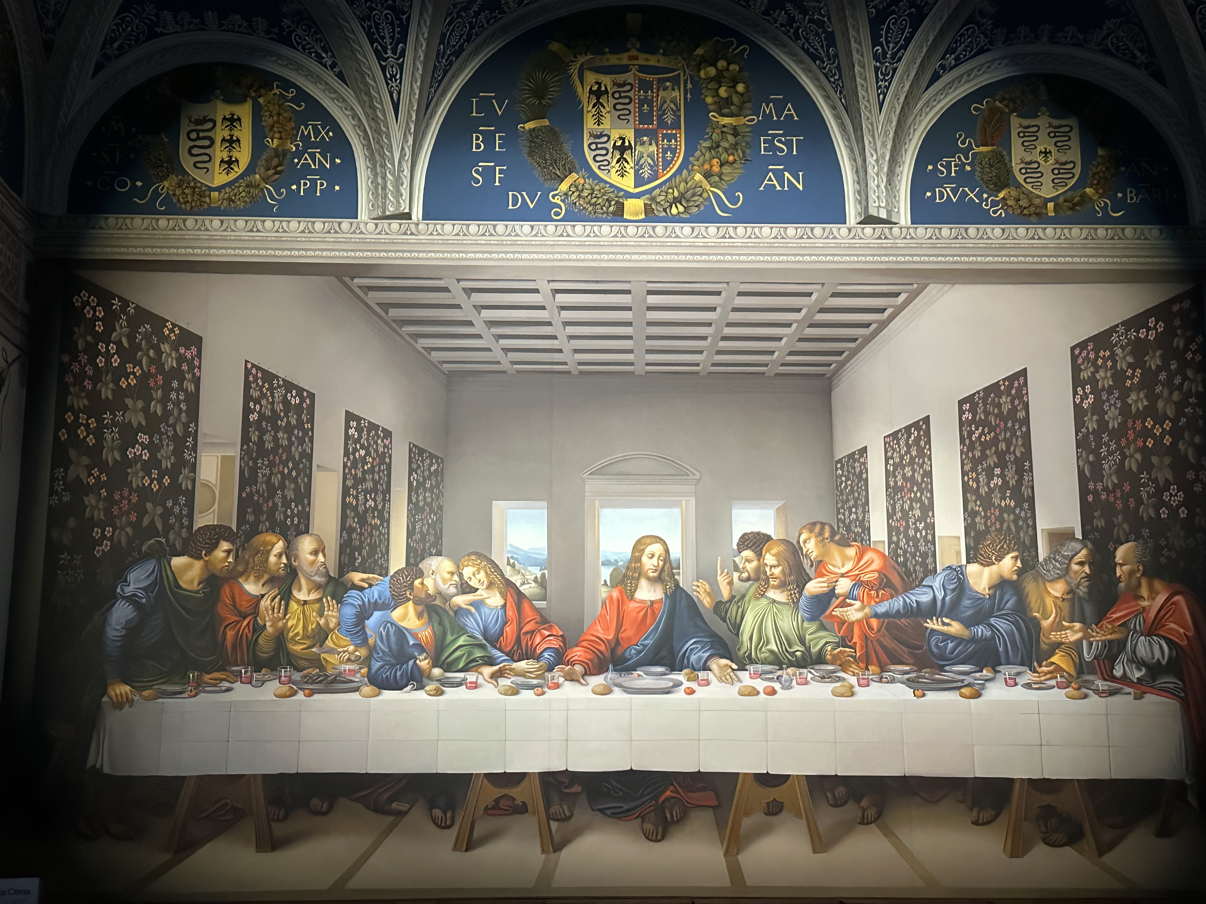 The next morning, my knee felt a lot better so maybe that medicinal pad worked. Deidre and I walked to a small cafe for breakfast while the boys were biking. They met us at Galleria Milan, a covered shopping area with mosaic tile floors and Italian designer boutiques. We visited the Leonardo3 Museum where we found 3D reproductions of some of Leonardo Da Vinci’s most famous drawings and plans. They also had explanation on how he painted the Last Supper and the Mona Lisa, among other masterpieces. Since we couldn’t get tickets to see the real Last Supper in person, it was second best.
